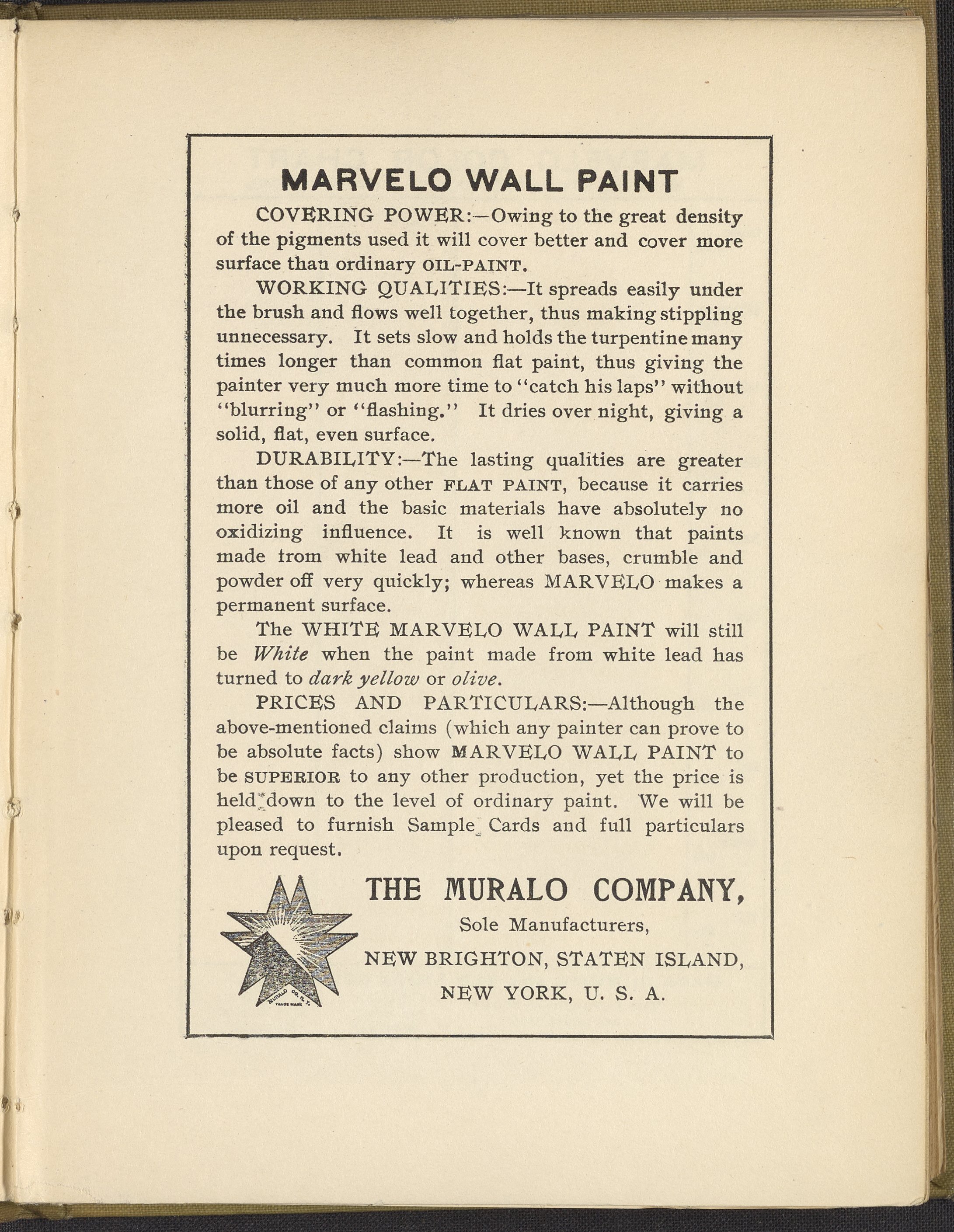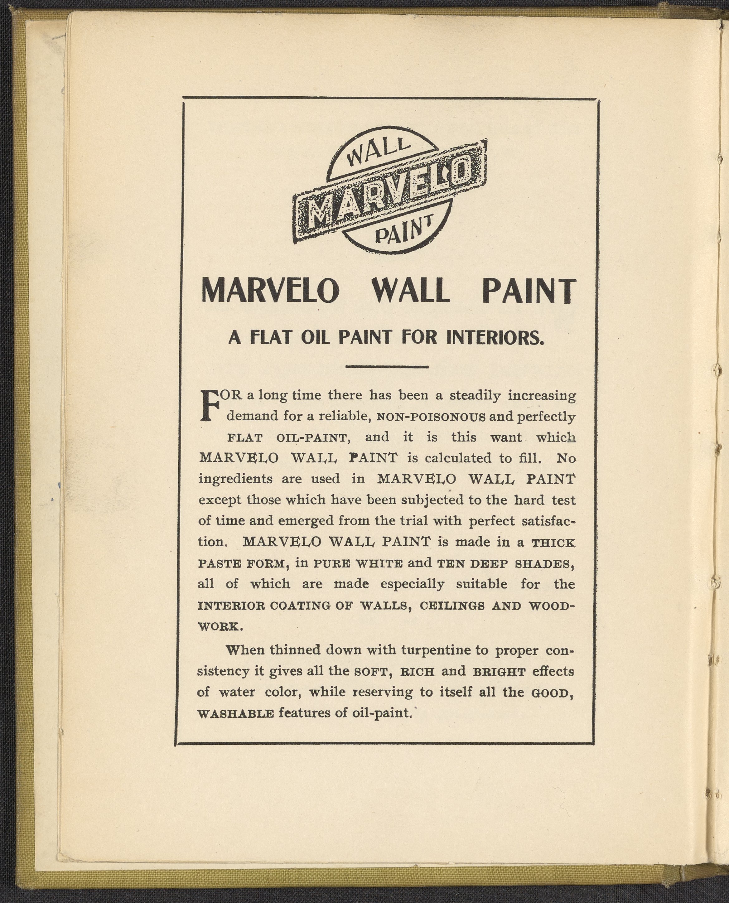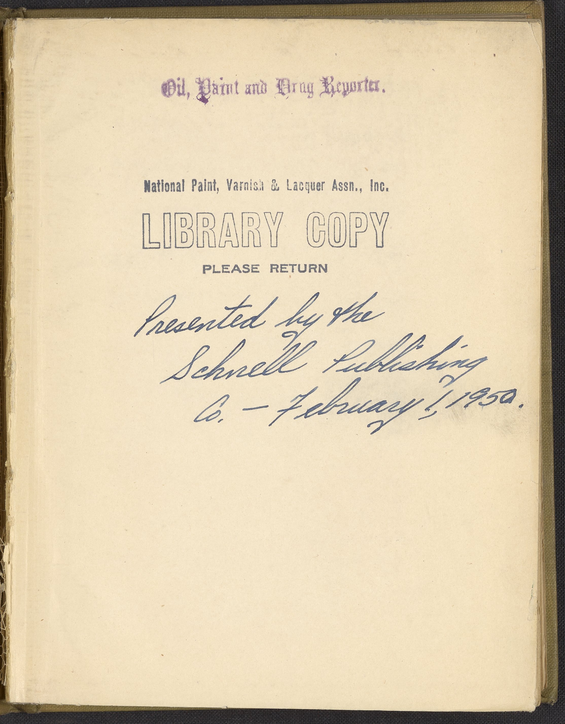 Small JPG1200 x 1535px — 521 KBFull-sized JPG2278 x 2914px — 1.6 MBOriginal fileTIFF — 2278 x 2914px — 19.1 MBVolume describes the properties, varieties, and application process of calcimine wall color treatment. The work includes color plates showing color relationships, Calcimo brand wall colors for sale from the Muralo company, and decorative schemes. The frontispiece depicts a black-and-white portrait of the author. Work is digitized in its entirety.