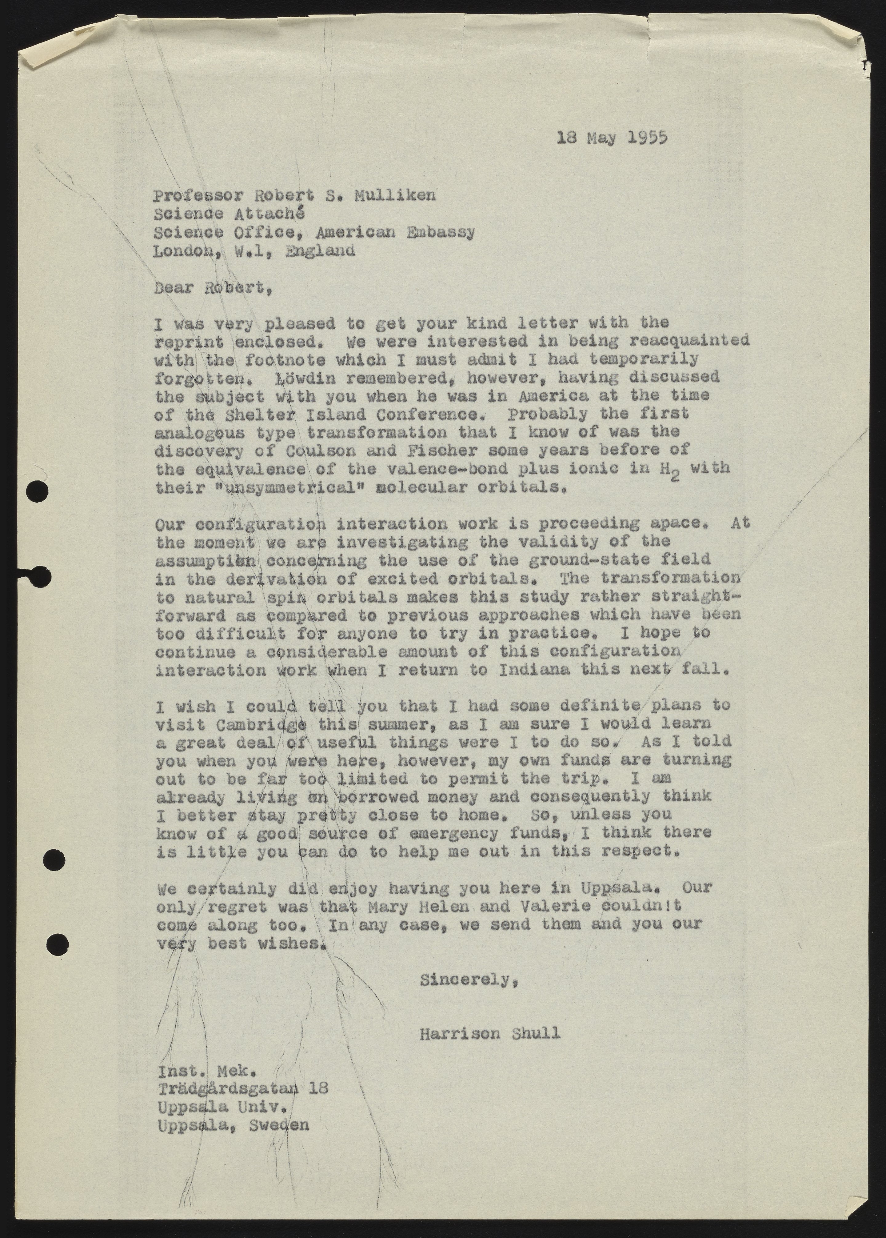 Shull, Harrison. “Letter from Harrison Shull to Robert S. Mulliken, 1955,” May 18, 1955. Robert S. Mulliken & Harrison Shull Correspondence, Box 1. Science History Institute. Philadelphia. https://digital.sciencehistory.org/works/gb19f587n.
