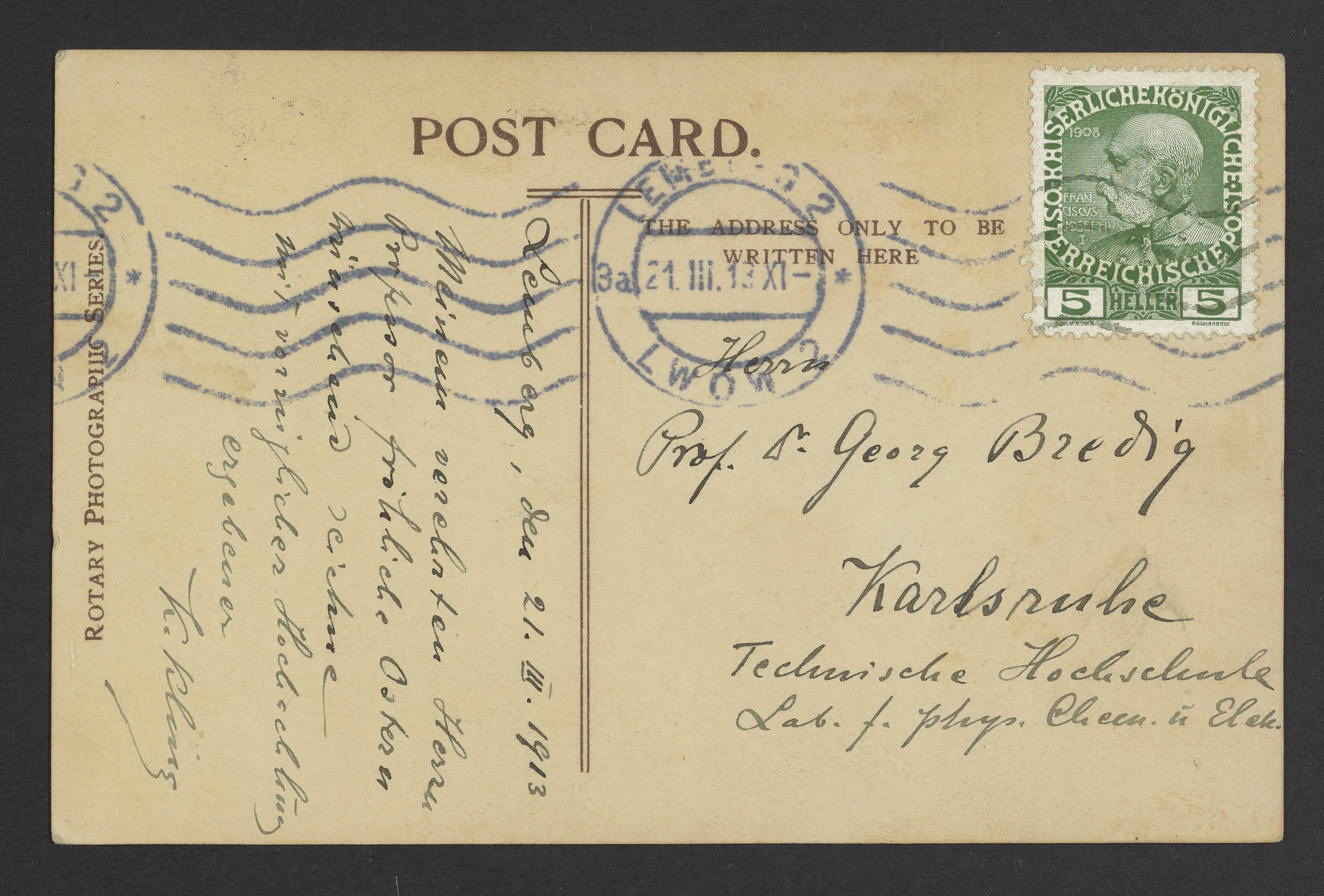 “Postcard of William Thomson Sent to Georg Bredig,” March 21, 1913. Papers of Georg and Max Bredig, Box 22. Science History Institute. Philadelphia. https://digital.sciencehistory.org/works/gdylyij.