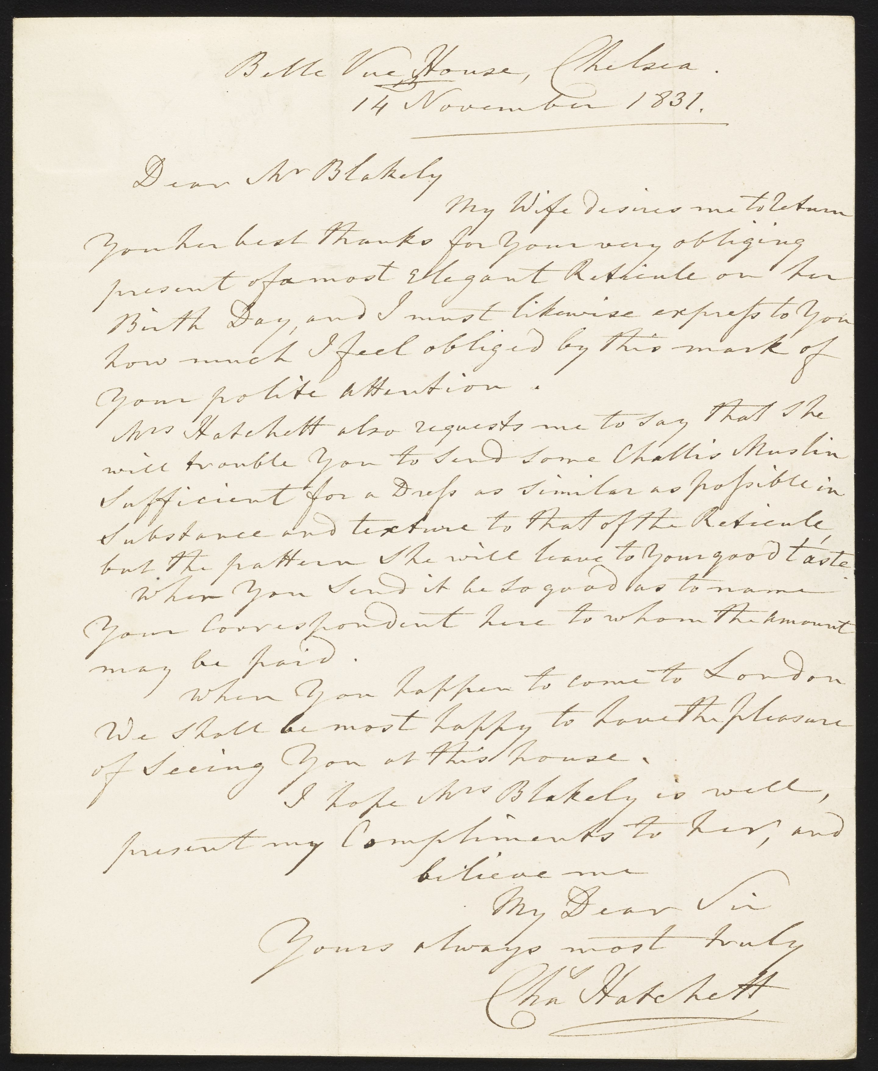 Letter from Charles Hatchett to Edward Blakely