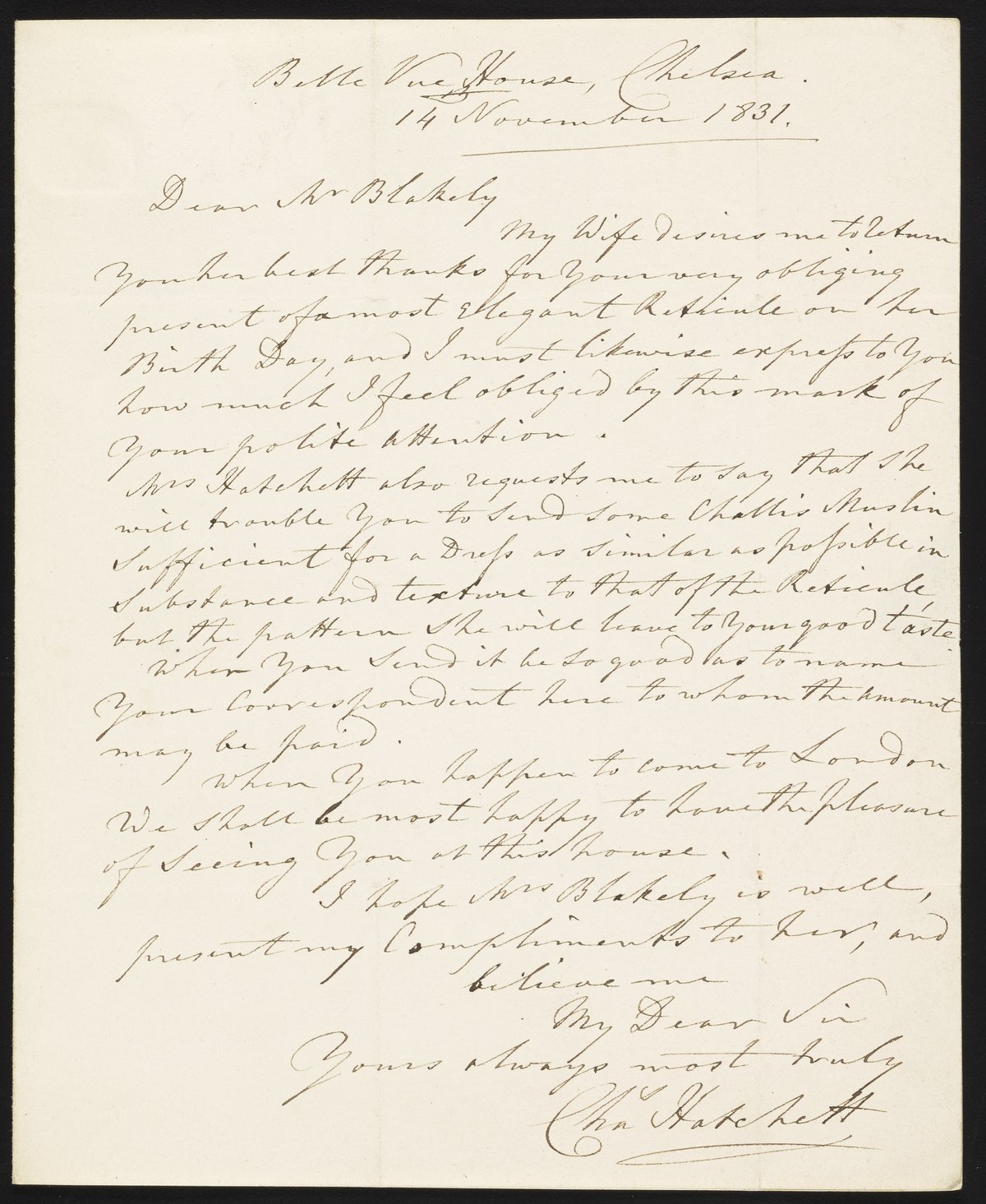 Hatchett, Charles. “Letter from Charles Hatchett to Edward Blakely,” November 14, 1831. Szymanowitz Autographed Letter Collection, Box 1. Science History Institute. Philadelphia. https://digital.sciencehistory.org/works/gf06g2664.