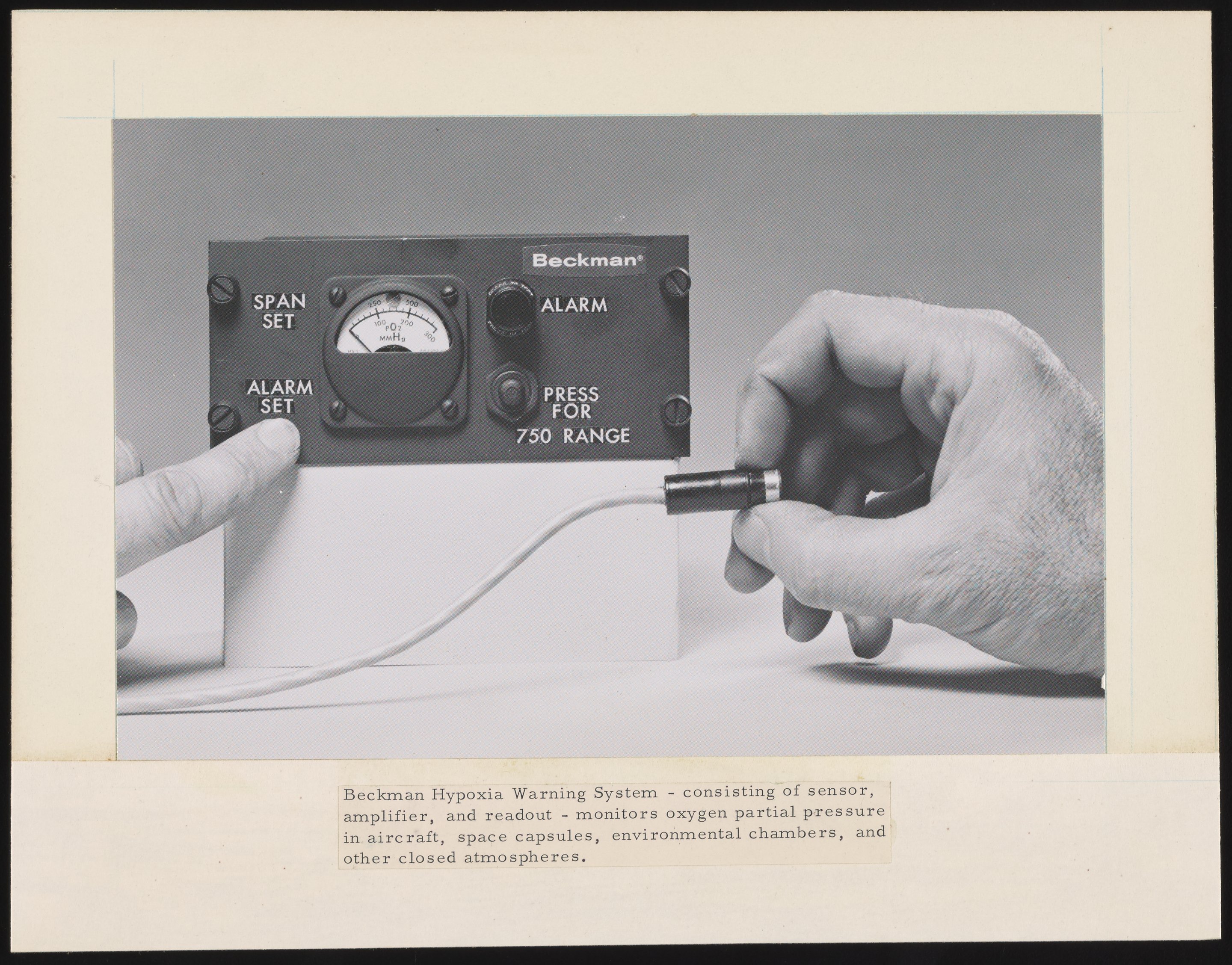 The mounted photograph is captioned: "Beckman Hypoxia Warning System - consisting of sensor, amplifier, and readout - monitors oxygen partial pressure in aircraft, space capsules, environmental chambers, and other closed atmospheres." The image of the sensor bears the stamp "14TAD351-2" on the reverse.