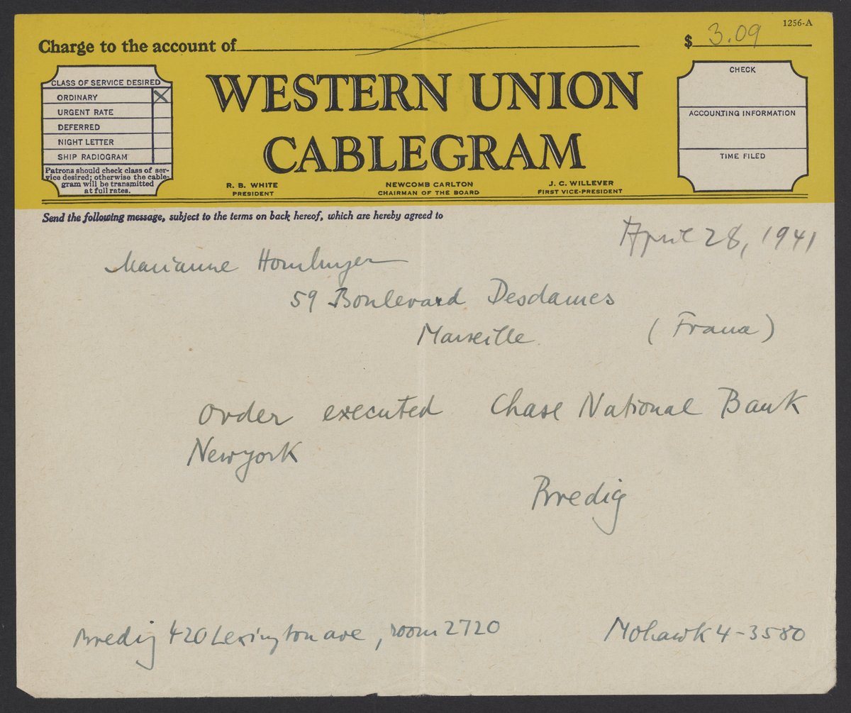 Cablegram from Max Bredig to Marianne Homburger, April 28, 1941