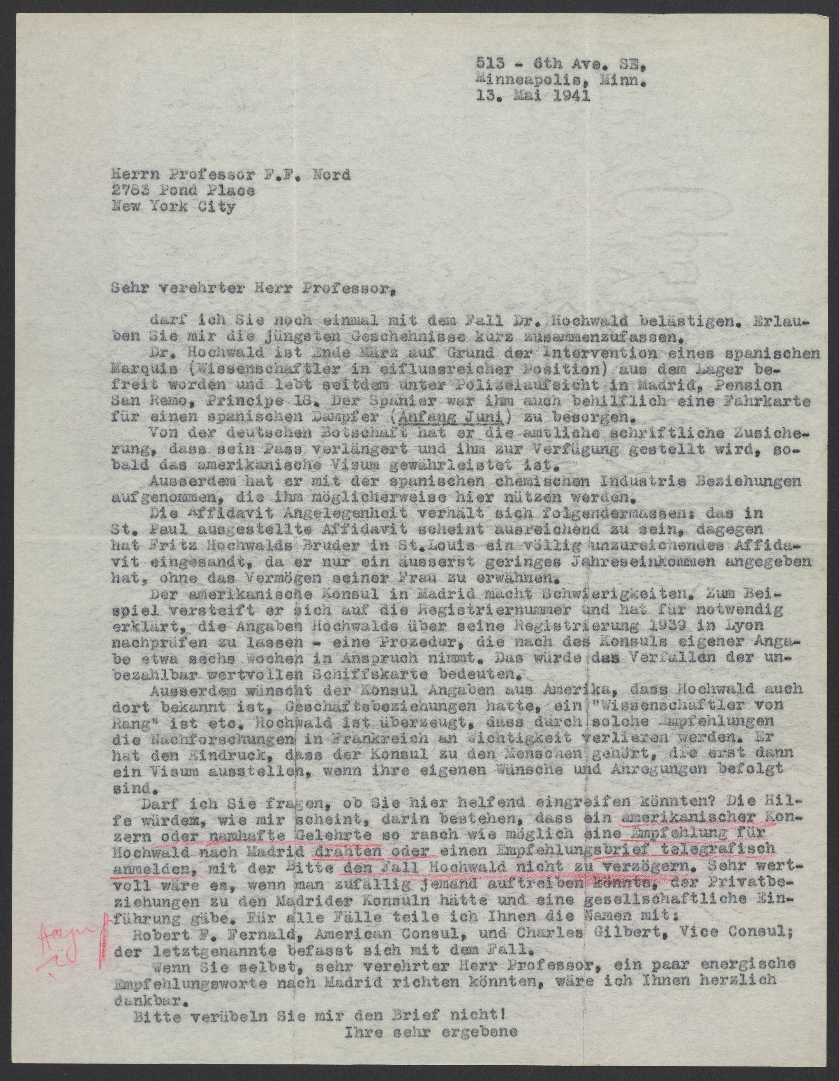 Ausserdem wünscht der Konsul Angaben aus Amerika, dass Hochwald auch dort bekannt ist, Geschäftsbeziehungen hatte, ein "Wissenschaftler von Rang" ist etc. Hochwald ist überzeugt, dass durch solche Empfehlungen die Nachforschungen in Frankreich an Wichtigkeit verlieren werden. Er hat den Eindruck, dass der Konsul zu den Menschen gehört, die erst dann ein Visum ausstellen, wenn ihre eigenen Wünsche und Anregungen befolgt sind.