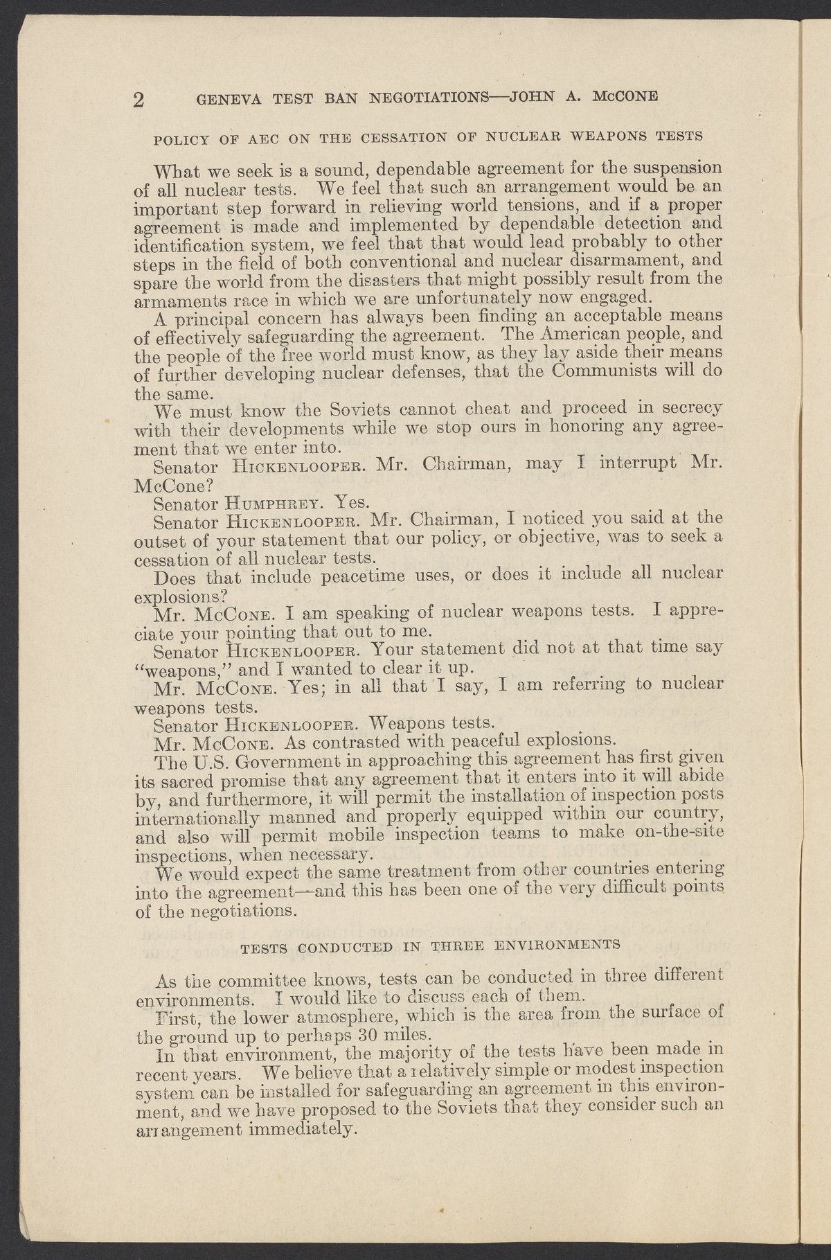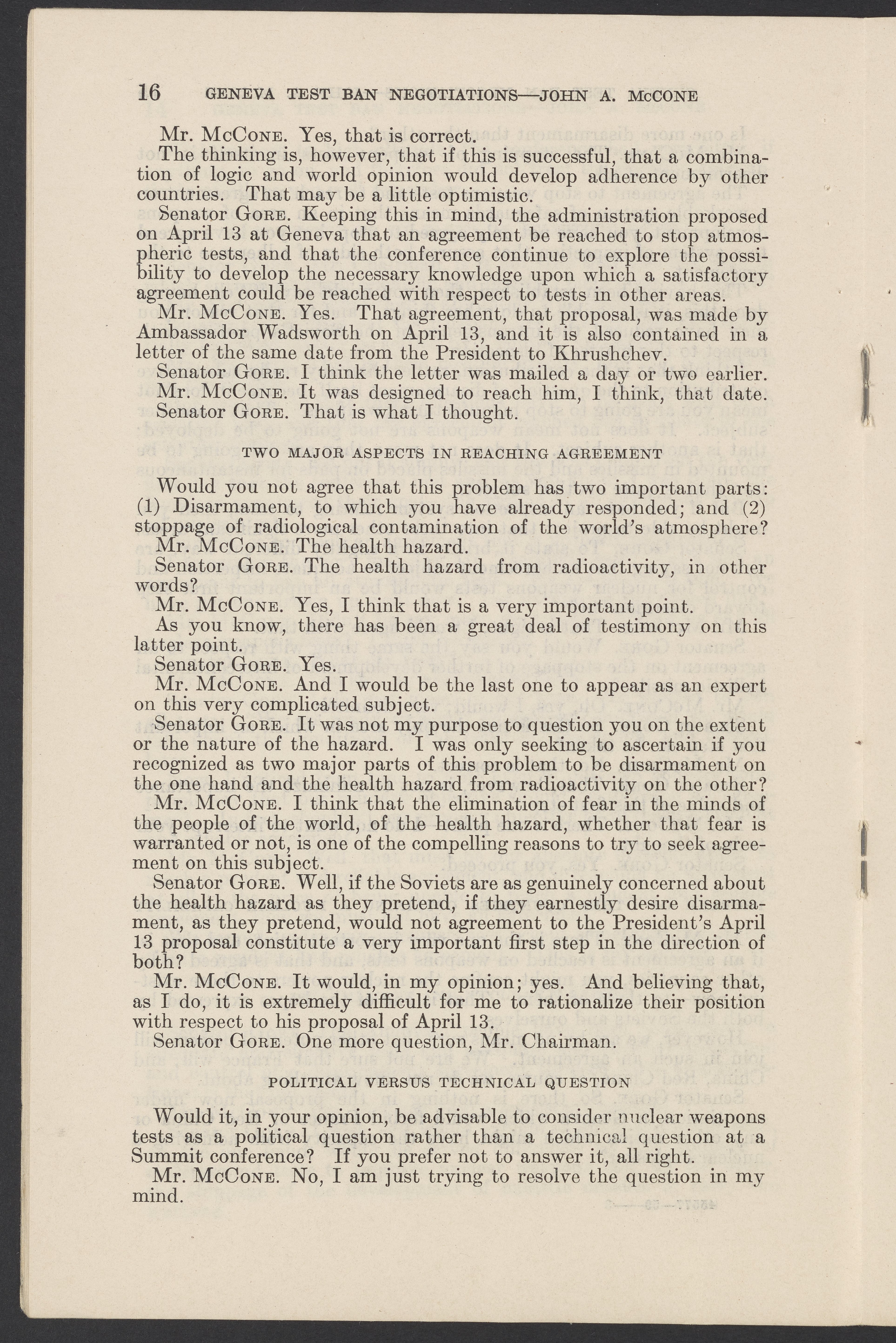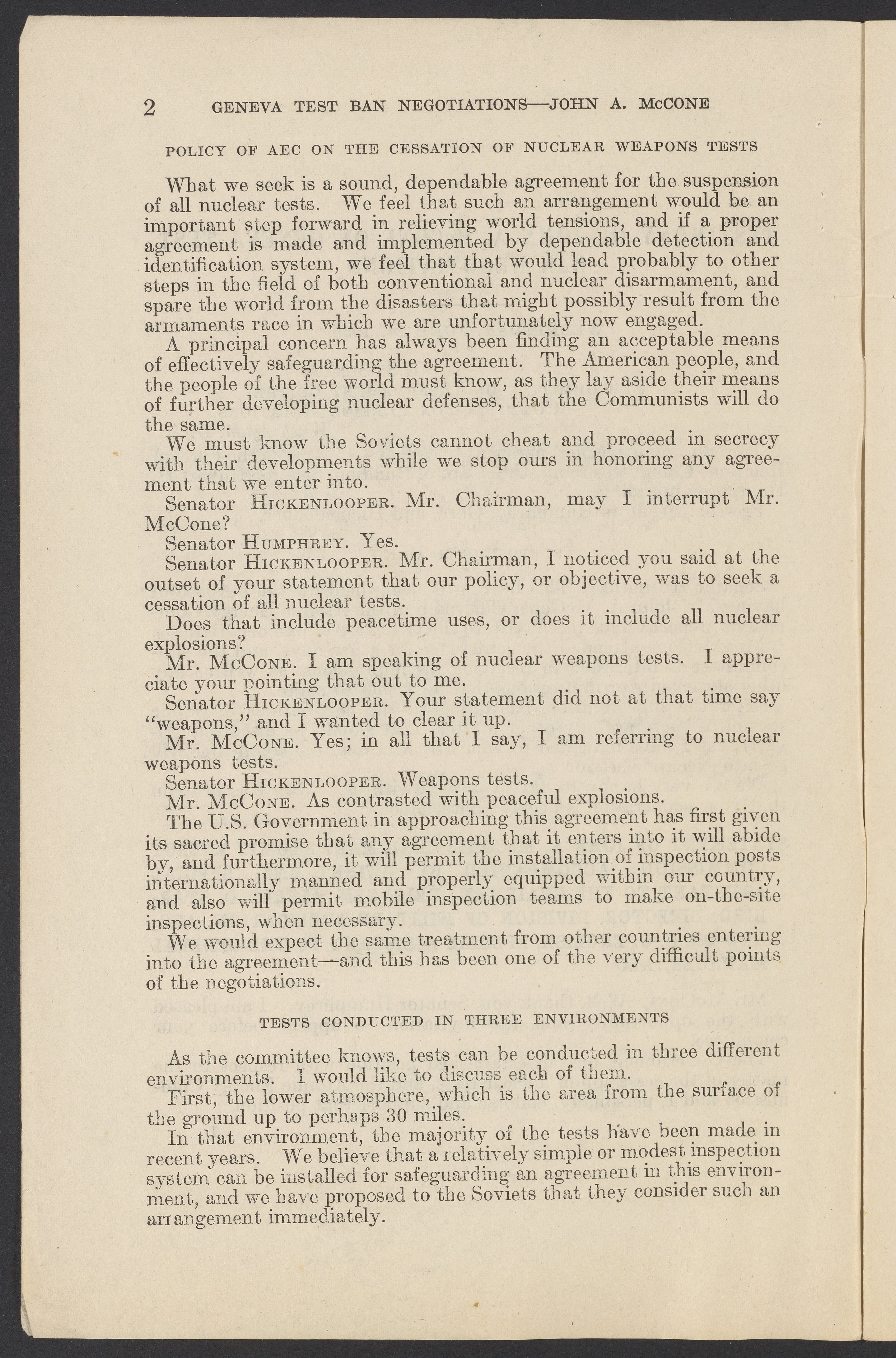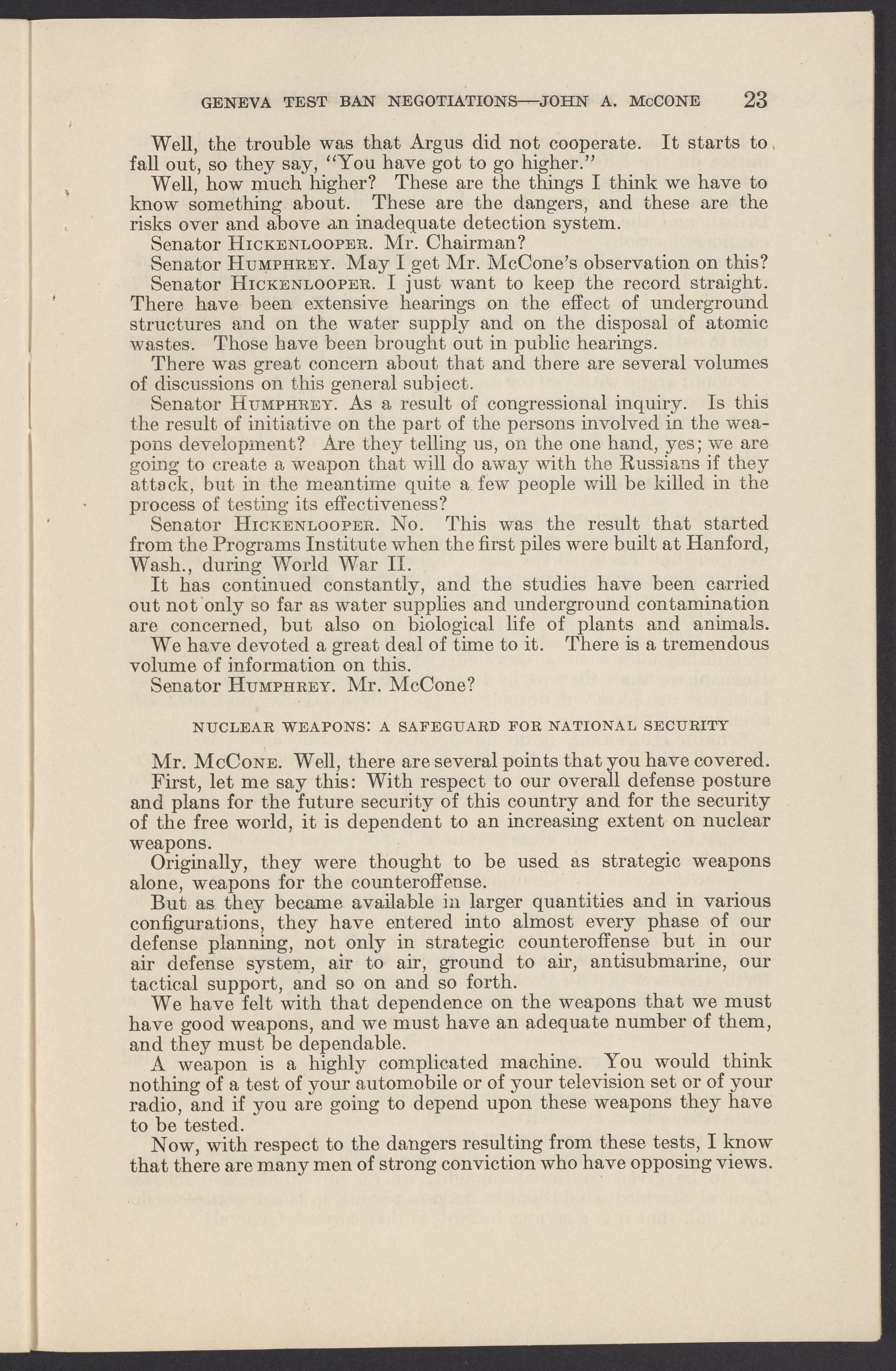 Small JPG1200 x 1831px — 279 KBLarge JPG2880 x 4394px — 1.5 MBFull-sized JPG3774 x 5758px — 2.4 MBOriginal fileTIFF — 3774 x 5758px — 62.2 MBTestimony of John A. McCone (1902-1991), chair of the Atomic Energy Commission (AEC), on Geneva test ban negotiation, given in hearing before the Subcommittee on Disarmament of the Committee on Foreign Relations, United States Senate.