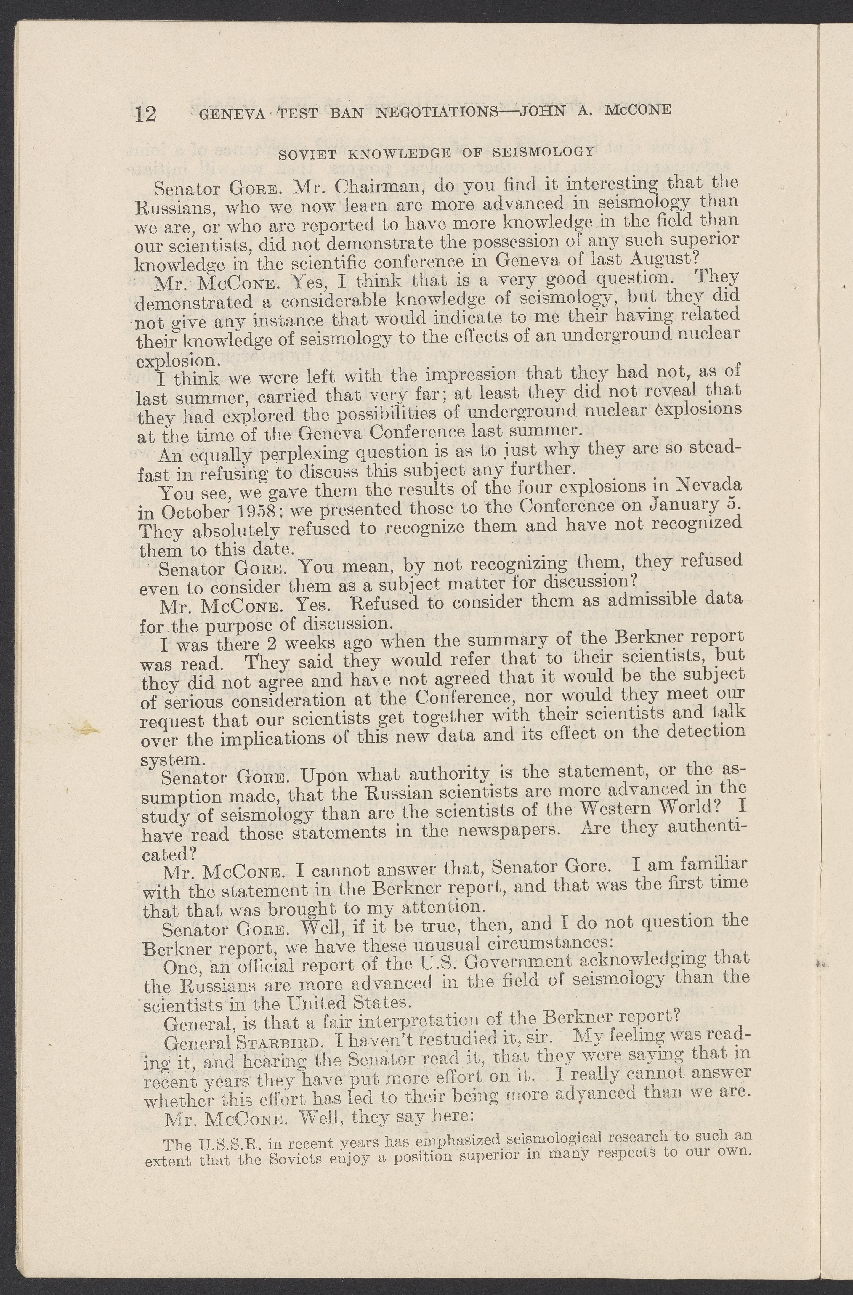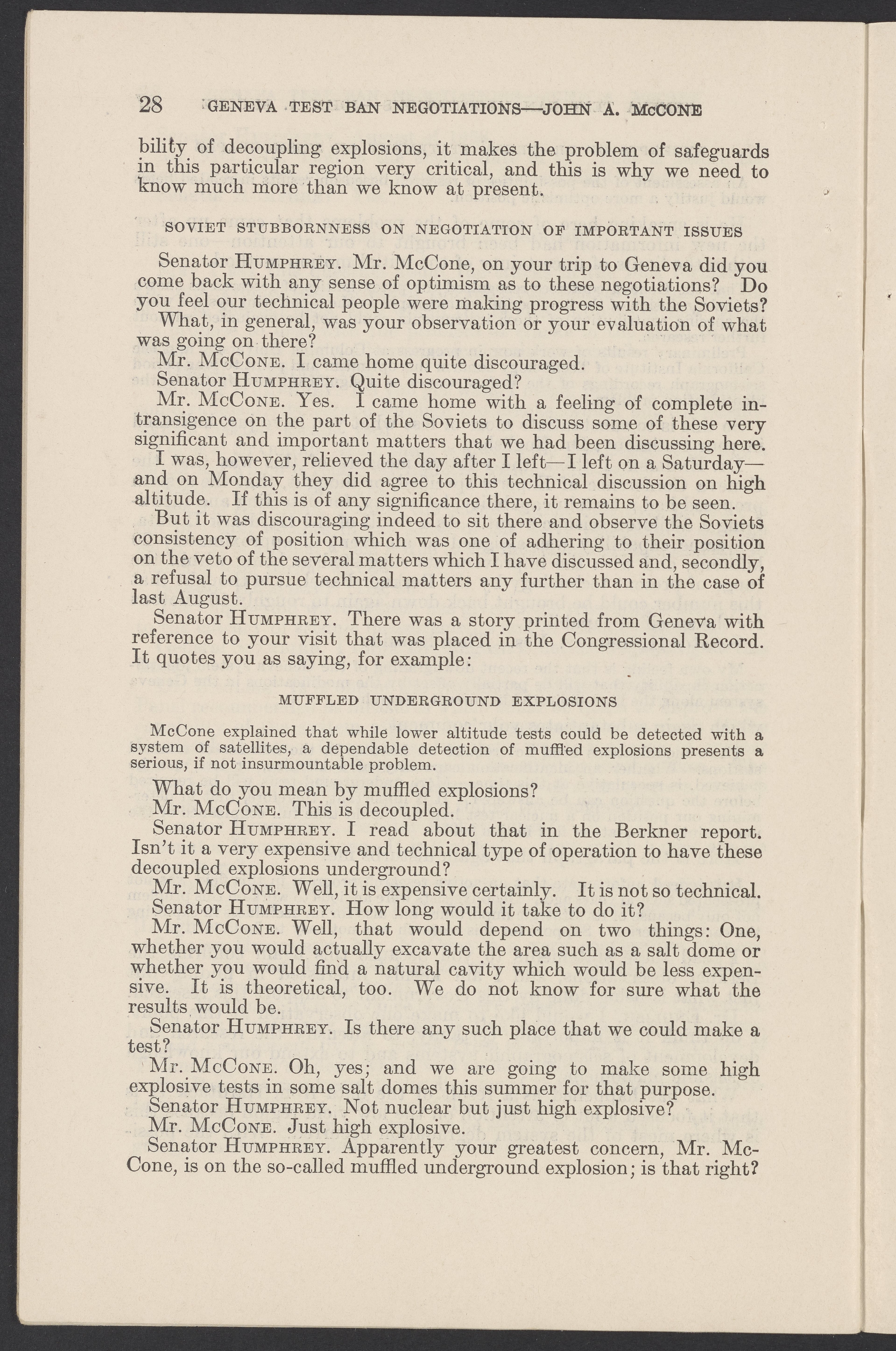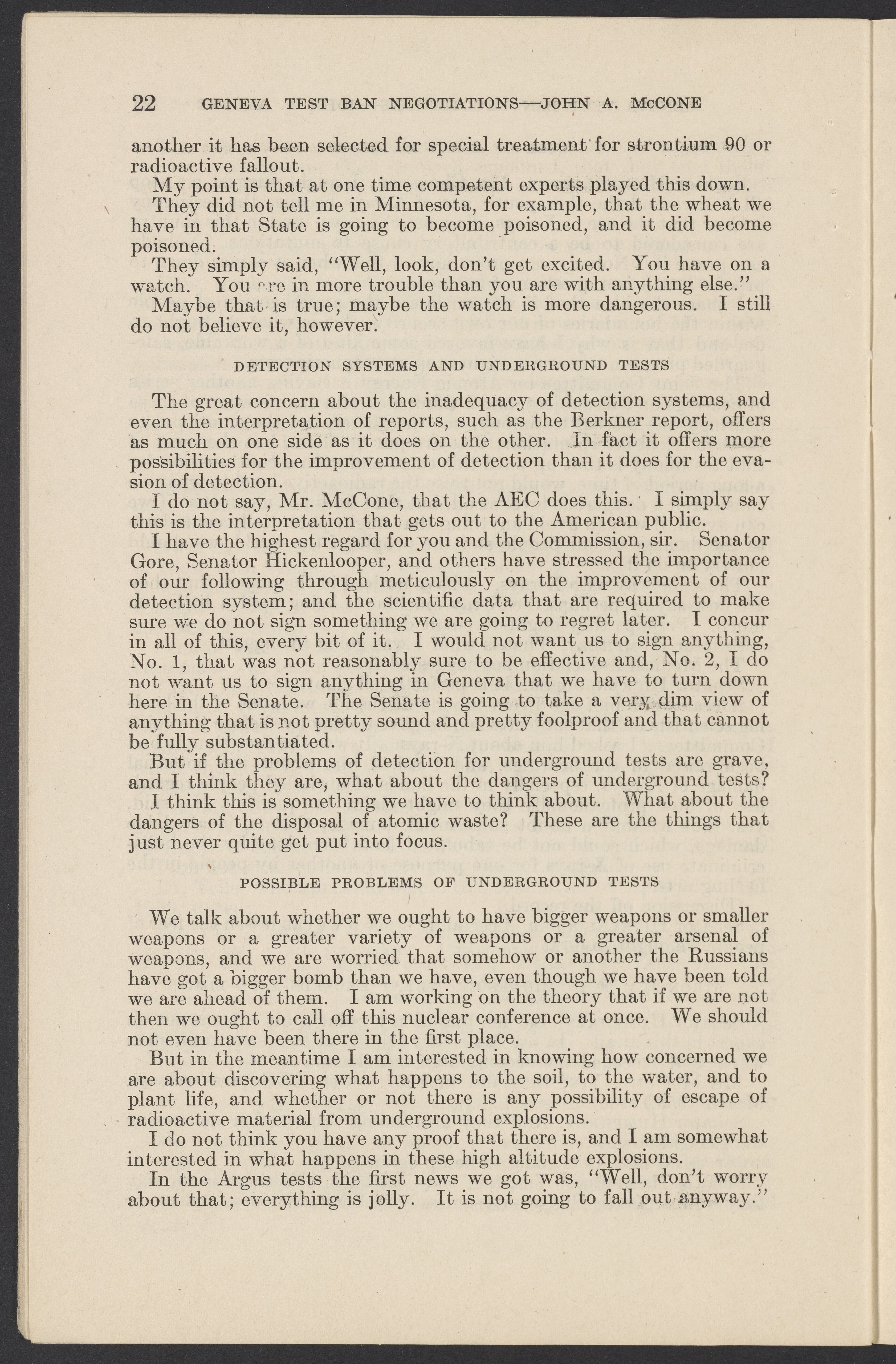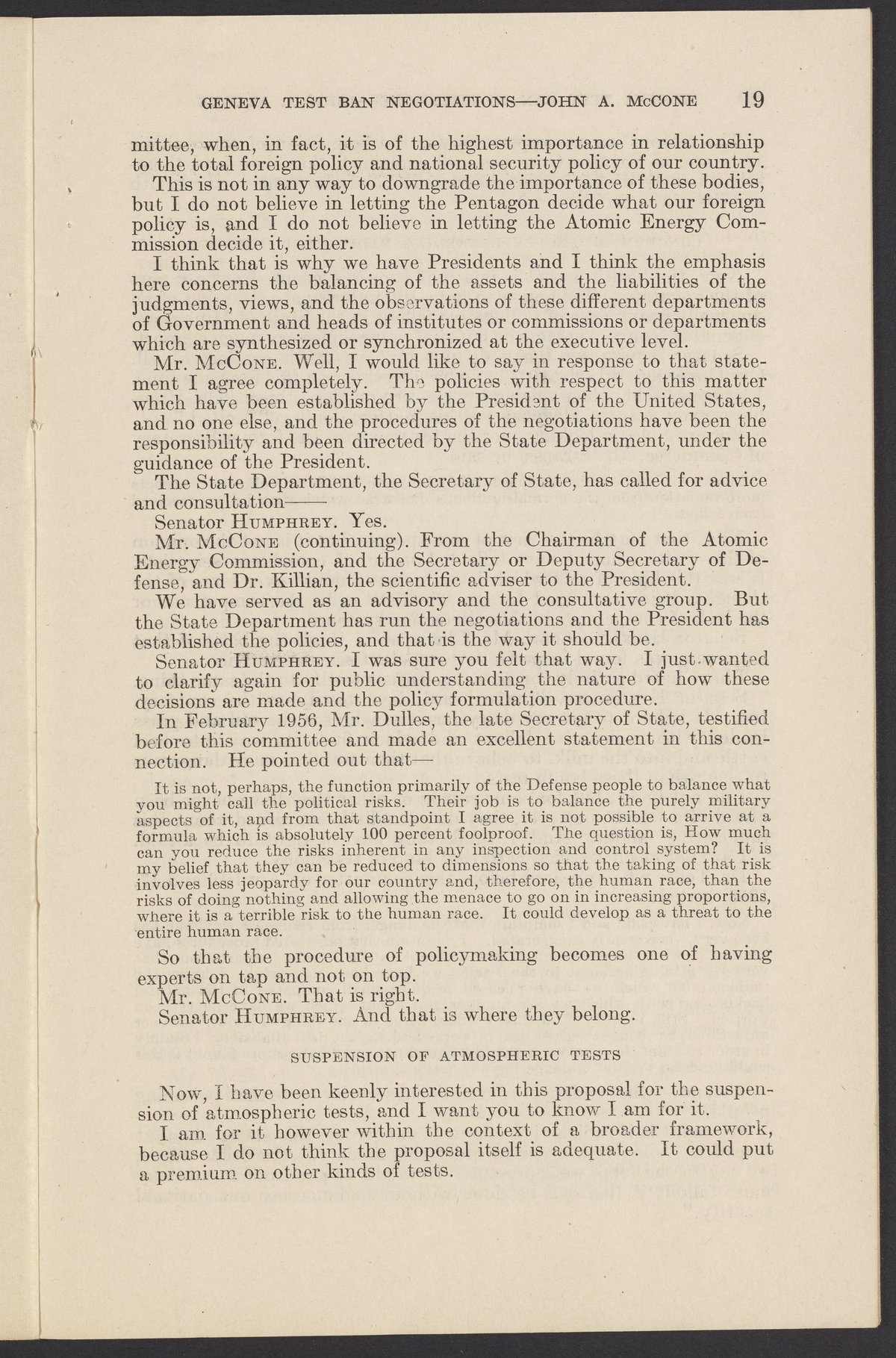 Small JPG1200 x 1831px — 279 KBLarge JPG2880 x 4394px — 1.5 MBFull-sized JPG3774 x 5758px — 2.4 MBOriginal fileTIFF — 3774 x 5758px — 62.2 MBTestimony of John A. McCone (1902-1991), chair of the Atomic Energy Commission (AEC), on Geneva test ban negotiation, given in hearing before the Subcommittee on Disarmament of the Committee on Foreign Relations, United States Senate.