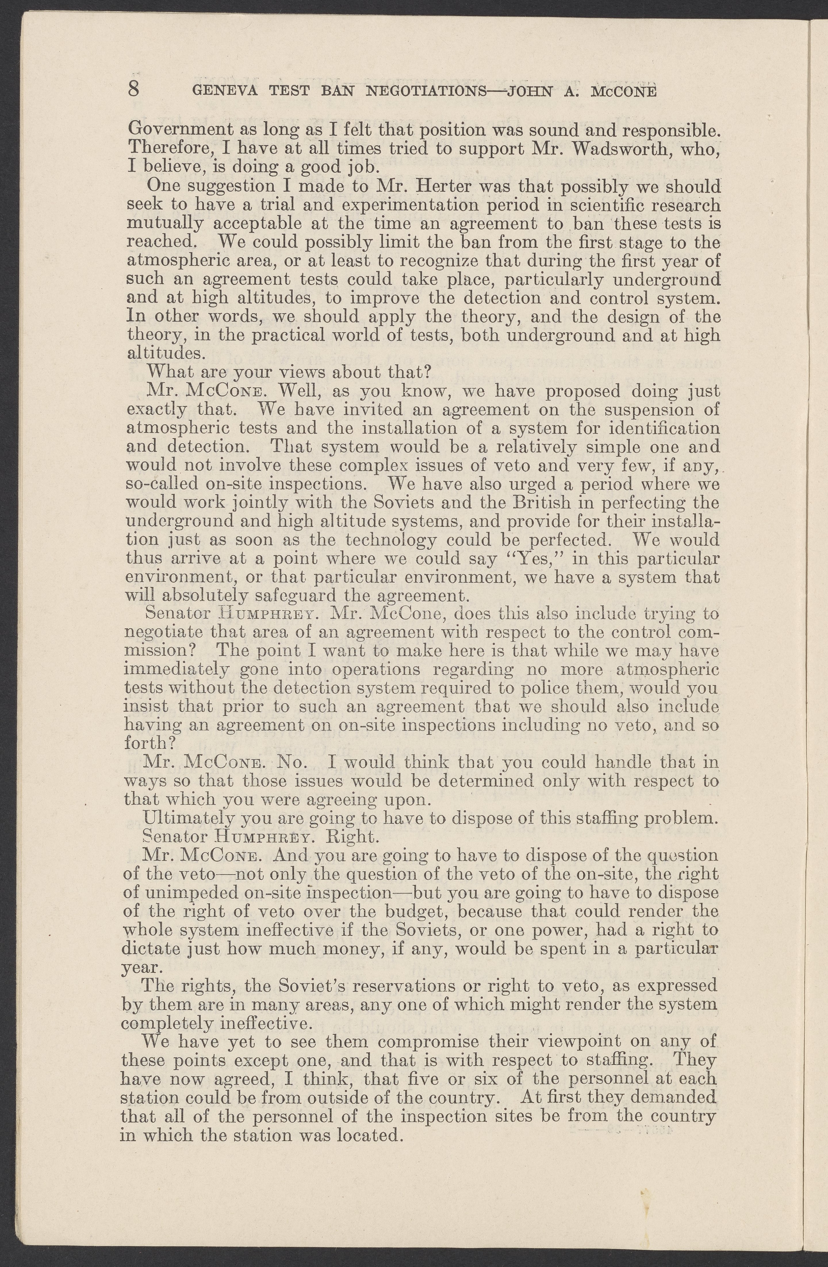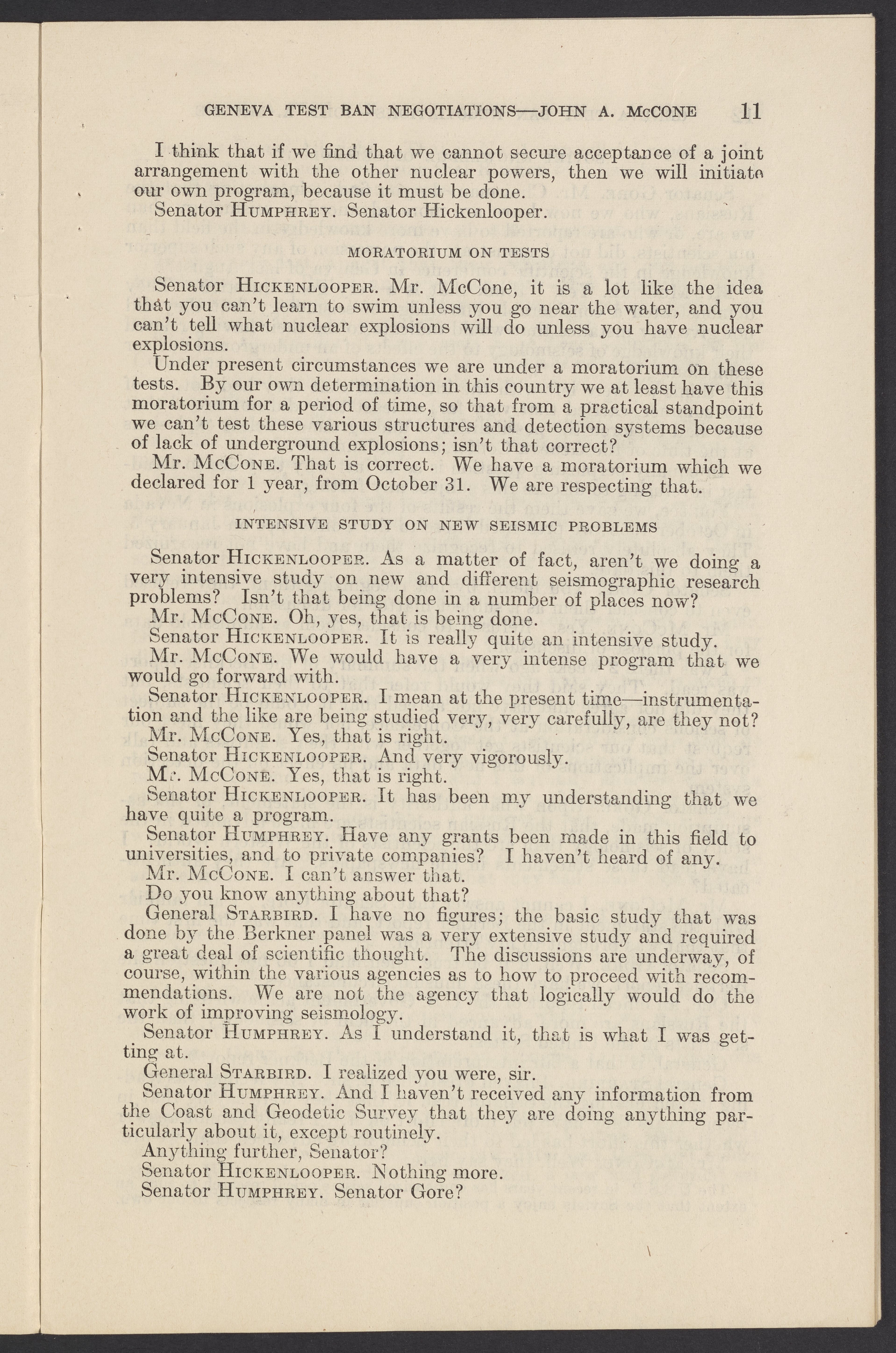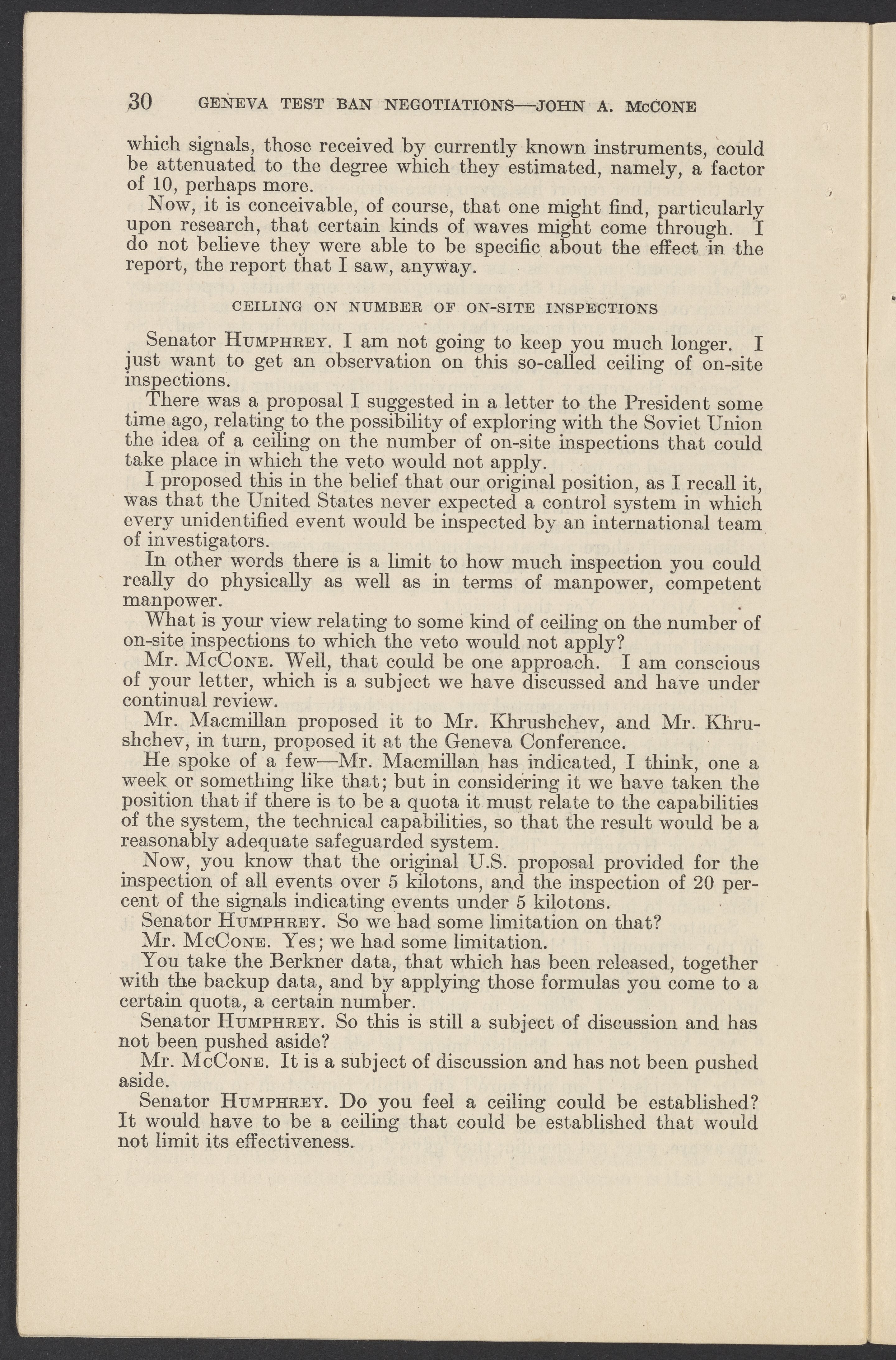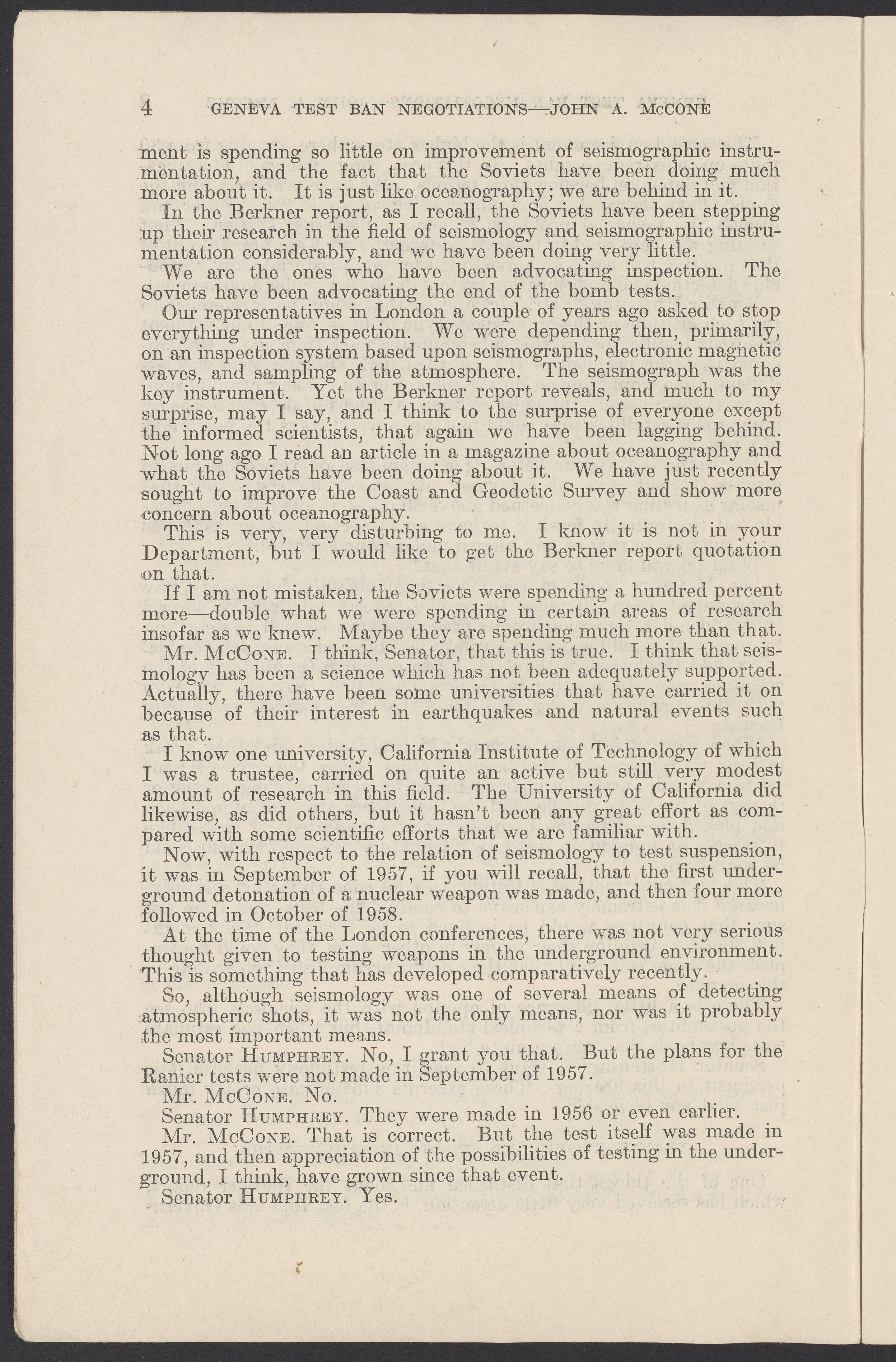 Small JPG1200 x 1831px — 279 KBLarge JPG2880 x 4394px — 1.5 MBFull-sized JPG3774 x 5758px — 2.4 MBOriginal fileTIFF — 3774 x 5758px — 62.2 MBTestimony of John A. McCone (1902-1991), chair of the Atomic Energy Commission (AEC), on Geneva test ban negotiation, given in hearing before the Subcommittee on Disarmament of the Committee on Foreign Relations, United States Senate.