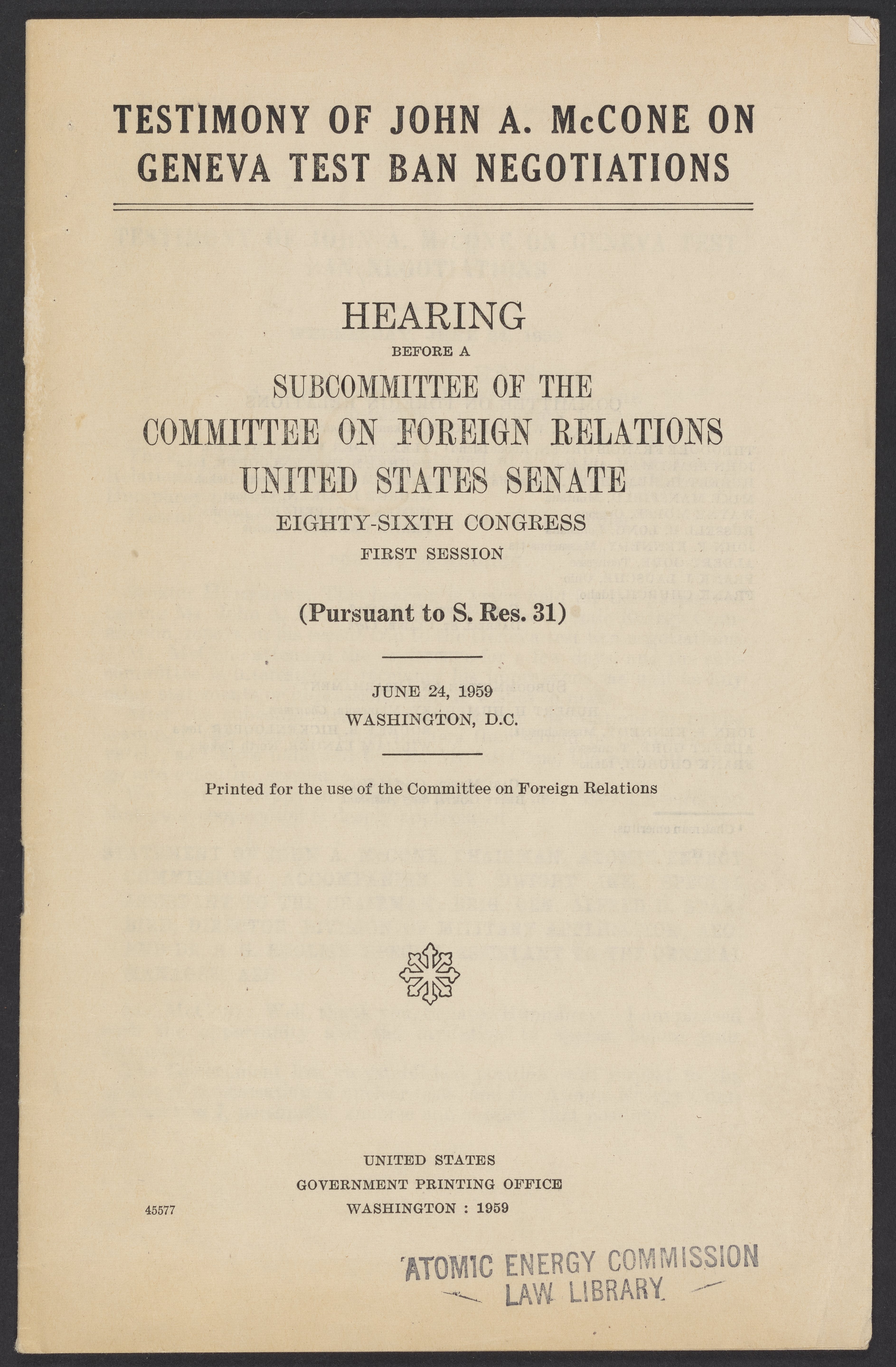“Testimony of John A. McCone on Geneva Test Ban Negotiations.” United States. Government Printing Office., June 24, 1959. Papers of Spofford Grady English, Box 1, Folder 27. Science History Institute. Philadelphia. https://digital.sciencehistory.org/works/gg866h9.