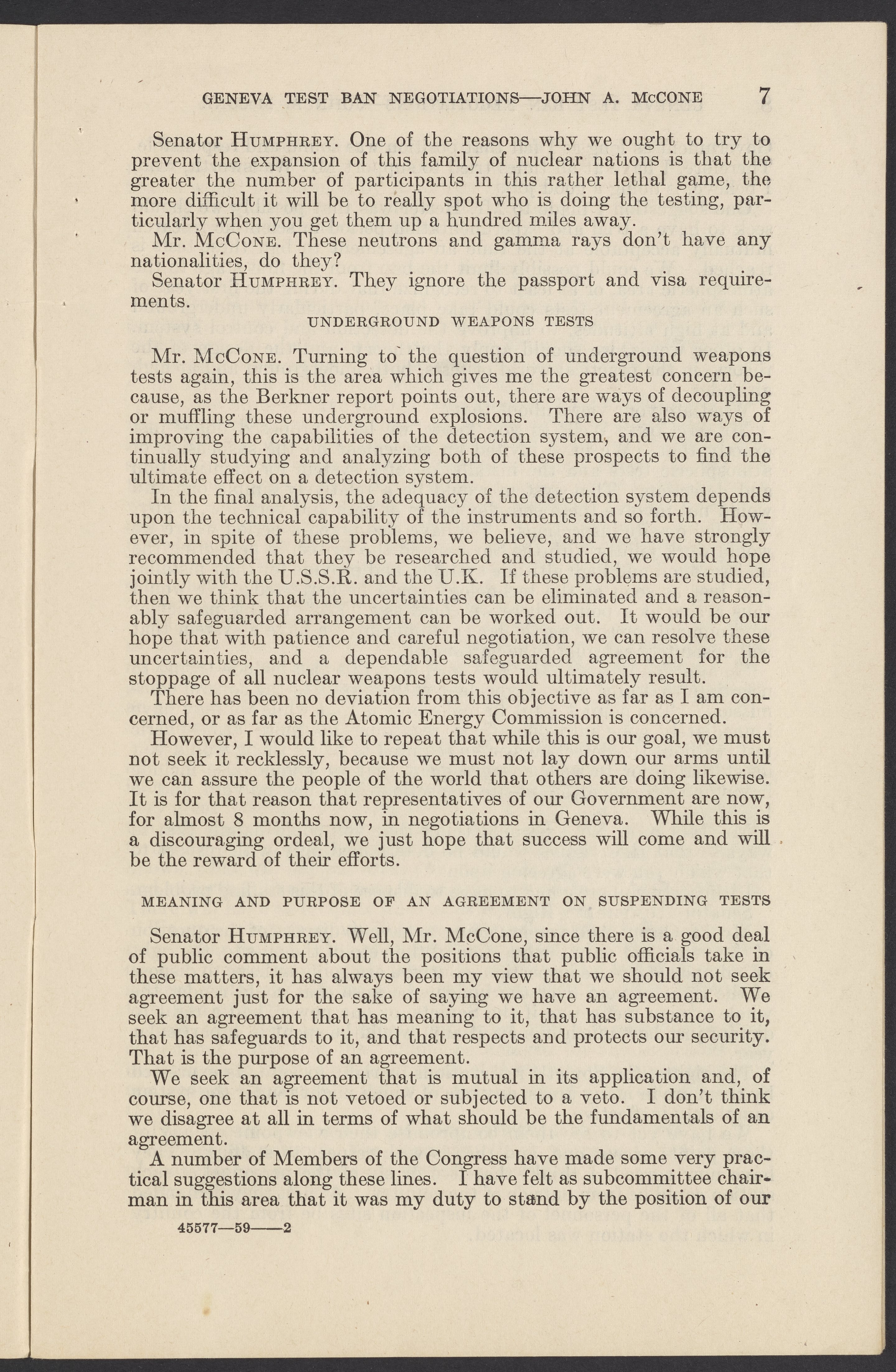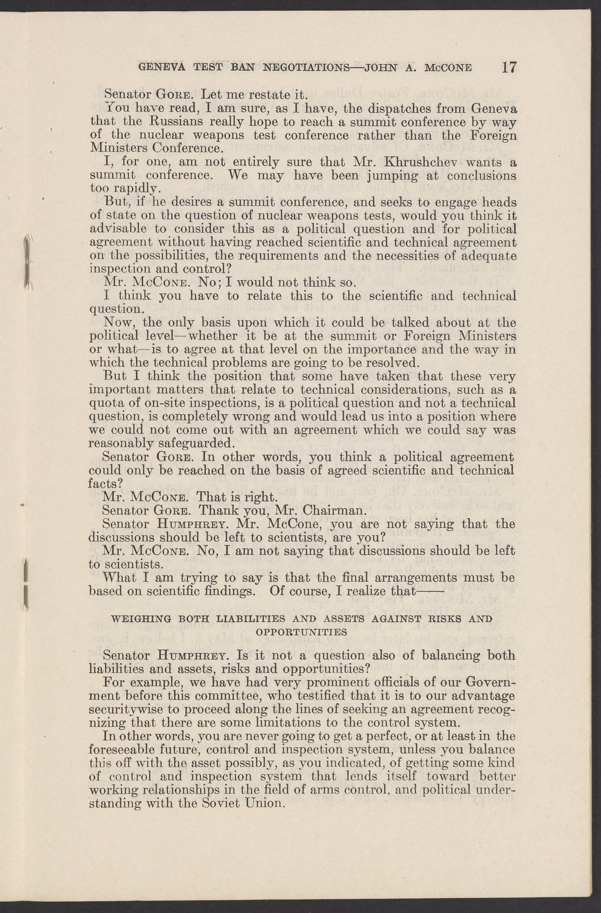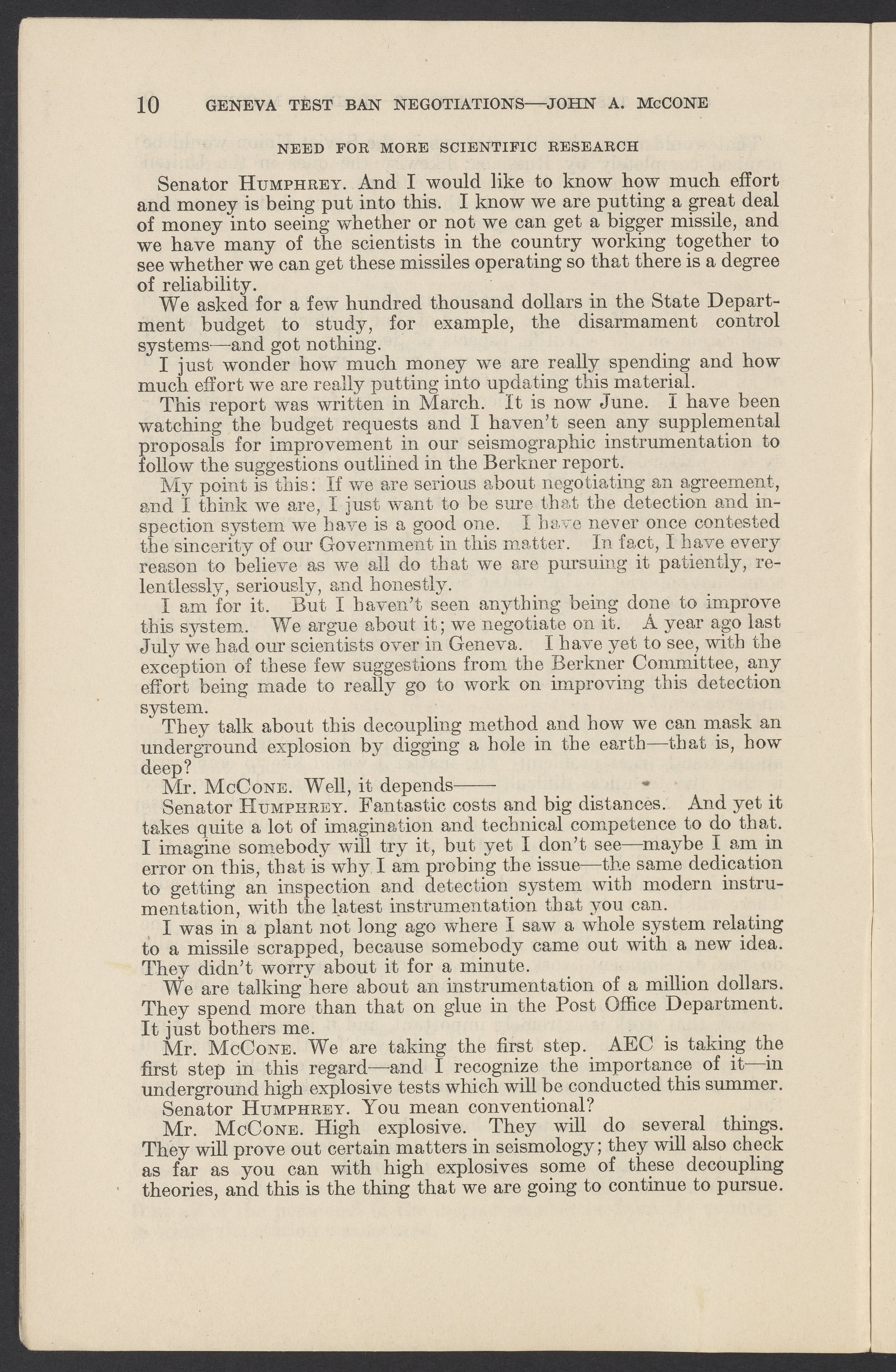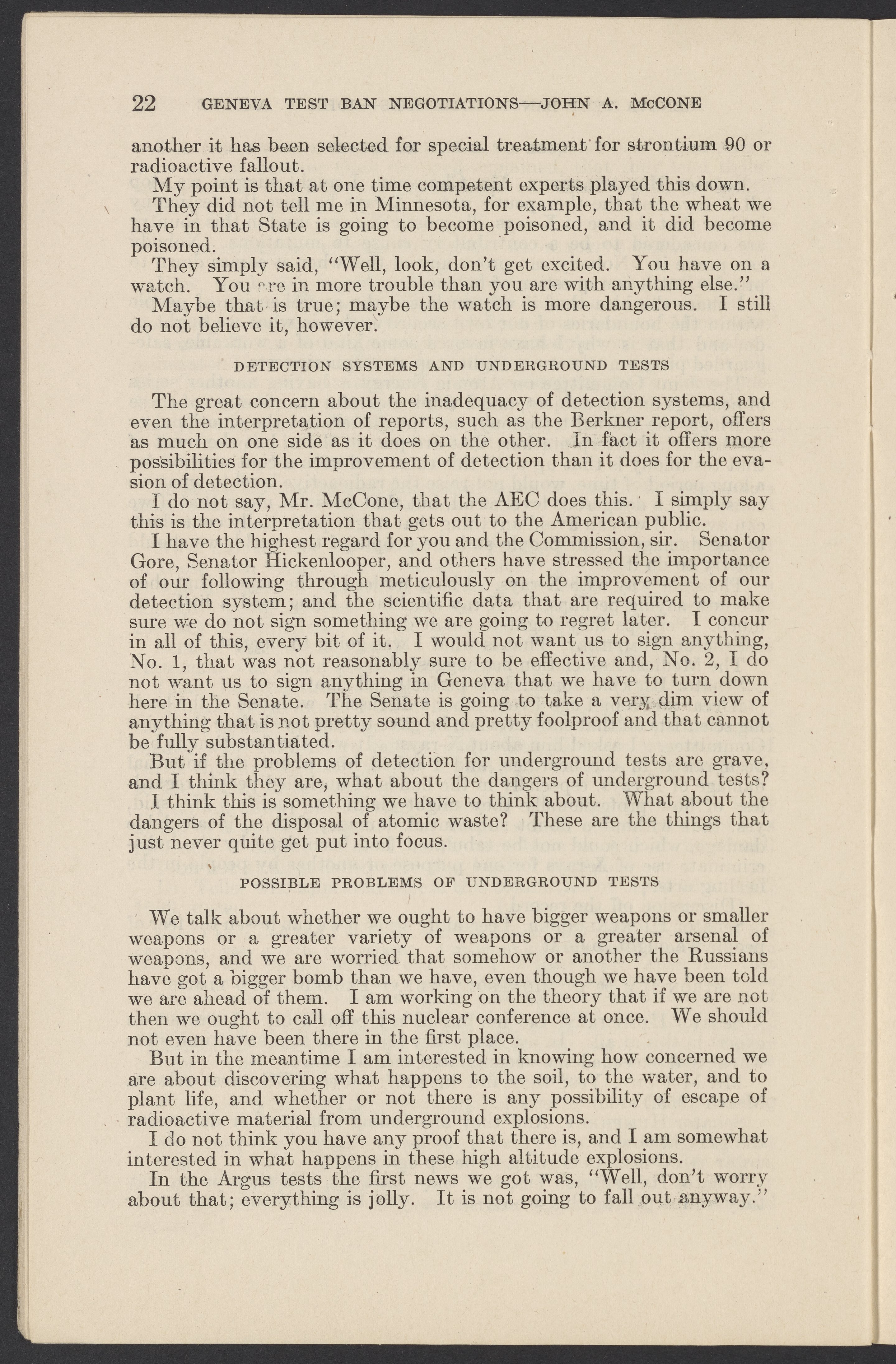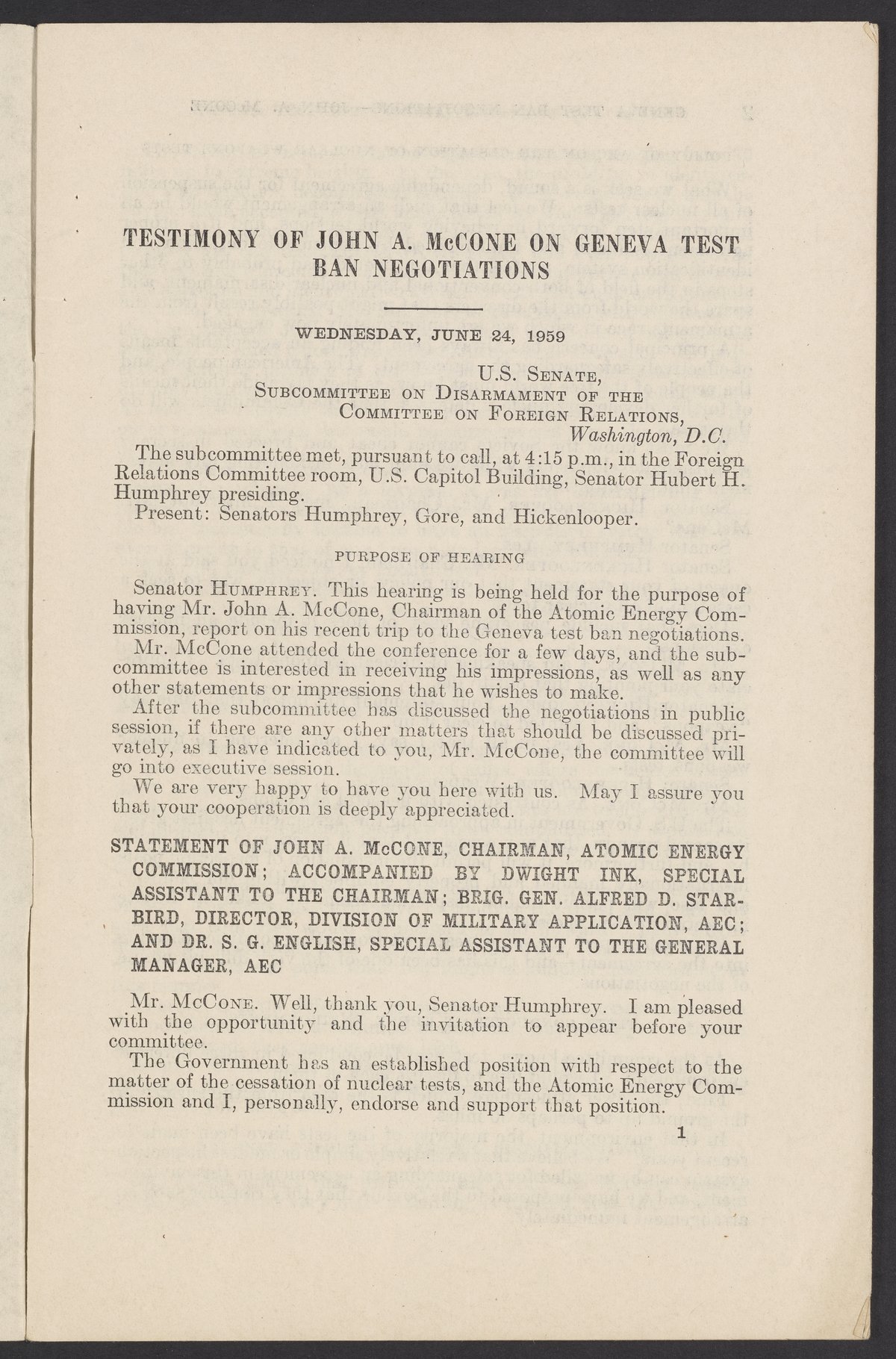 Small JPG1200 x 1831px — 279 KBLarge JPG2880 x 4394px — 1.5 MBFull-sized JPG3774 x 5758px — 2.4 MBOriginal fileTIFF — 3774 x 5758px — 62.2 MBTestimony of John A. McCone (1902-1991), chair of the Atomic Energy Commission (AEC), on Geneva test ban negotiation, given in hearing before the Subcommittee on Disarmament of the Committee on Foreign Relations, United States Senate.
