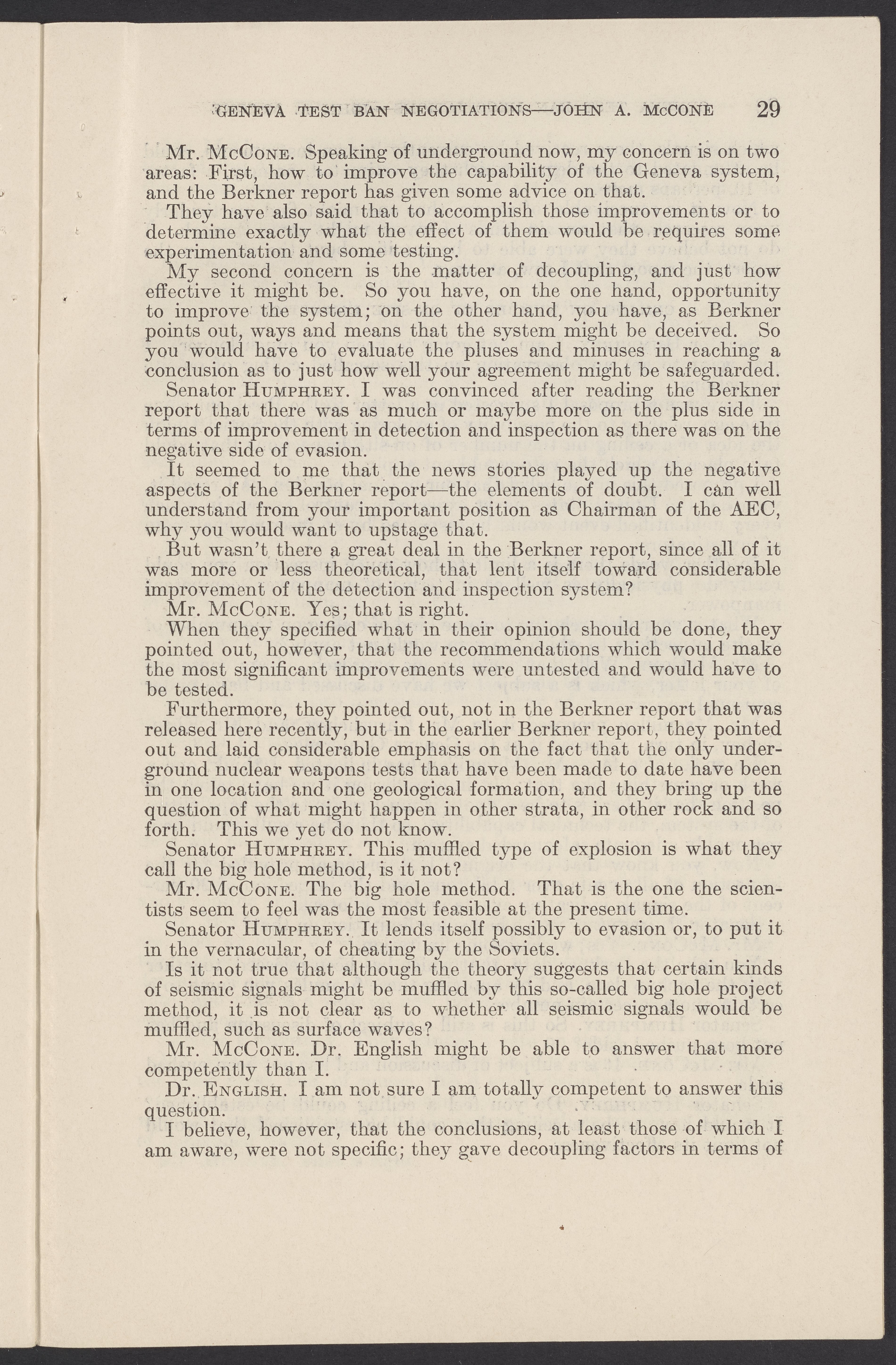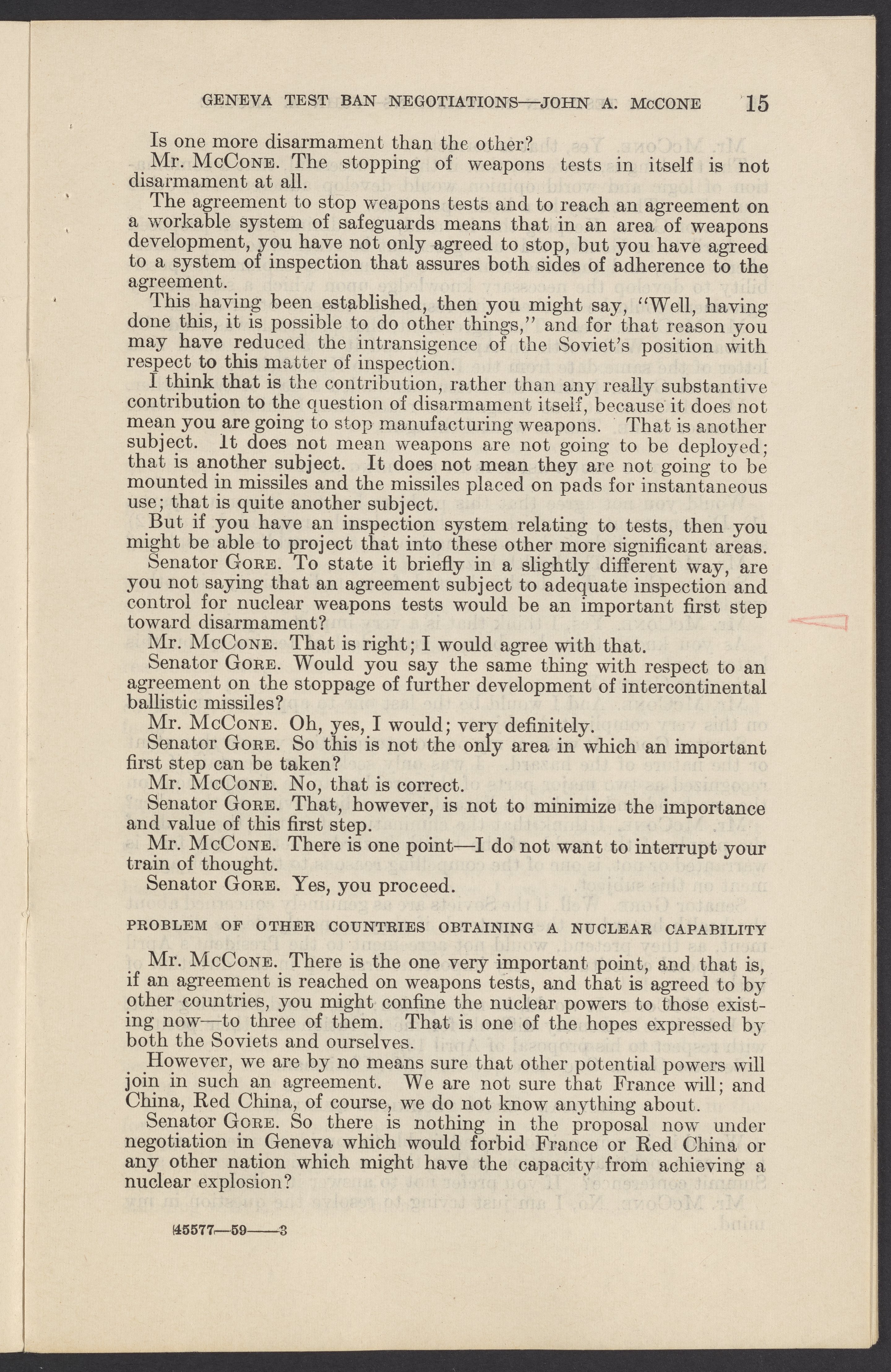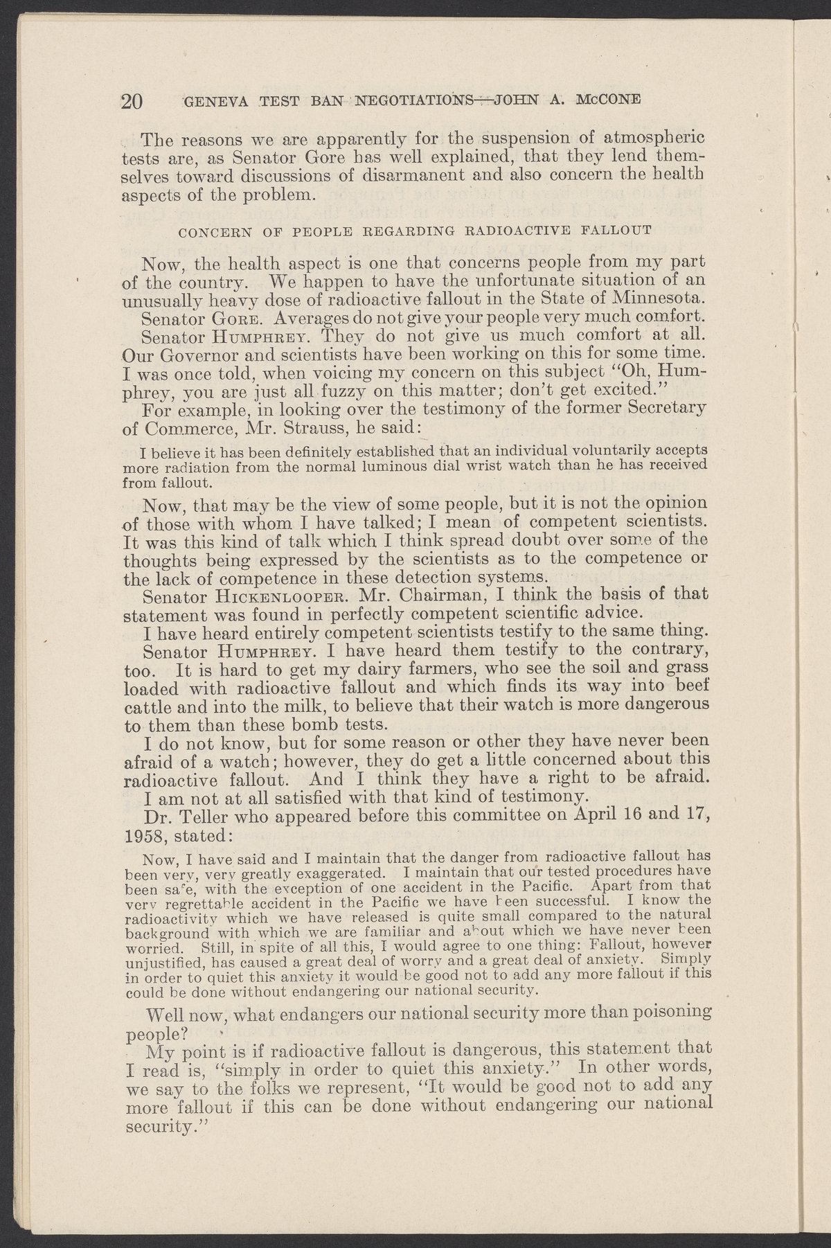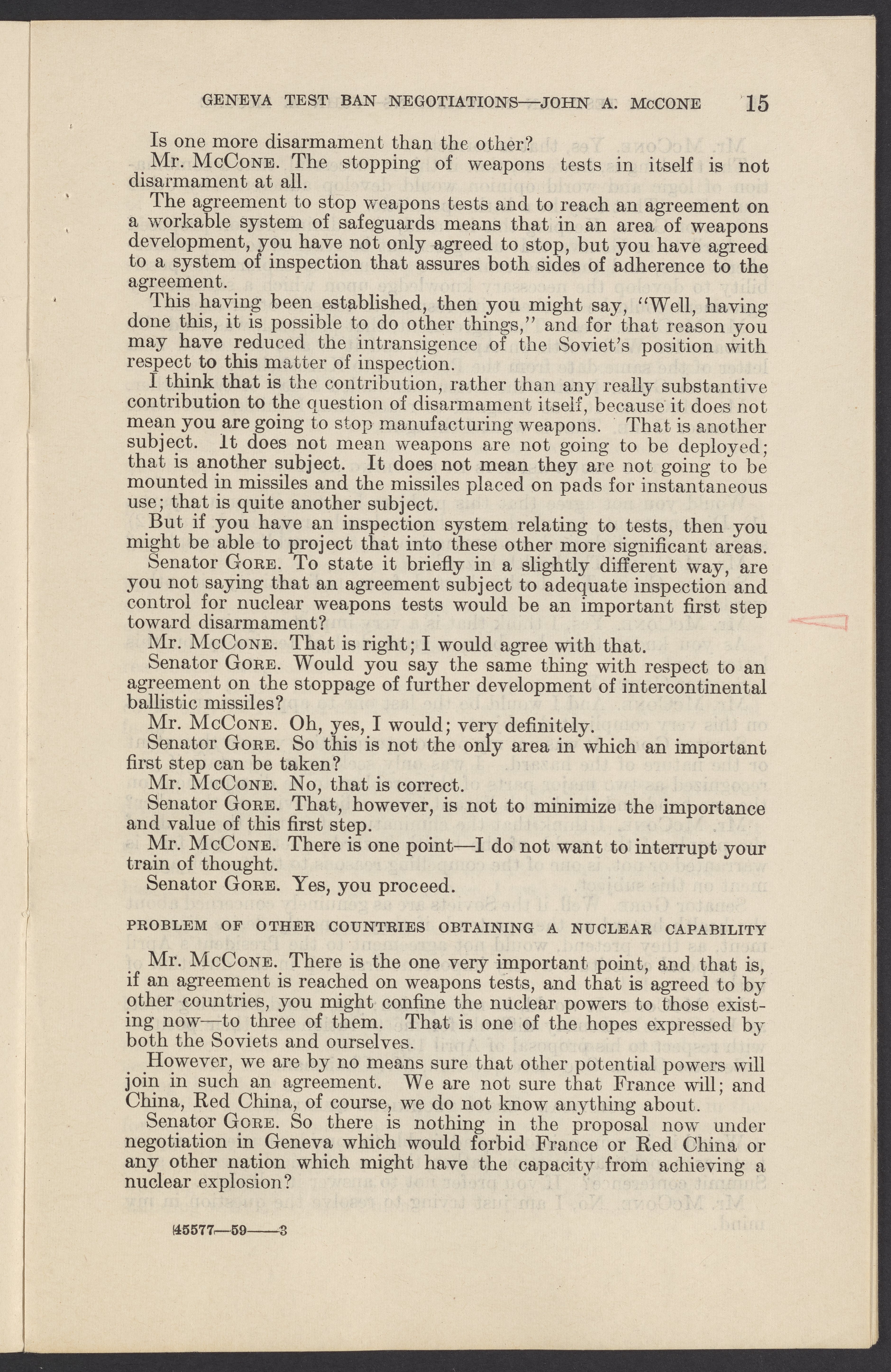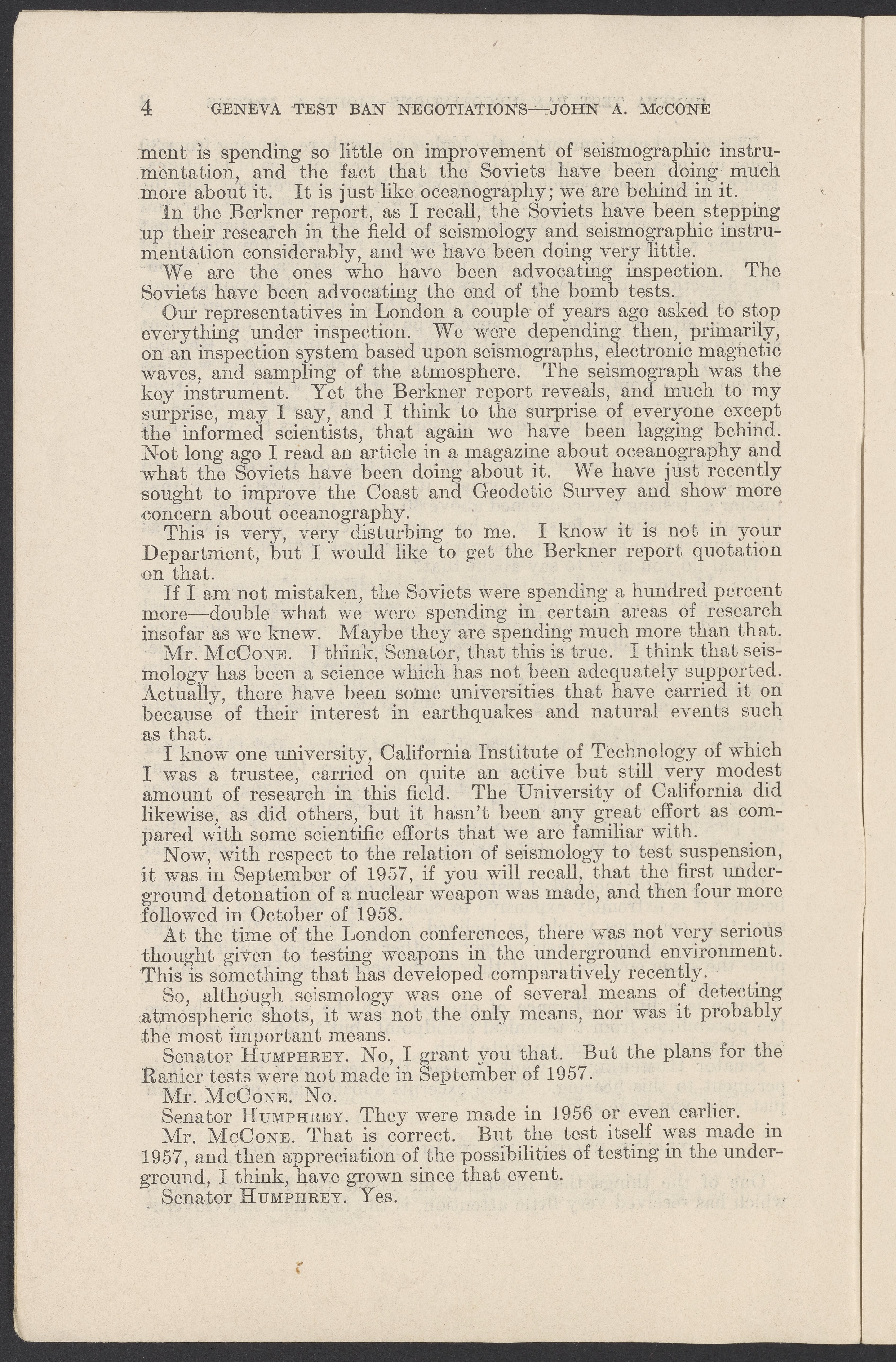 Small JPG1200 x 1831px — 279 KBLarge JPG2880 x 4394px — 1.5 MBFull-sized JPG3774 x 5758px — 2.4 MBOriginal fileTIFF — 3774 x 5758px — 62.2 MBTestimony of John A. McCone (1902-1991), chair of the Atomic Energy Commission (AEC), on Geneva test ban negotiation, given in hearing before the Subcommittee on Disarmament of the Committee on Foreign Relations, United States Senate.