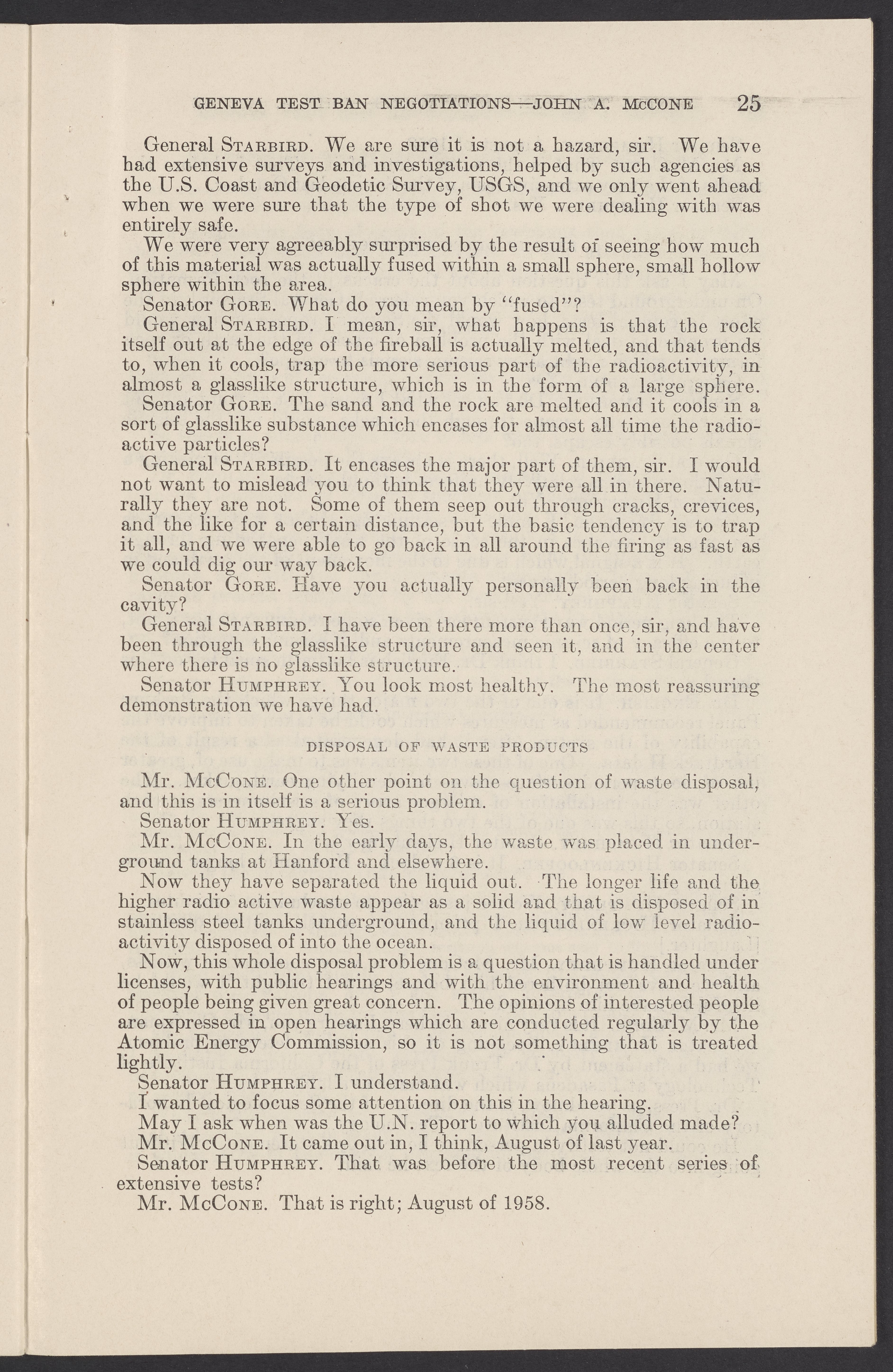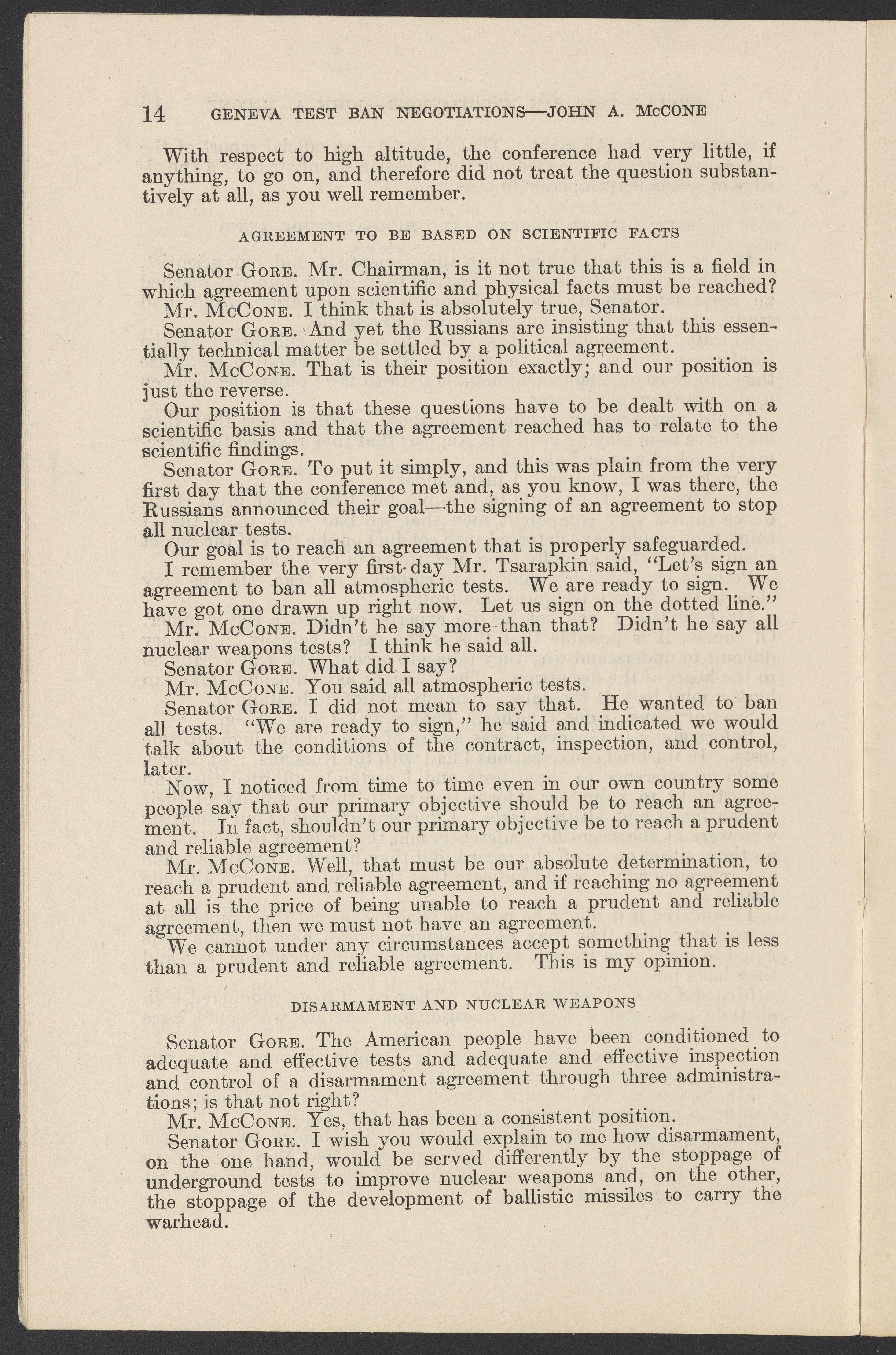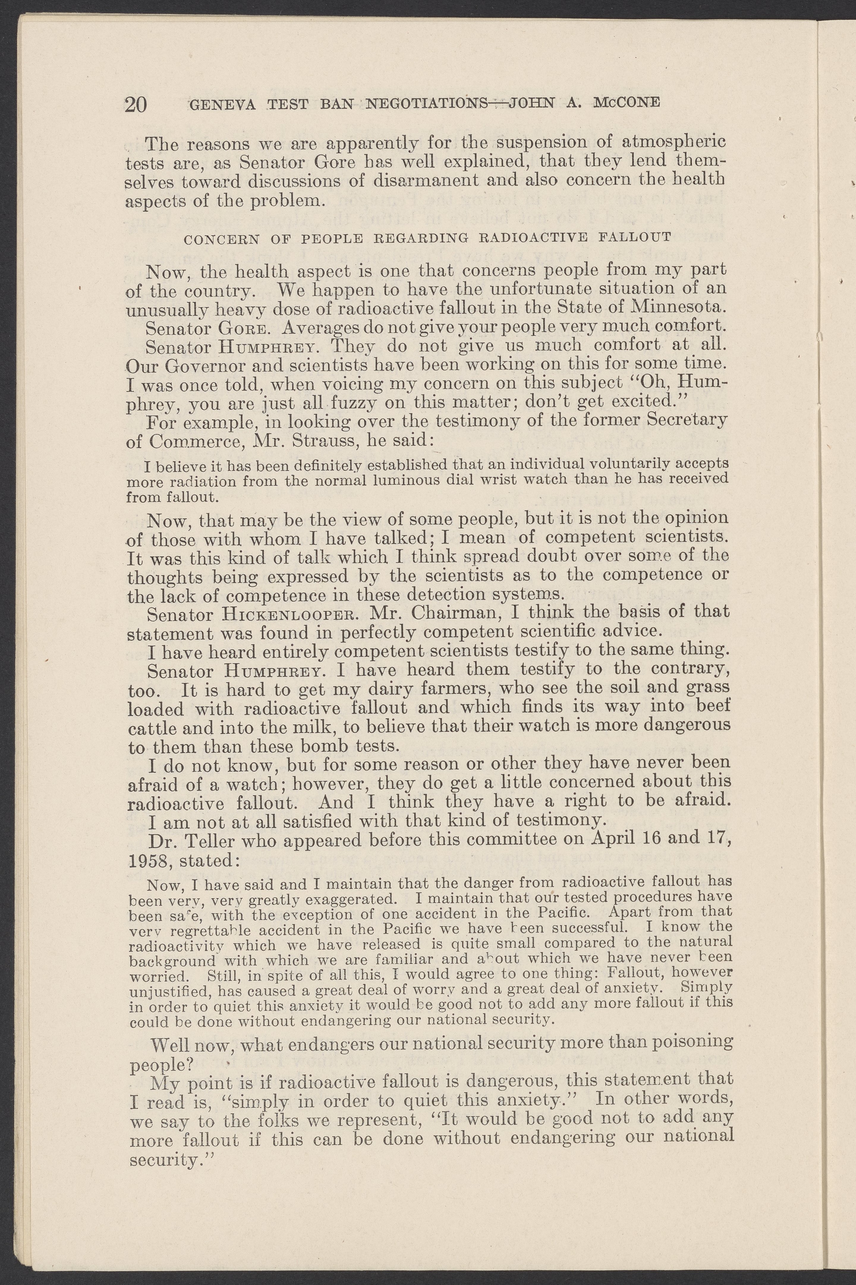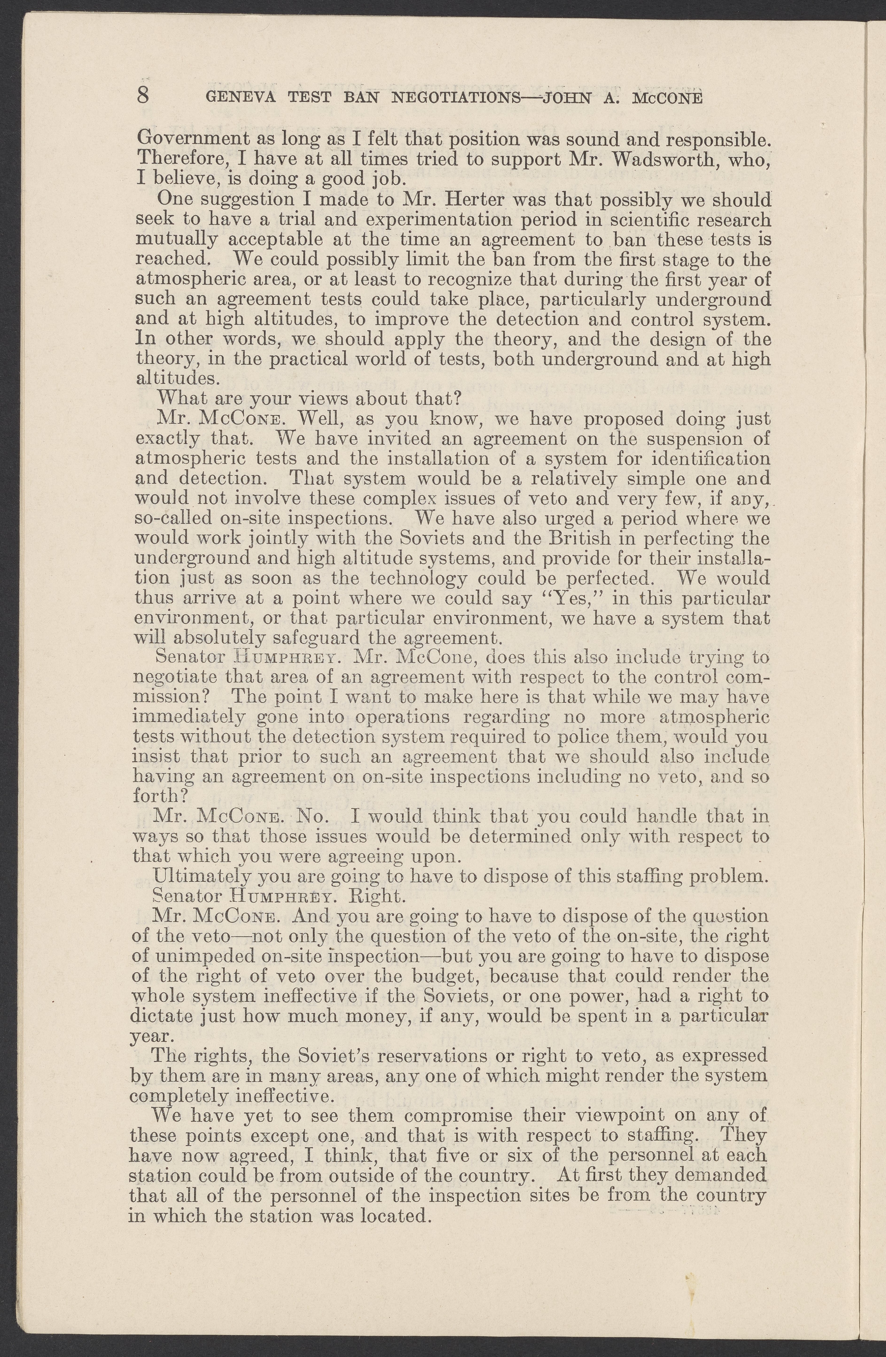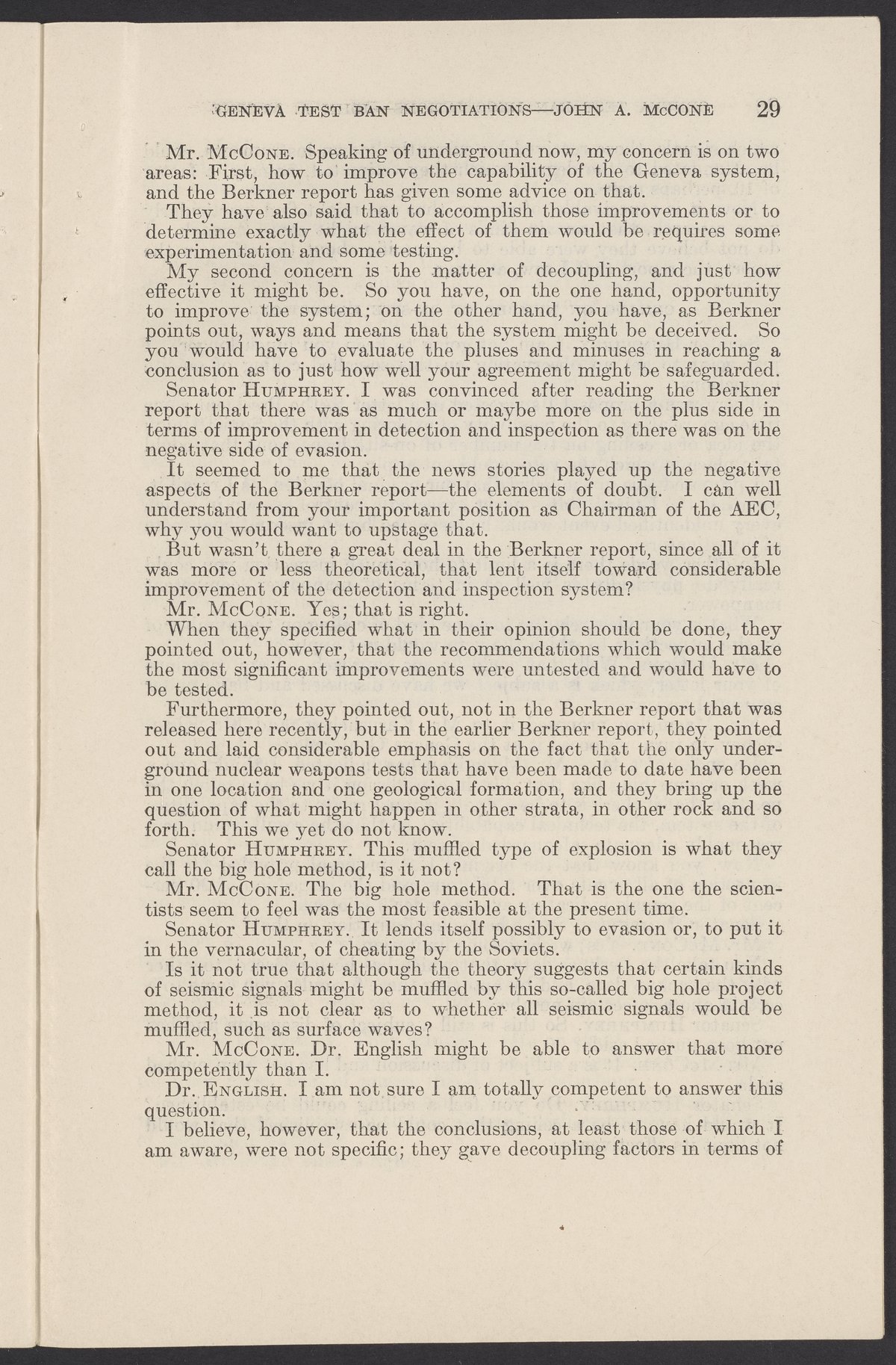 Small JPG1200 x 1831px — 279 KBLarge JPG2880 x 4394px — 1.5 MBFull-sized JPG3774 x 5758px — 2.4 MBOriginal fileTIFF — 3774 x 5758px — 62.2 MBTestimony of John A. McCone (1902-1991), chair of the Atomic Energy Commission (AEC), on Geneva test ban negotiation, given in hearing before the Subcommittee on Disarmament of the Committee on Foreign Relations, United States Senate.