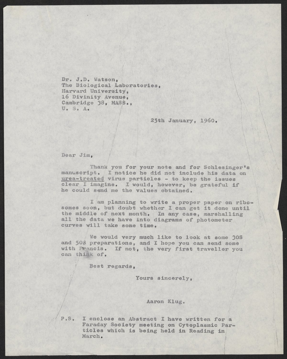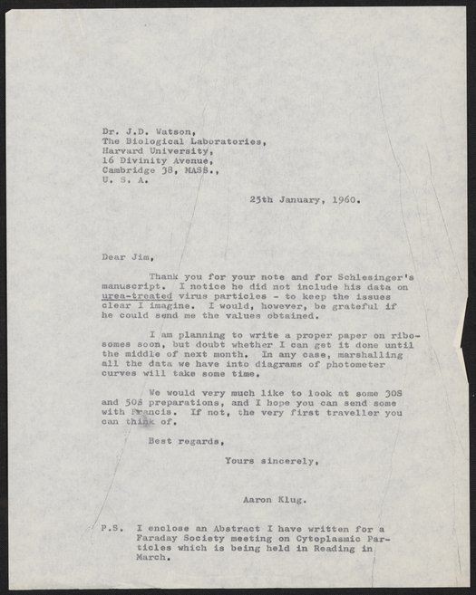 Klug, A. (Aaron), Sir. “Letter from Aaron Klug to James Watson, January 25, 1960,” January 25, 1960. History of Molecular Biology Collection, Box 28, Folder 8. Science History Institute. Philadelphia. https://digital.sciencehistory.org/works/ggzub24.