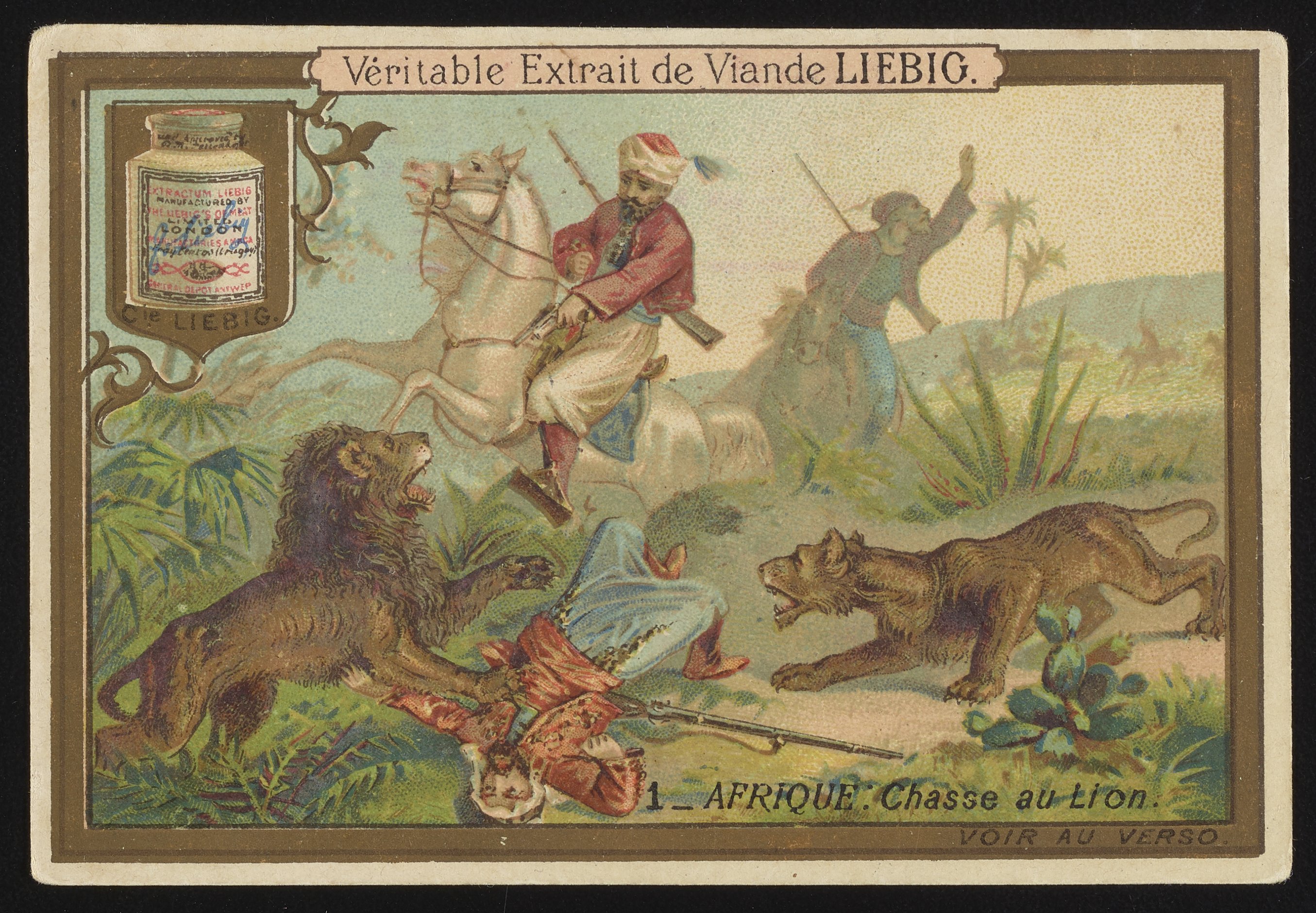 Small JPG1200 x 832px — 252 KBFull-sized JPG2710 x 1880px — 1.0 MBOriginal fileTIFF — 2710 x 1880px — 14.6 MBEntitled "Afrique. Chasse au Lion," illustrated trade card depicts hunters chasing a lion in the African wilderness. A hunter on horseback wears a turban and aims a gun at a lion that is standing upon another hunter. The imagery could be referencing European adventurer Sir Henry Morton Stanley's 1871 visit to Africa, who mentioned bringing the extract on his journey. The upper left hand corner depicts a jar of Real Liebig Meat Extract. Verso is an advertisement for Liebig's Extract of Meat.