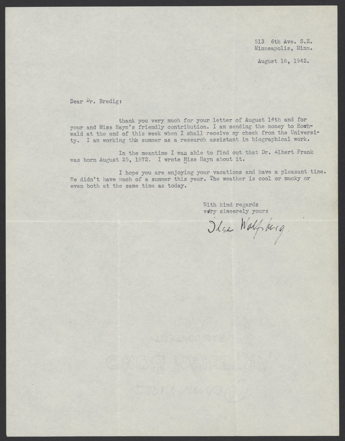 Letter from Ilse Wolfsberg to Max Bredig, August 18, 1942