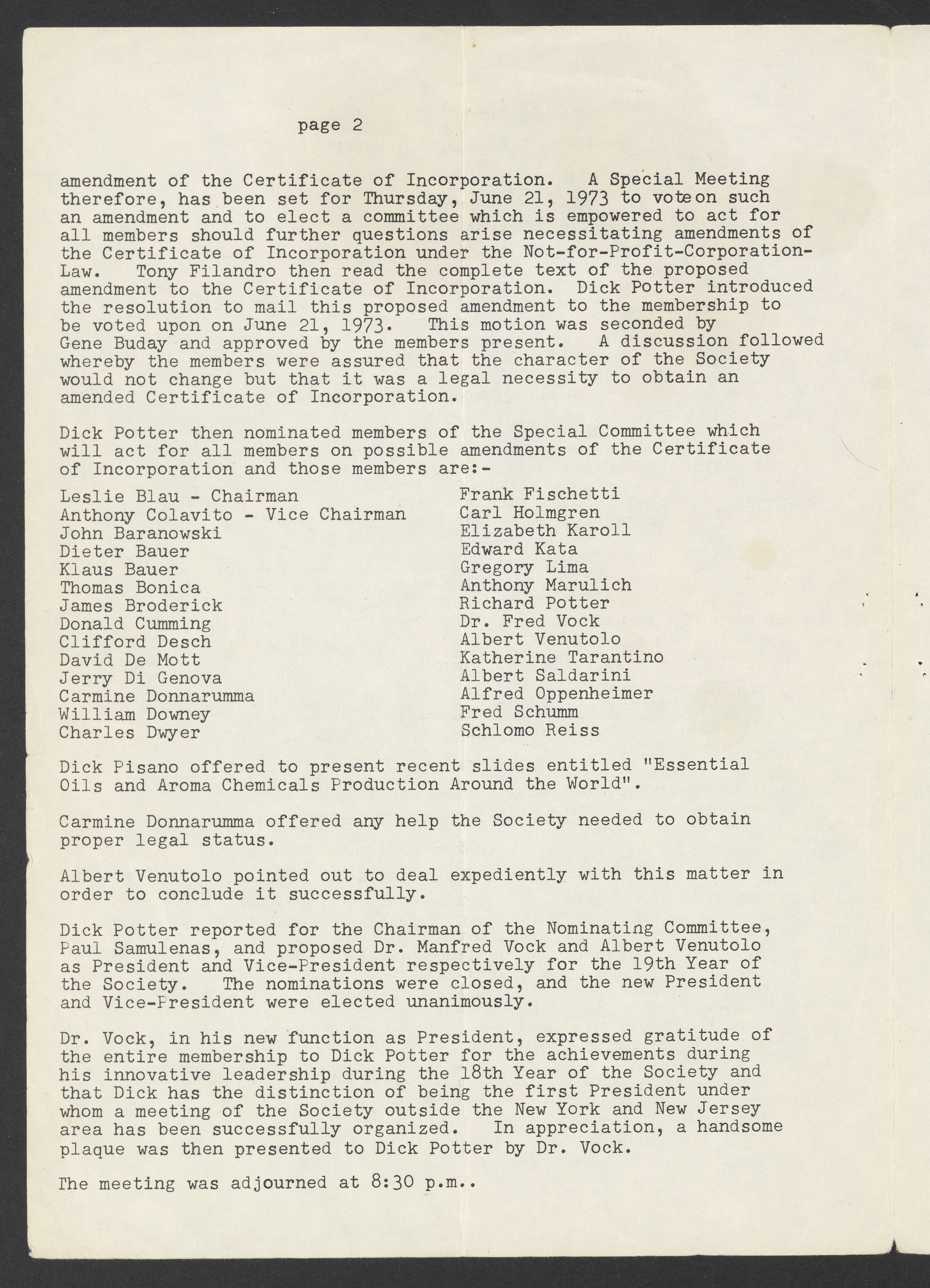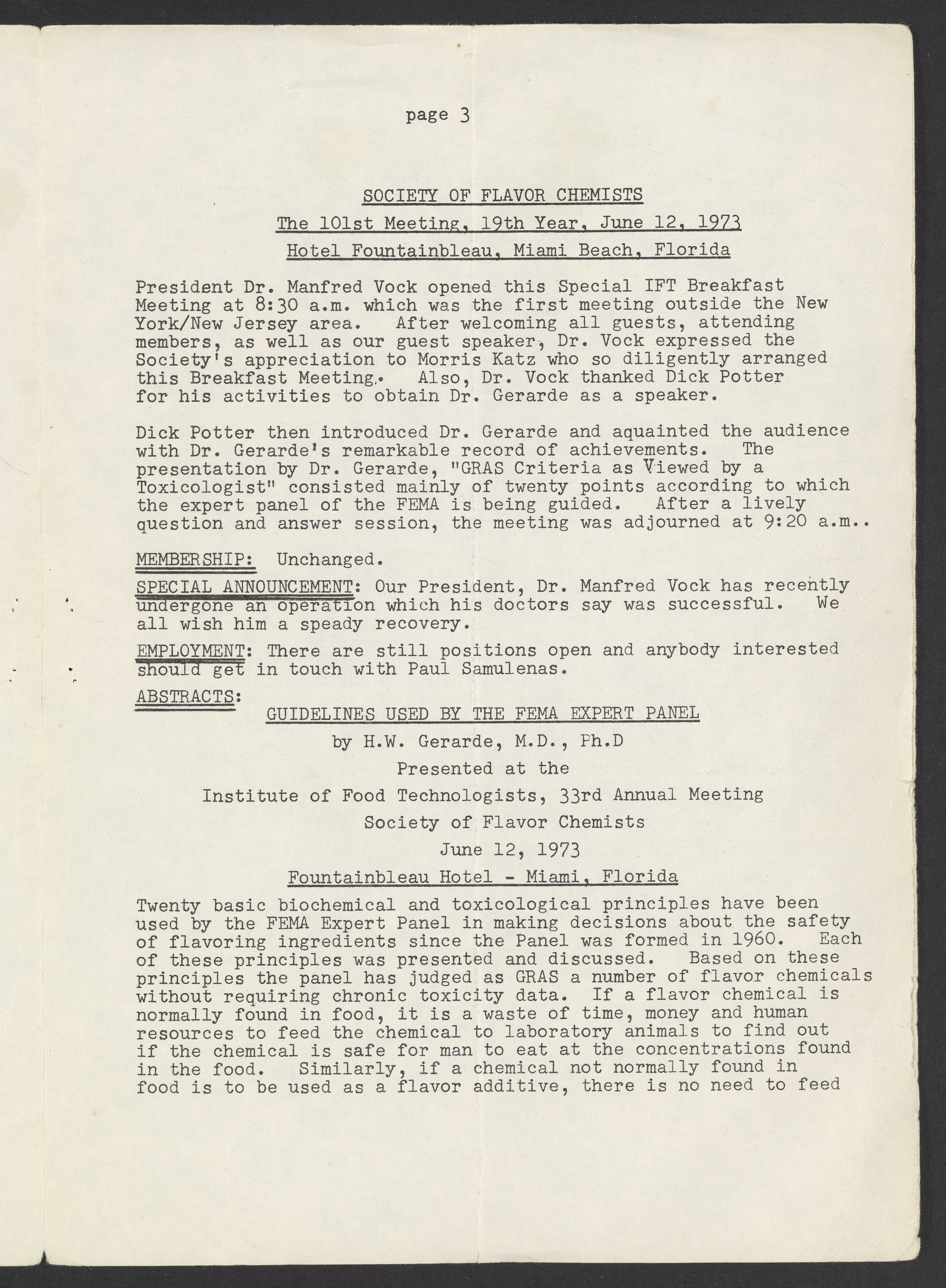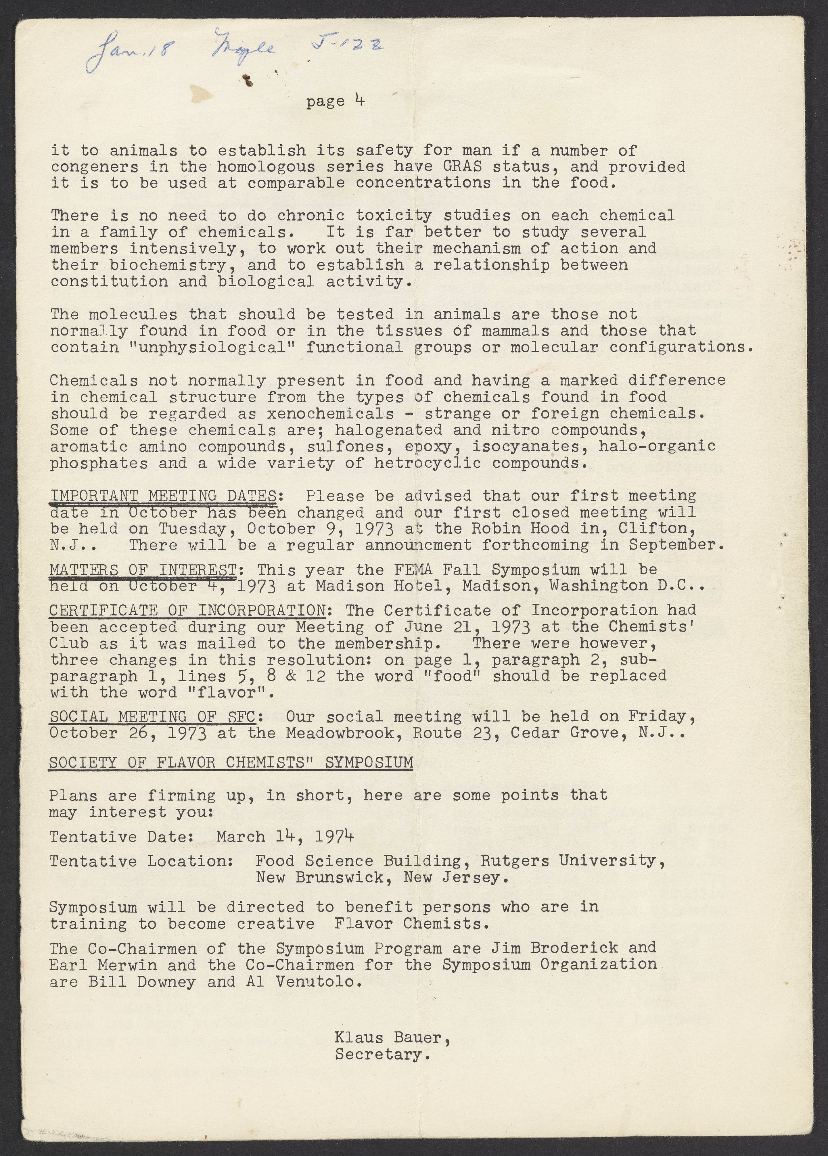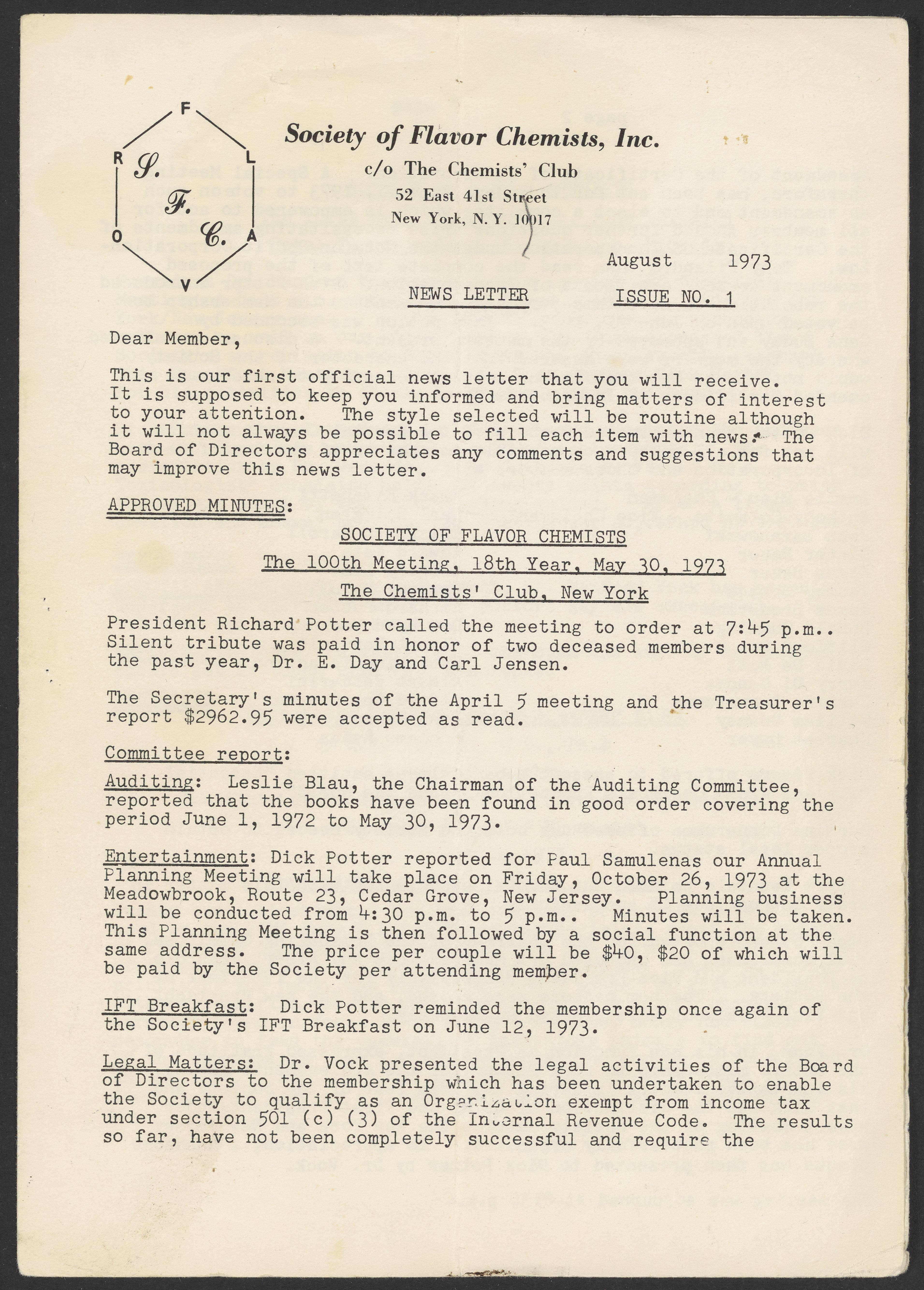 Society of Flavor Chemists. “Society of Flavor Chemists Newsletter, August 1973,” August 1973. Society of Flavor Chemists Newsletters and Certificate of Incorporation, Box 1, Folder 1. Science History Institute. Philadelphia. https://digital.sciencehistory.org/works/gi7te47.