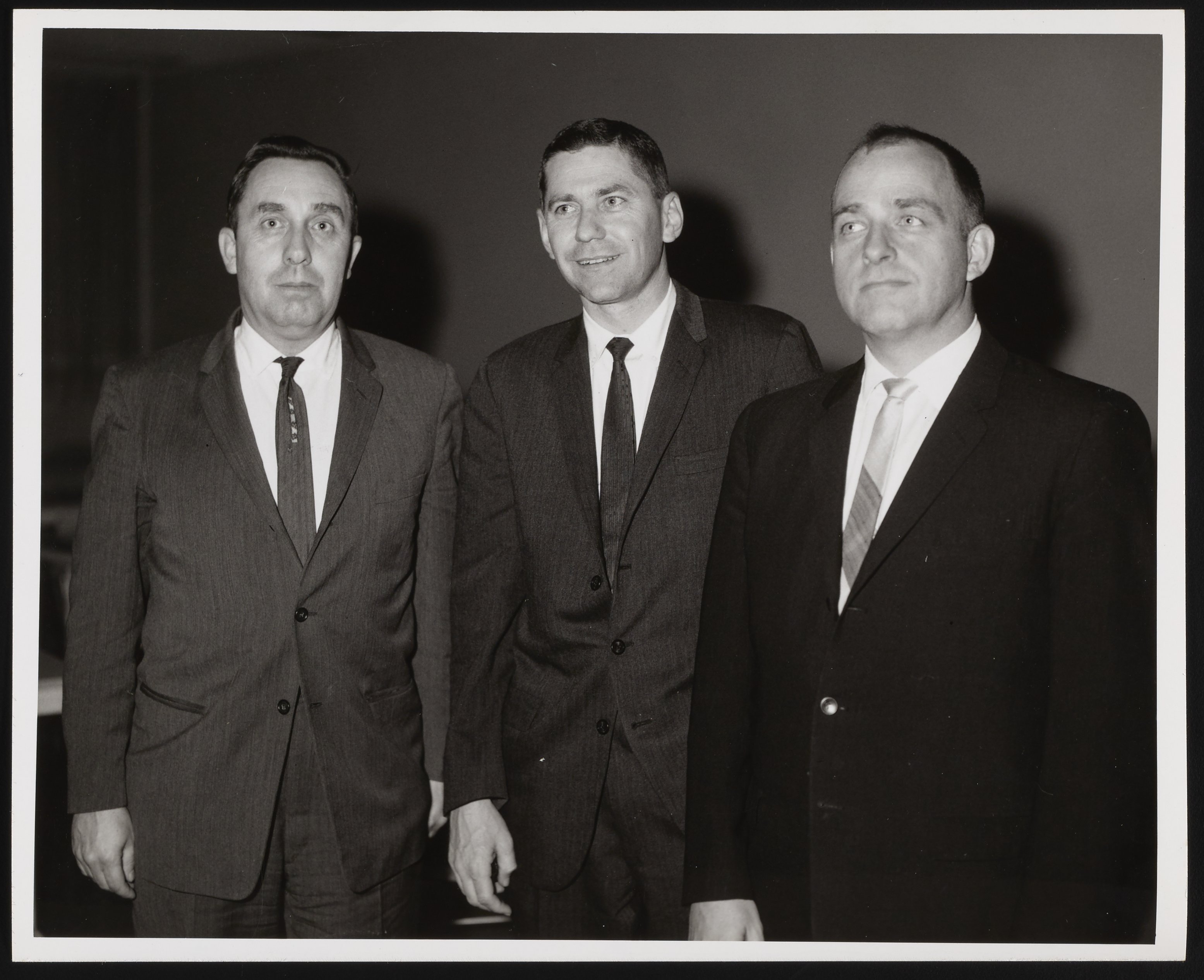 Small JPG1200 x 939px — 113 KBFull-sized JPG1627 x 1273px — 176 KBOriginal fileTIFF — 1627 x 1273px — 6.0 MBThe Orange County Section of the American Institute of Aeronautics and Astronautics invited speakers to discuss plans for a manned orbital space station. The pictured men are identified as the speakers: Thomas B. Webber, manager of bioastronautics at Beckman Instruments; B. E. Welch, chief of the Environmental Systems branch at the U.S. Air Force School of Medicine; and Edward Olling, head of the Space Station Study Office at the Manned Spacecraft Center.