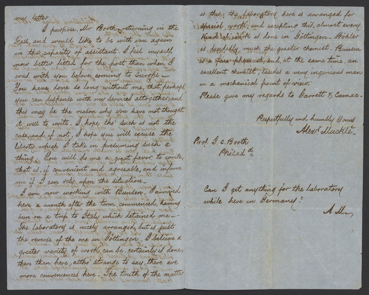 Small JPG1200 x 1855px — 456 KBFull-sized JPG2310 x 3571px — 1.3 MBOriginal fileTIFF — 2310 x 3571px — 23.7 MBA. Muckle, a former pupil of James Curtis Booth (1810-1888), writes from Germany comparing the chemists Robert Wilhelm Eberhard Bunsen (1811-1899) and Friedrich Wöhler (1800-1882) and inquiring as to his prospects upon returning to the United States.