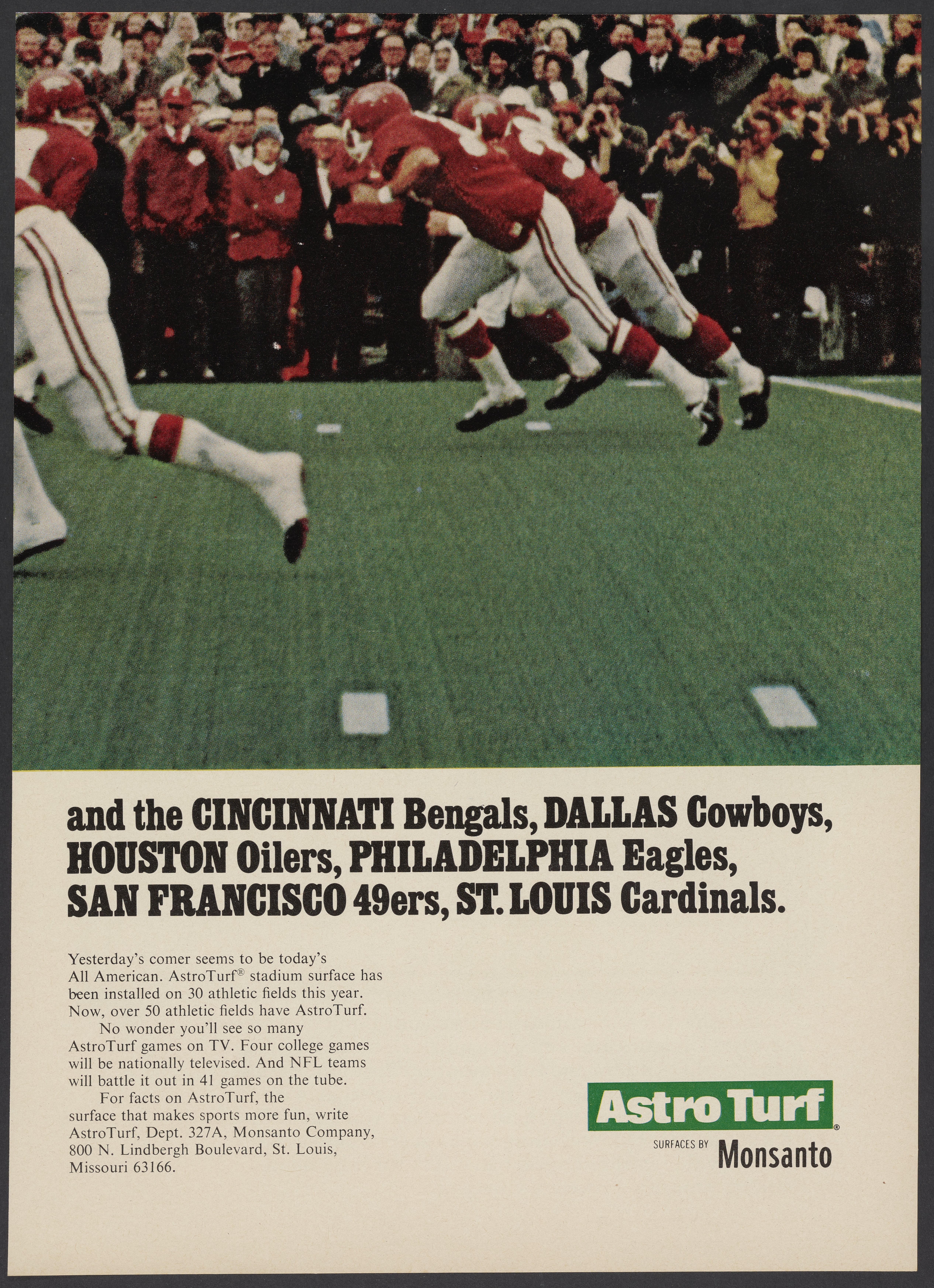 Monsanto Company. “If You Think AstroTurf Is a Comer, Think Again.” Paper (fiber product), circa 1970. Science History Institute. Philadelphia. https://digital.sciencehistory.org/works/gnubtxc.