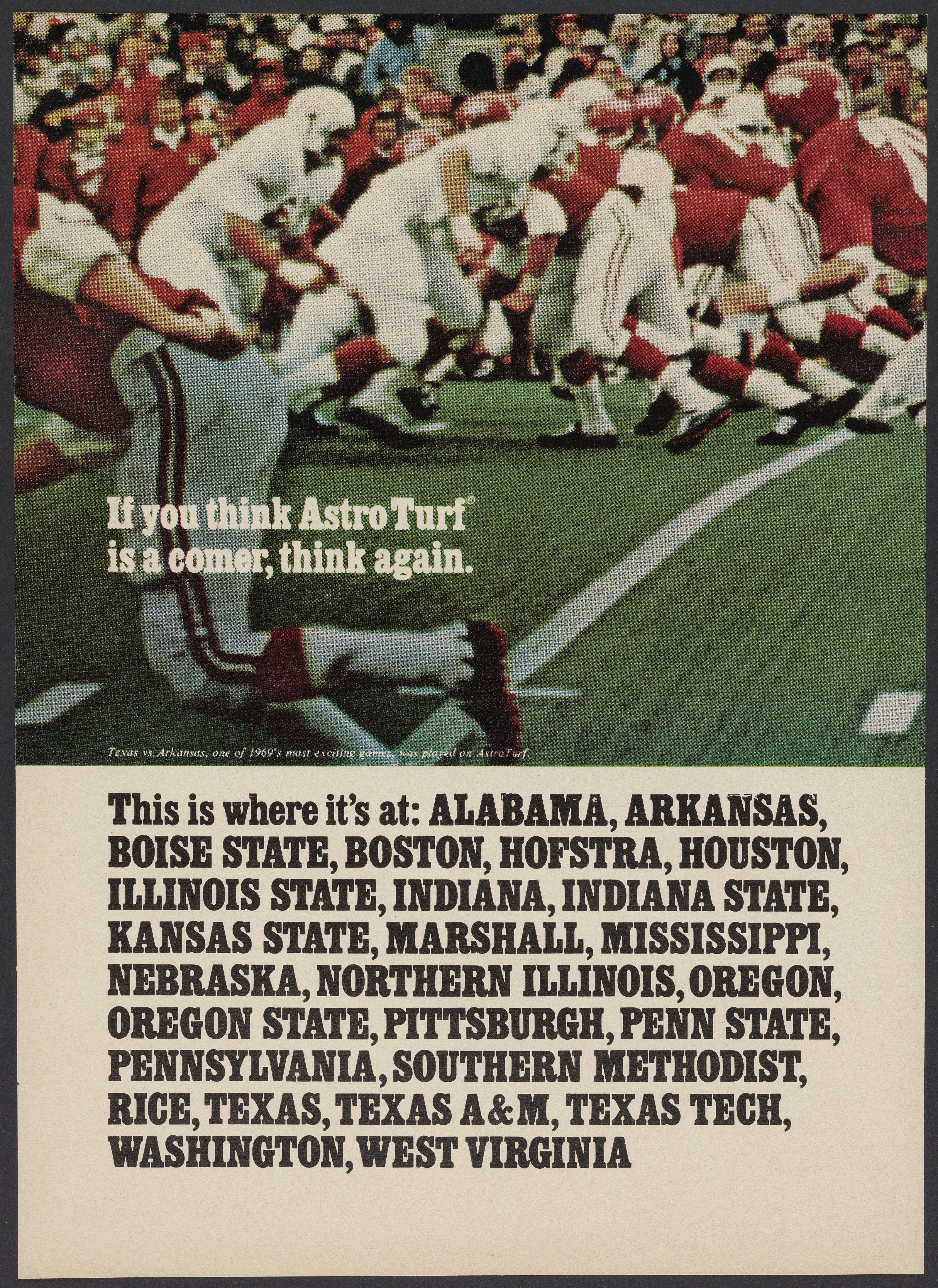 This advertisement for AstroTurf features an image of the 1969 University of Texas Longhorns versus the University of Arkansas Razorbacks. This accompanying text boasts that over 50 athletic fields, including those of major NFL teams, use AstroTurf.
