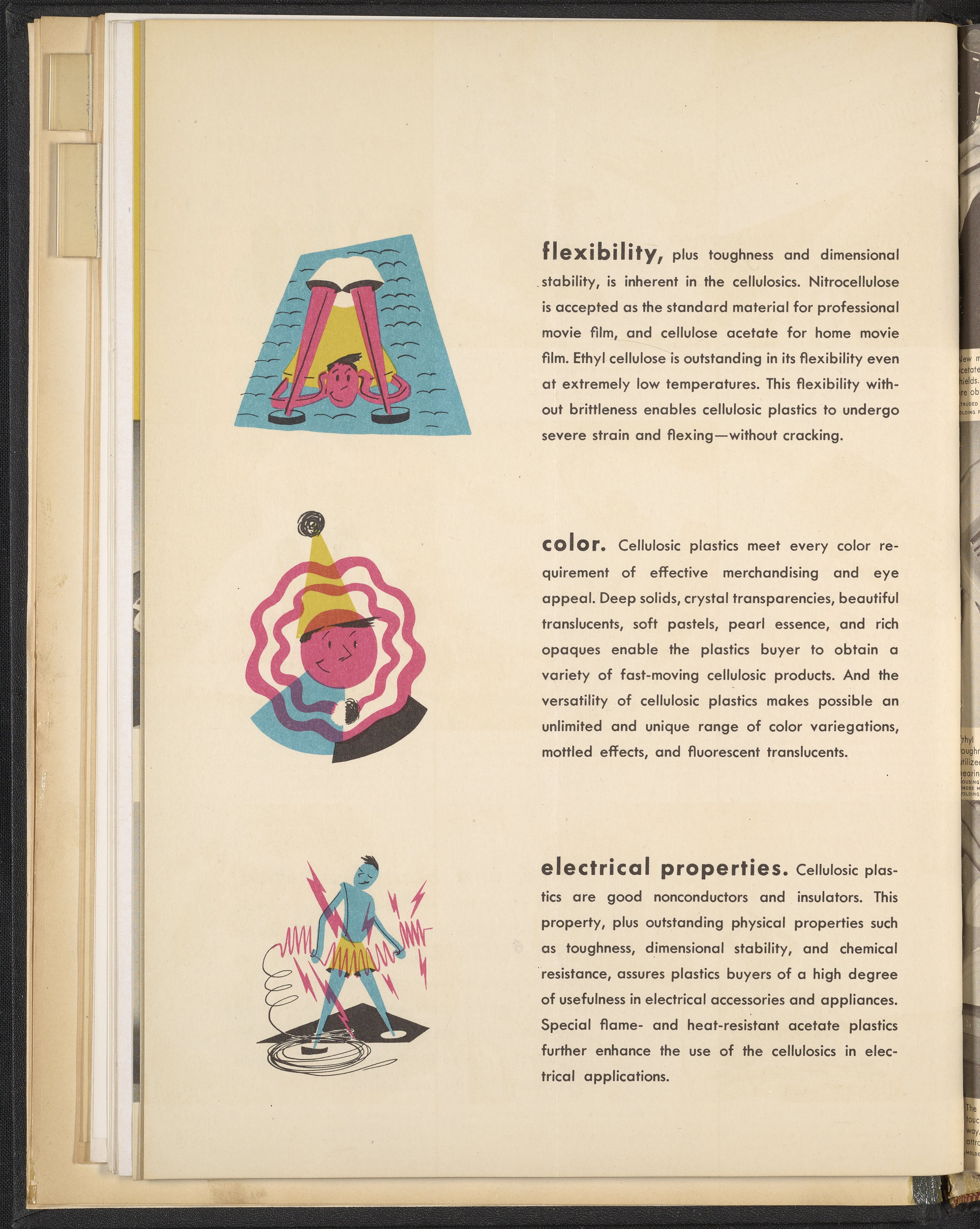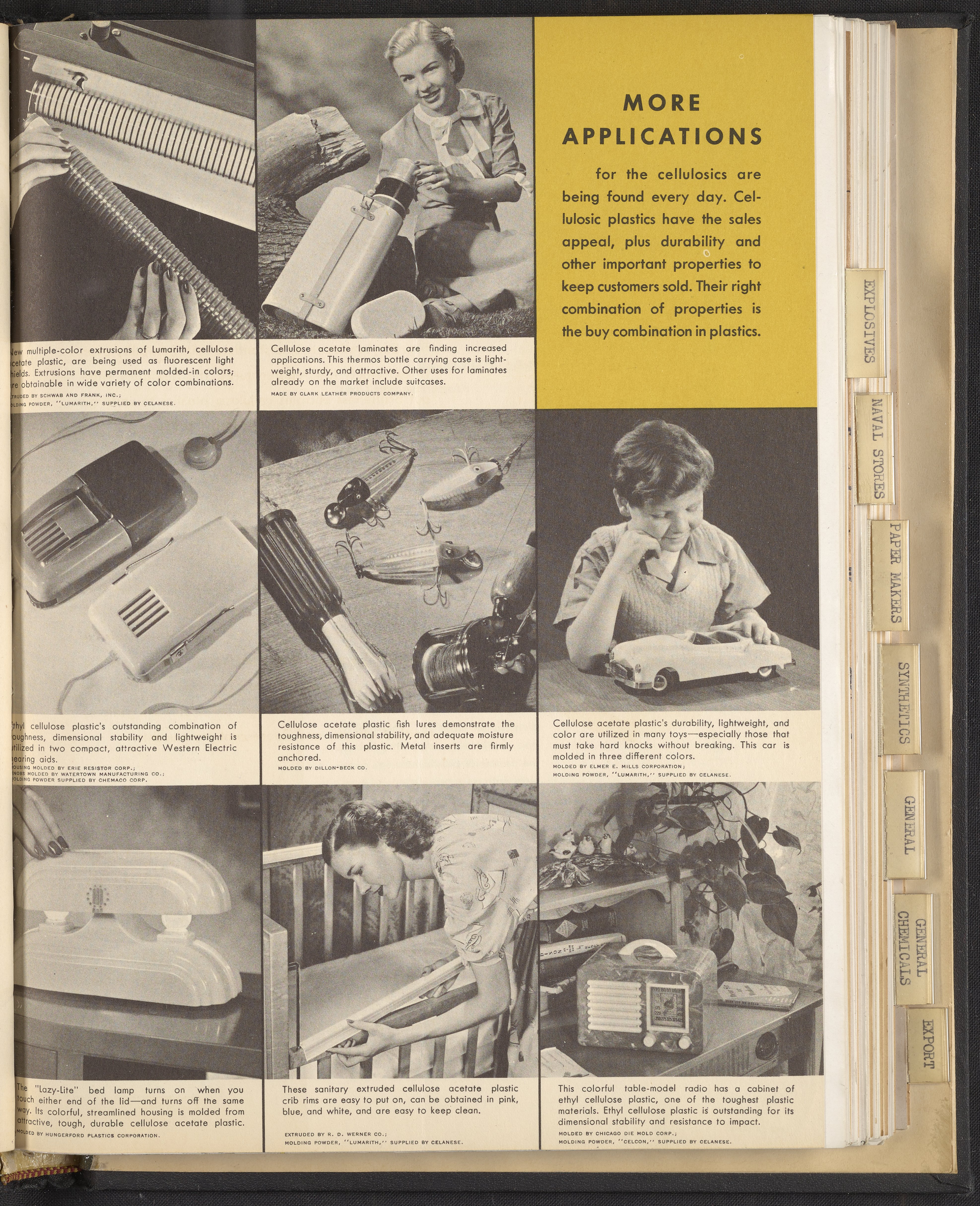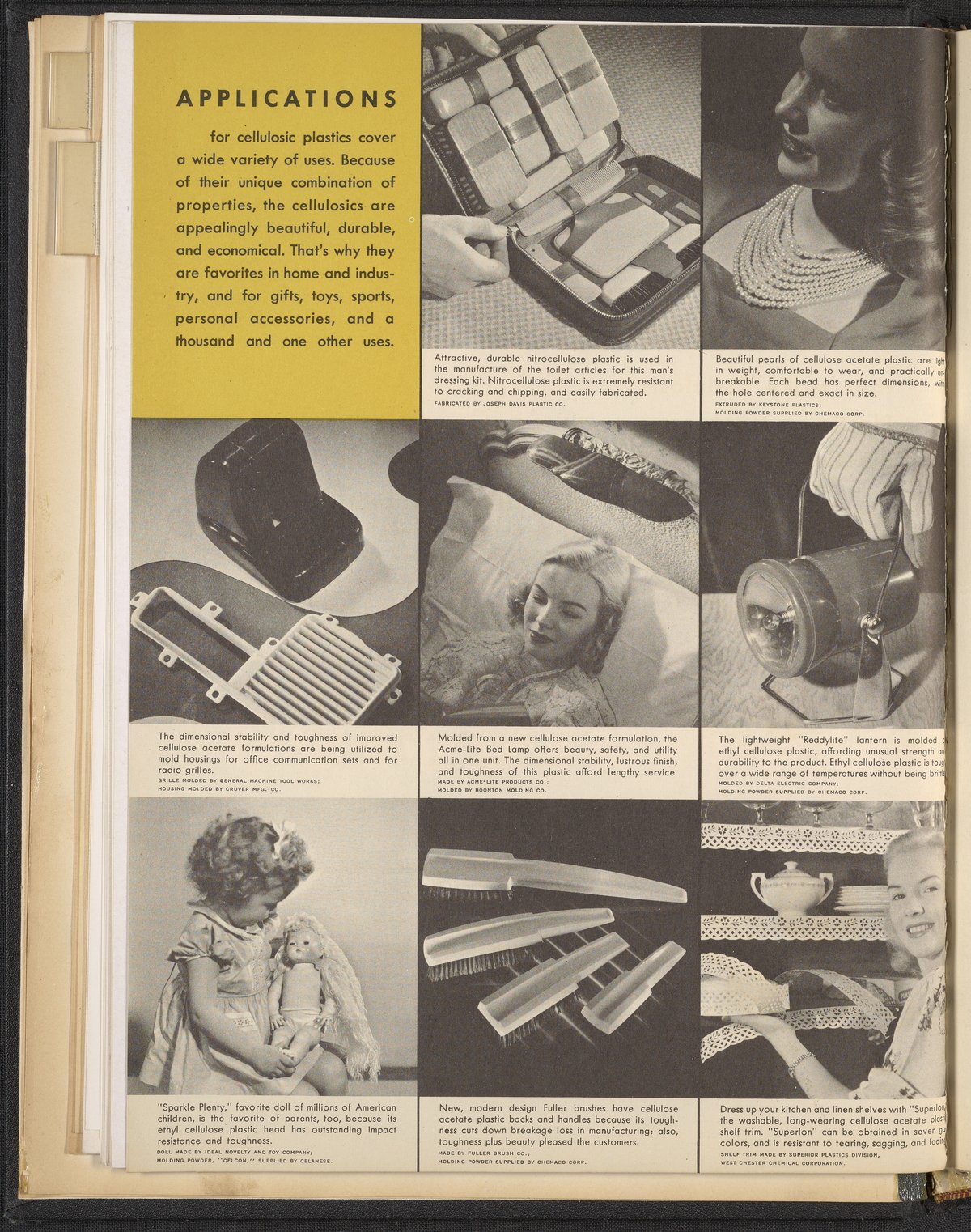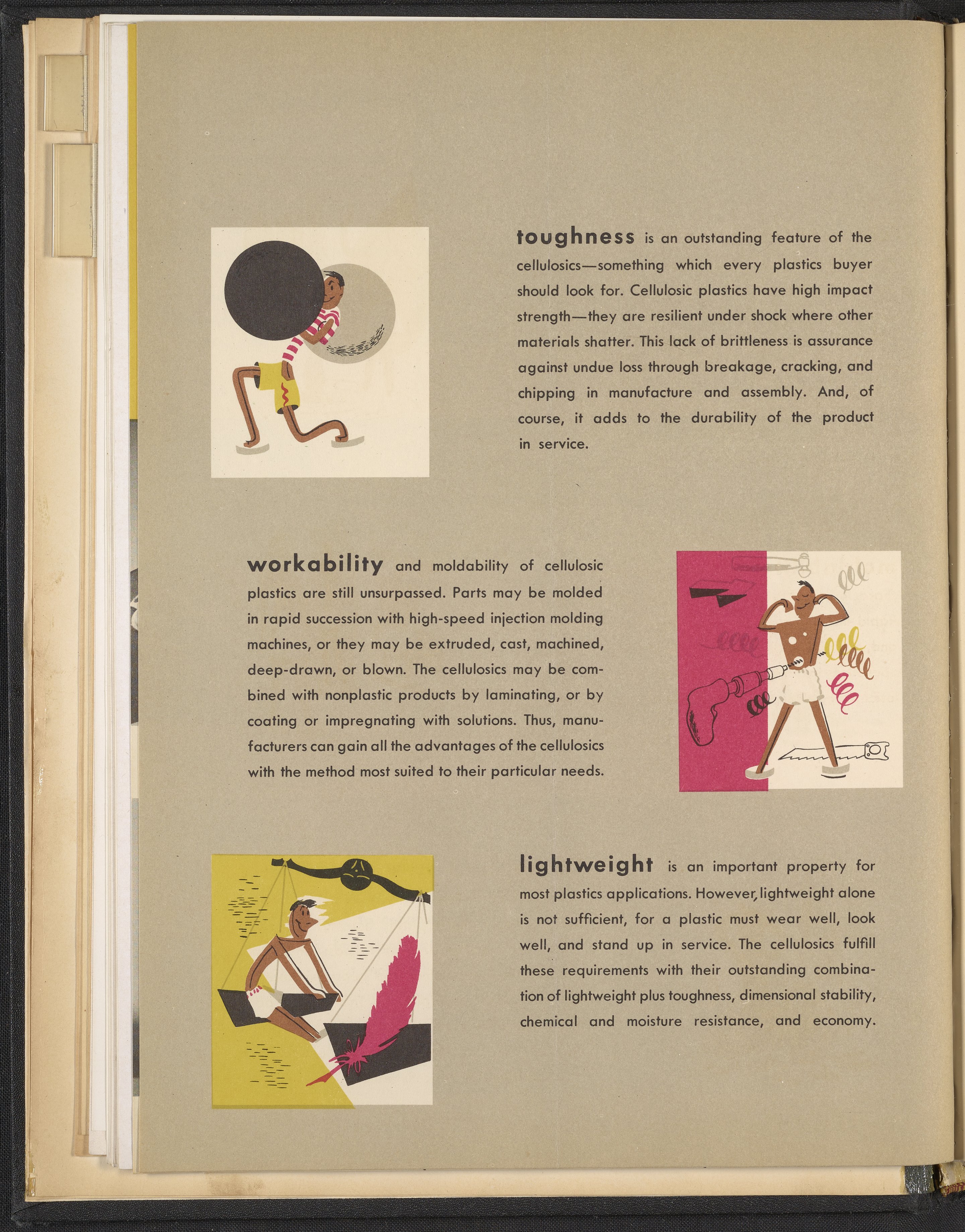 Small JPG1200 x 1467px — 271 KBLarge JPG2880 x 3520px — 1.9 MBFull-sized JPG3960 x 4840px — 3.4 MBOriginal fileTIFF — 3960 x 4840px — 54.9 MBColorful print advertisement spread advertising cellulosic plastics made with plastic molding compounds manufactured and sold by Hercules Powder Company. The accompanying text promotes cellulosics as "the most useful of all plastics." The spread includes photographs of consumer goods made from plastic, advertisements for informational booklets available to order, and information describing in detail the desirable qualities of cellulosic plastics including dimensional stability, economy, toughness, workability, chemical resistance, and more. Each quality is accompanied by a stylized illustration.