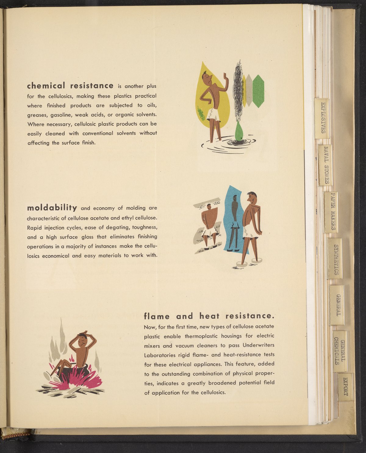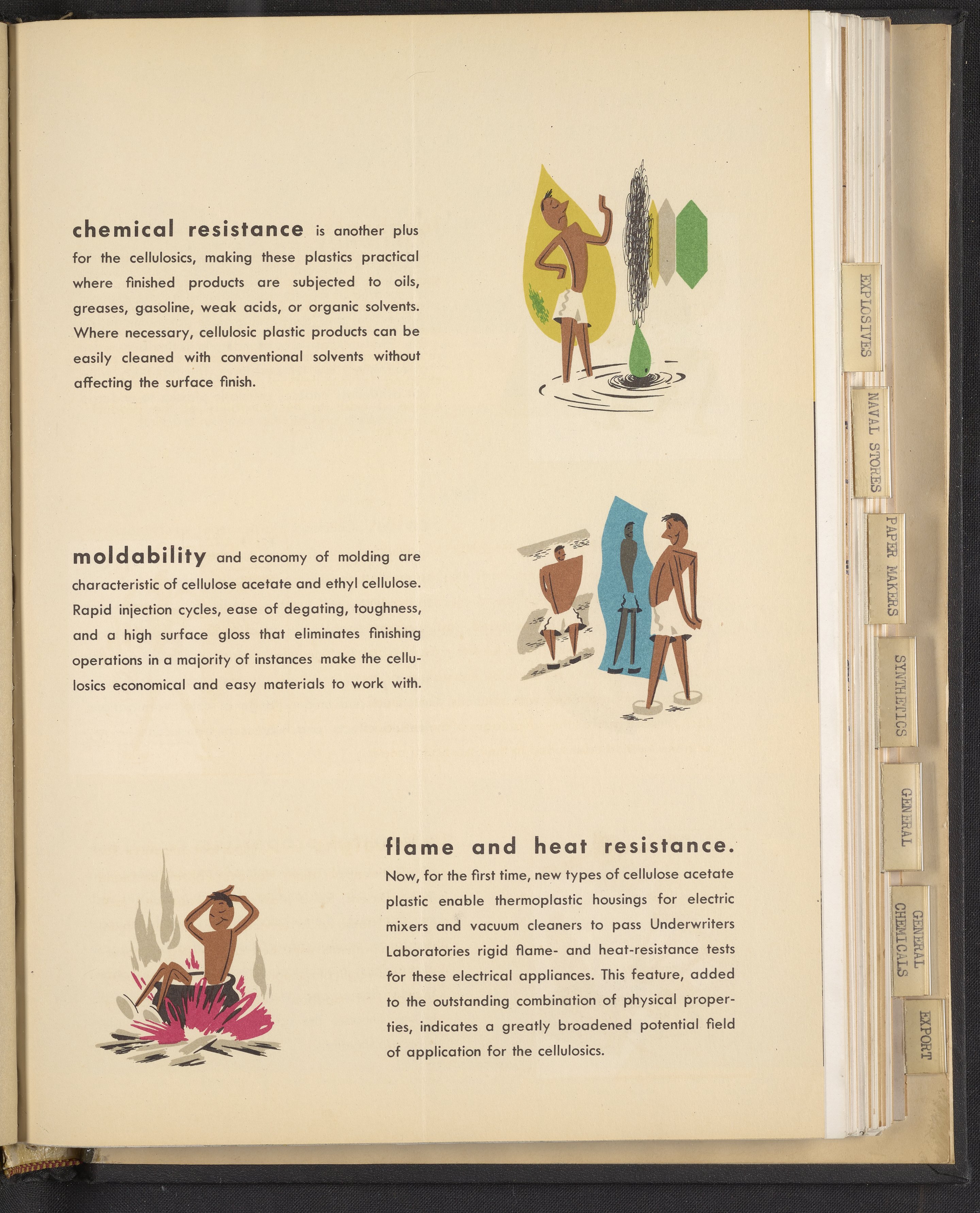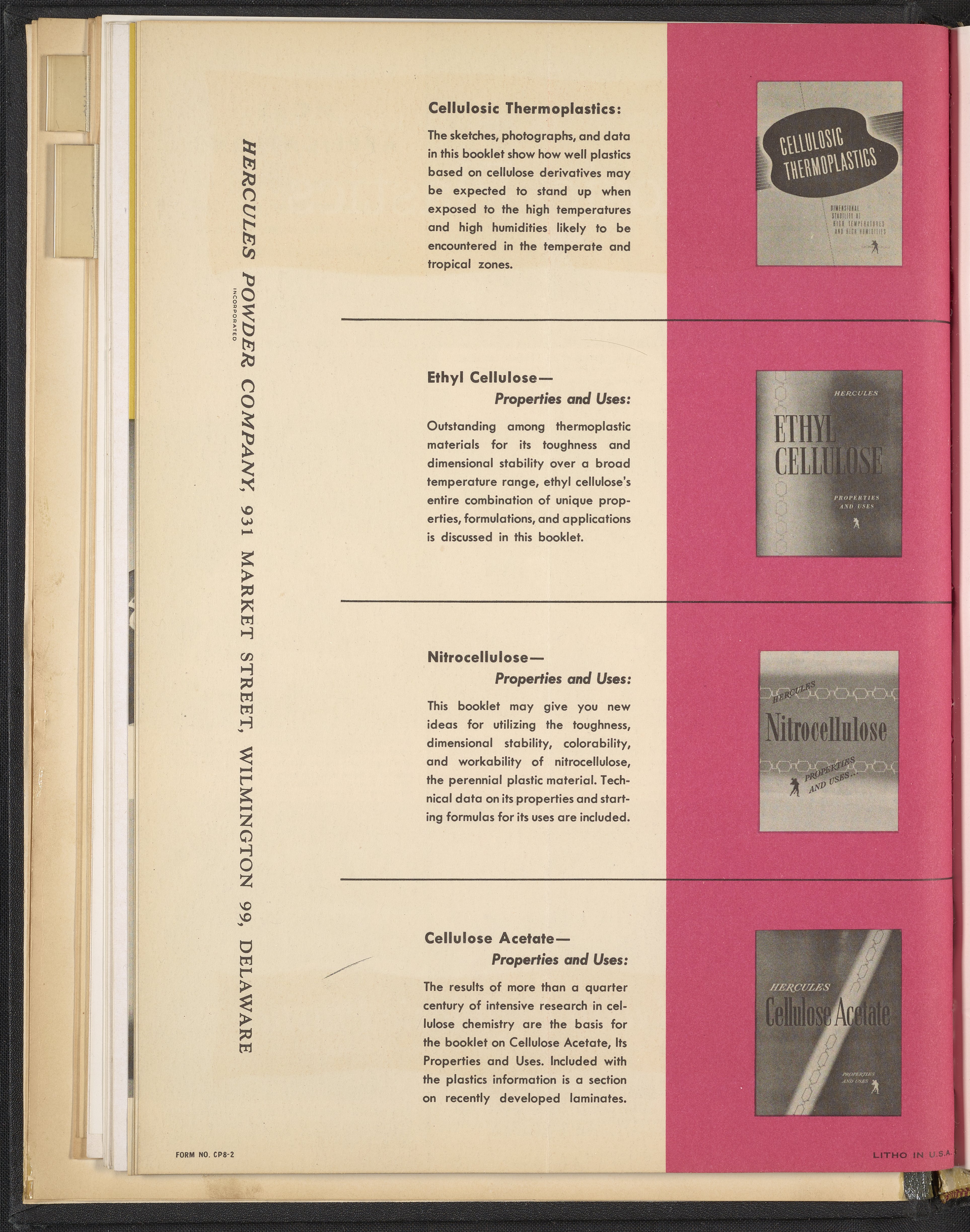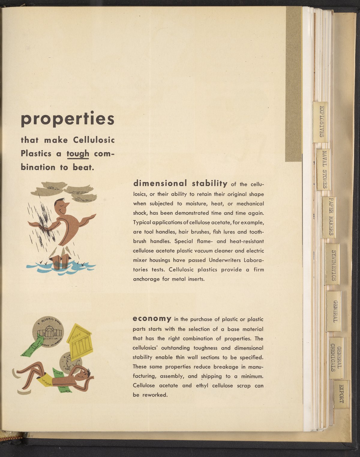 Small JPG1200 x 1467px — 271 KBLarge JPG2880 x 3520px — 1.9 MBFull-sized JPG3960 x 4840px — 3.4 MBOriginal fileTIFF — 3960 x 4840px — 54.9 MBColorful print advertisement spread advertising cellulosic plastics made with plastic molding compounds manufactured and sold by Hercules Powder Company. The accompanying text promotes cellulosics as "the most useful of all plastics." The spread includes photographs of consumer goods made from plastic, advertisements for informational booklets available to order, and information describing in detail the desirable qualities of cellulosic plastics including dimensional stability, economy, toughness, workability, chemical resistance, and more. Each quality is accompanied by a stylized illustration.