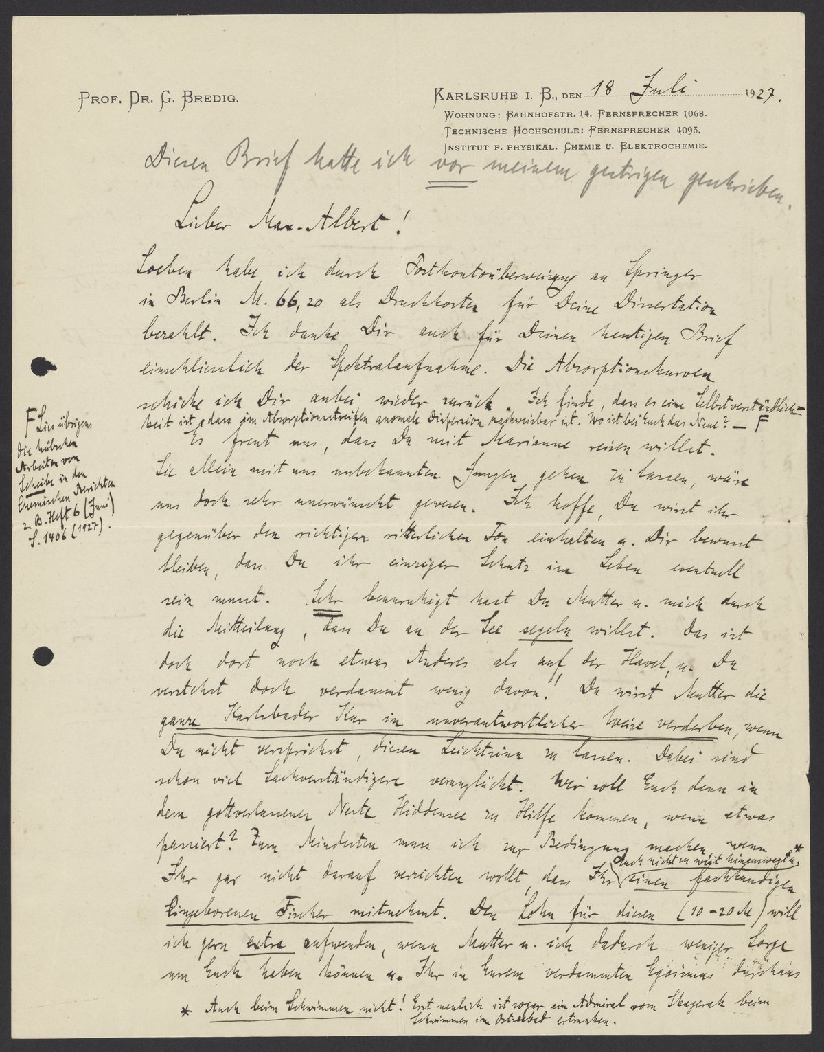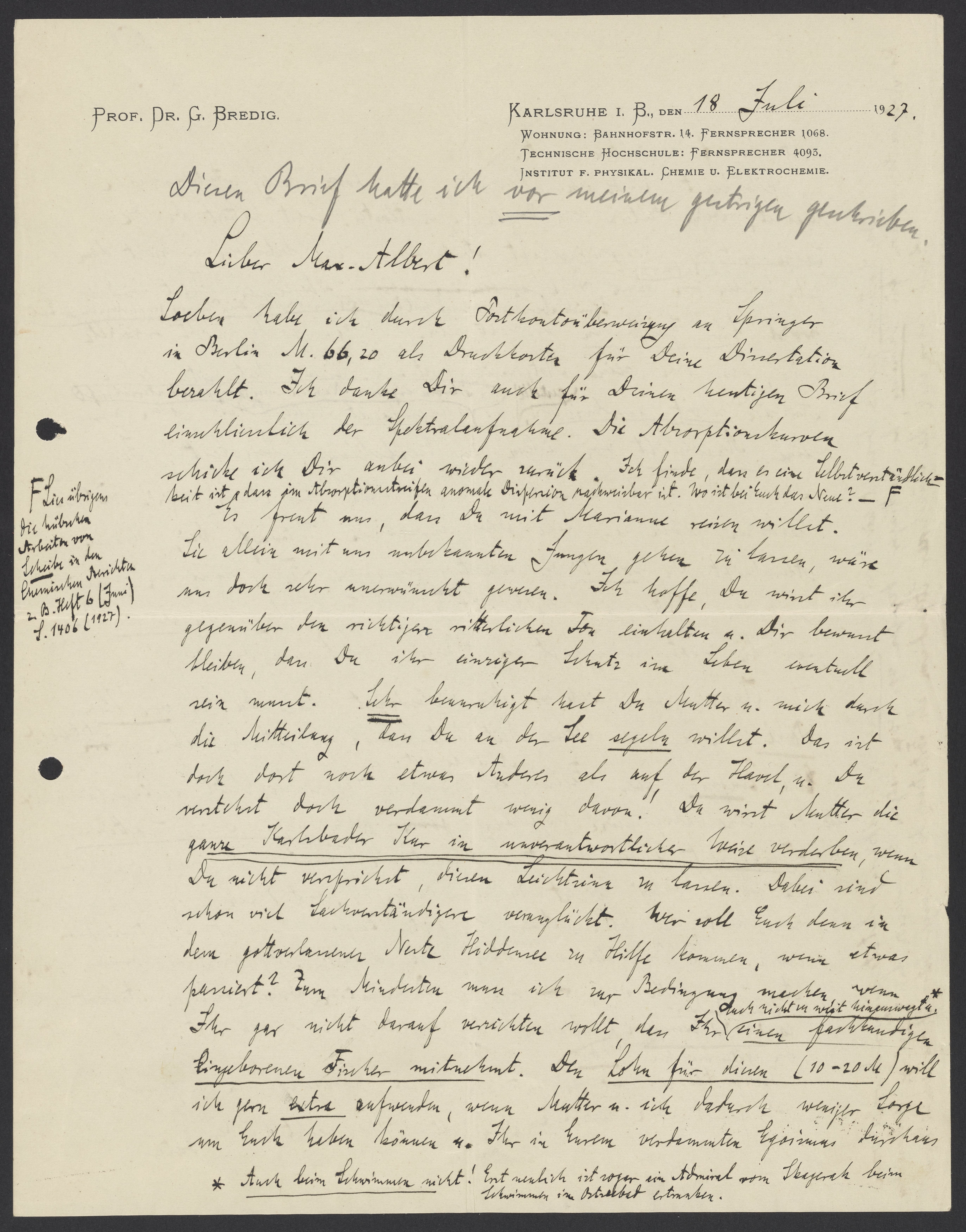 Letter from Georg Bredig to Max Bredig, July 18, 1927