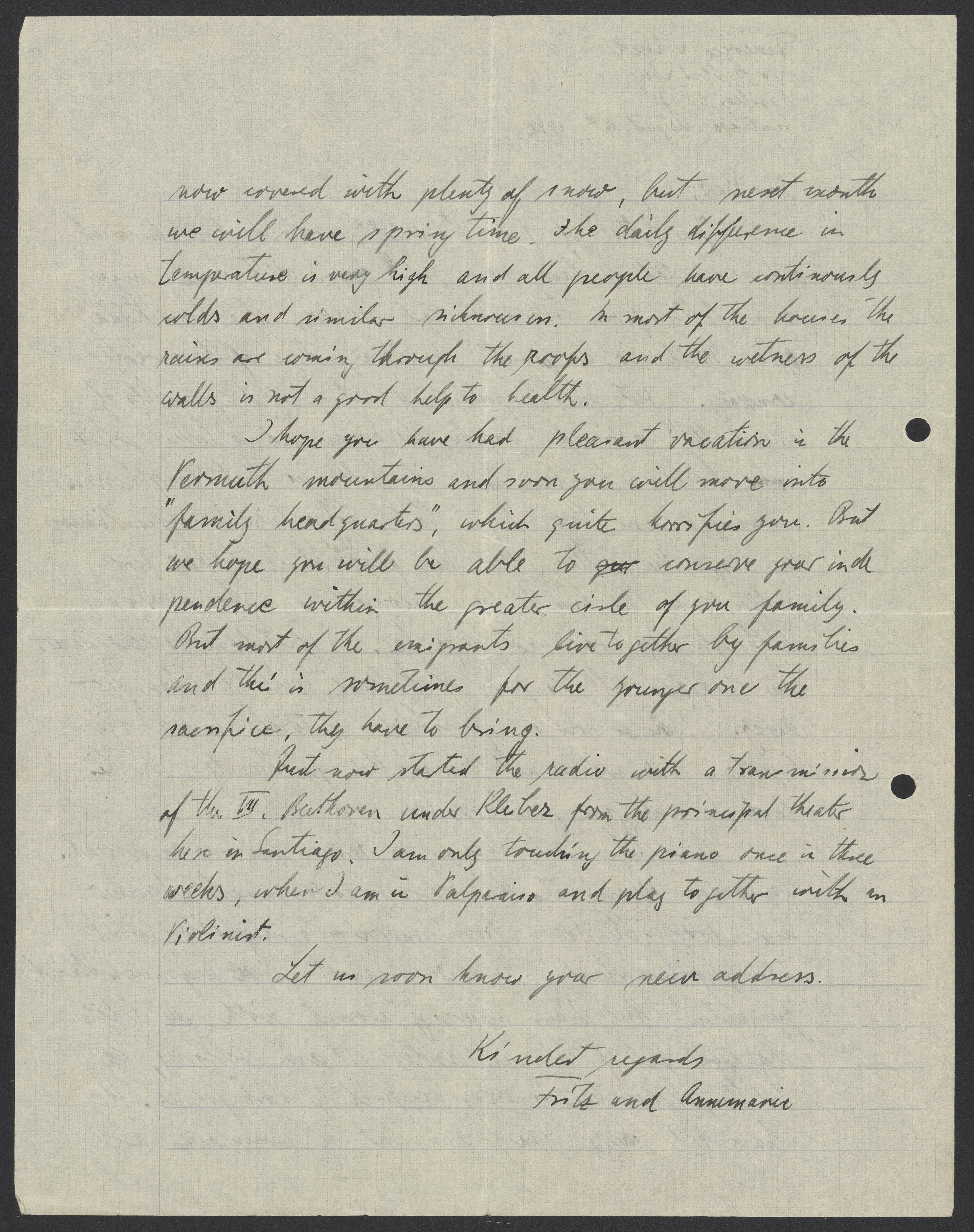 Just now started the radio with a transmission of the III Beethoven under Kleiber from the principal theater here in Santiago. I am only touching the piano once in three weeks, when I am in Valparaiso and play together with an Violinist.