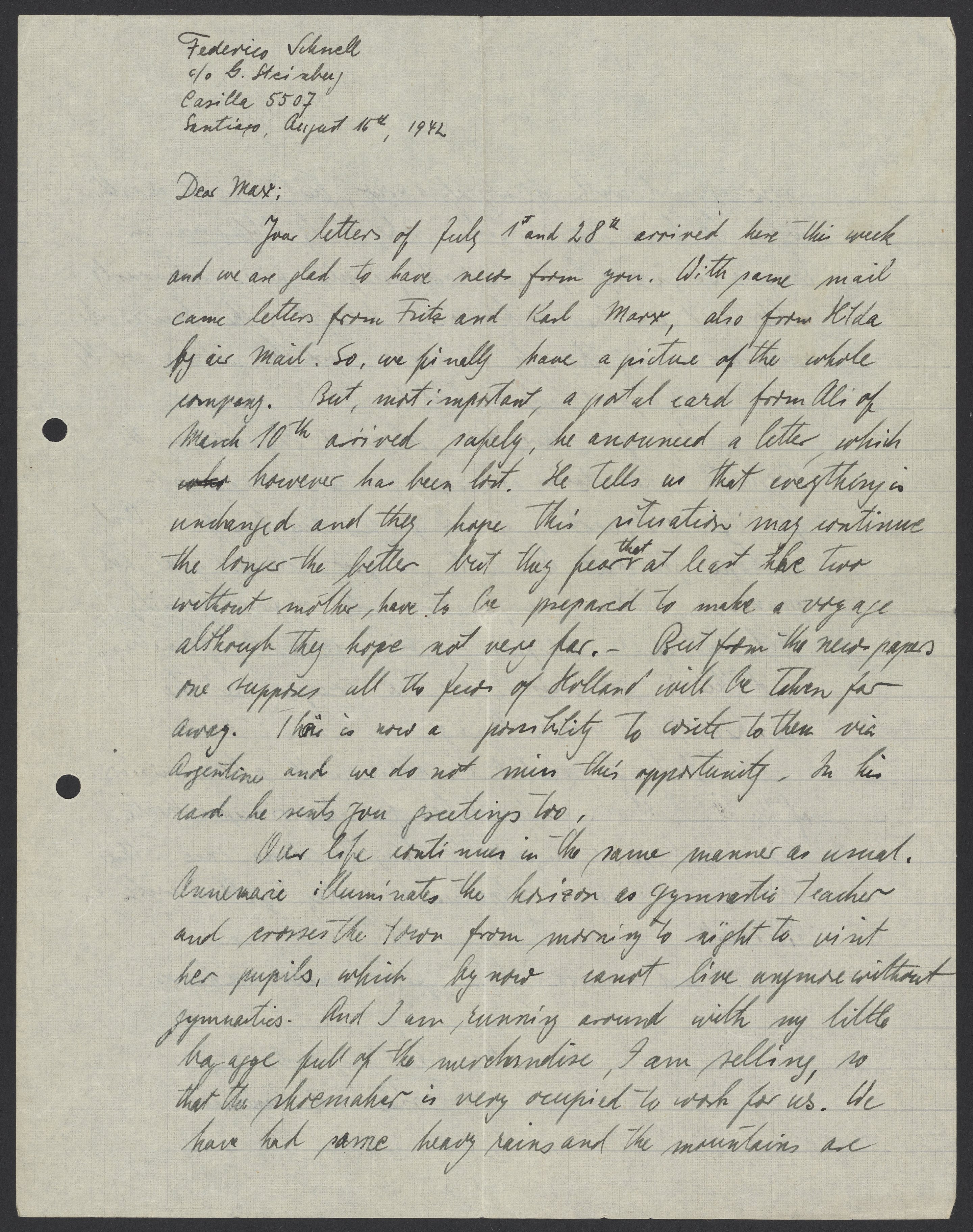 Your letters of July 1st and 28th arrives here this week and we are glad to have news from you. With same mail came letters from Frita and Karl Marx, also from Kilda by air mail. So we finally have a picture of the whole company. But, most important, a postal card from Ali of March 10th arrived safely, he announced a letter, while however has been lost. He tells us that everything is unchanged and they hope this situation may continue the longer the better but they fear that at least the two without mother, have to be prepared to make a voyage although they hope not very far. But from the news papers one supposes all the Jews of Holland will be taken far away. This is now a possibility to write to them via Argentina and we do not miss this opportunity. In his card he sends you greetings too.