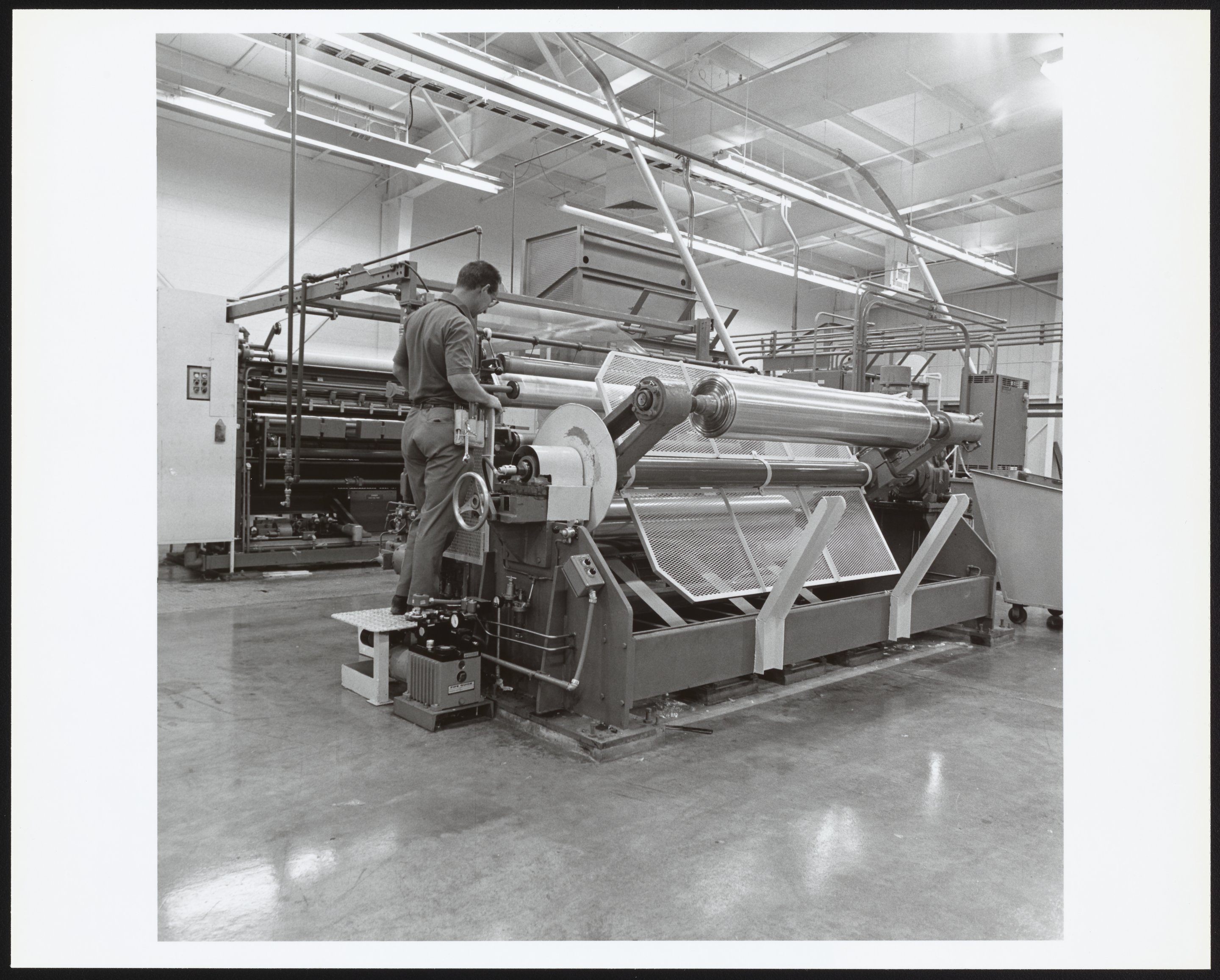 General view of sheets of saran film moving through a rolling machine at a Dow Chemical Company manufacturing facility in Midland, Michigan. Initially developed for the U.S. Army to wrap arms and equipment for transport during World War II, saran plastic was subsequently developed and marketed as Saran Wrap for household use. The employee visible in the photograph is unidentified.