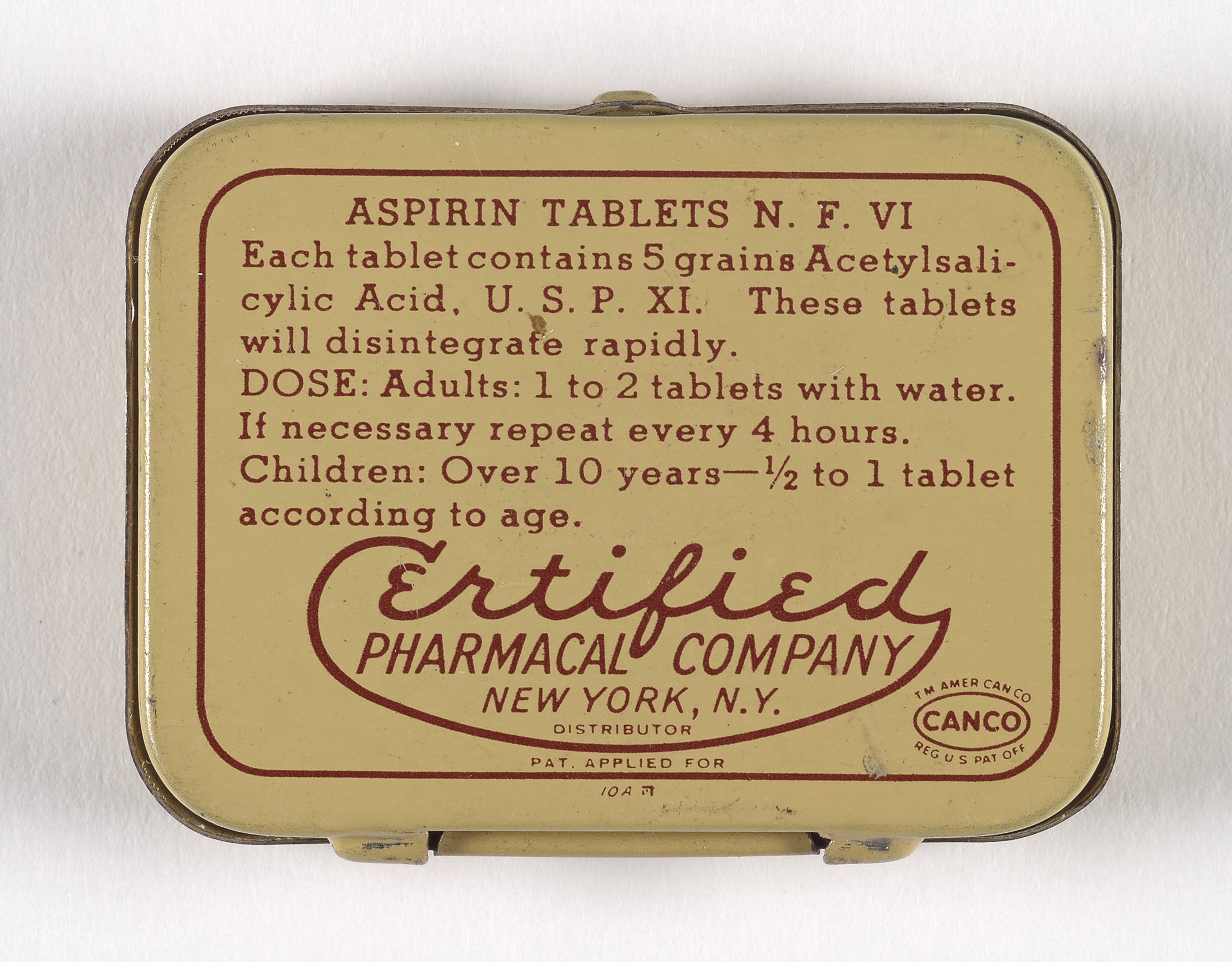 Science History Institute. Certified Pharmacal Company Aspirin Pillbox, 12 Tablet Size. Photograph, 2017. Science History Institute. Philadelphia. https://digital.sciencehistory.org/works/gx41mj36p.