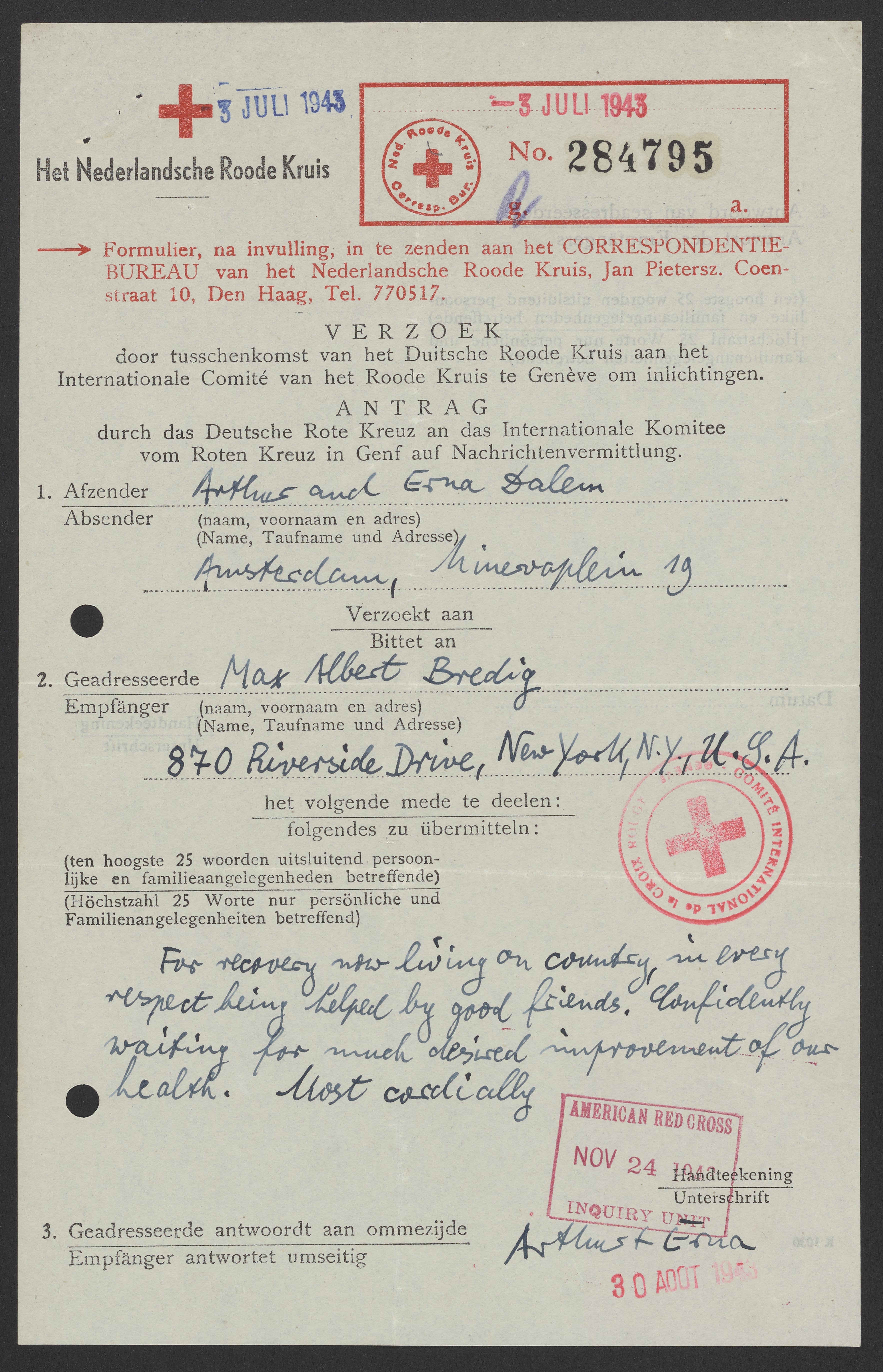 Message from Alfred Schnell (1900-1944) and Eva Schnell (1913-1944) to Max Albert Bredig (1902-1977). Alfred Schnell was a former colleague of Max Bredig. In the early 1940s, Alfred and his wife Eva fled to The Hauge to escape the persecution of the Jewish people. In 1943, Germany invaded the Netherlands and the Schnells went into hiding. In their messages to Max Bredig, they use aliases including Arthur and Erna Dalem, Arthur and Ellen Escaper, and Alfred and Eva Kwik.