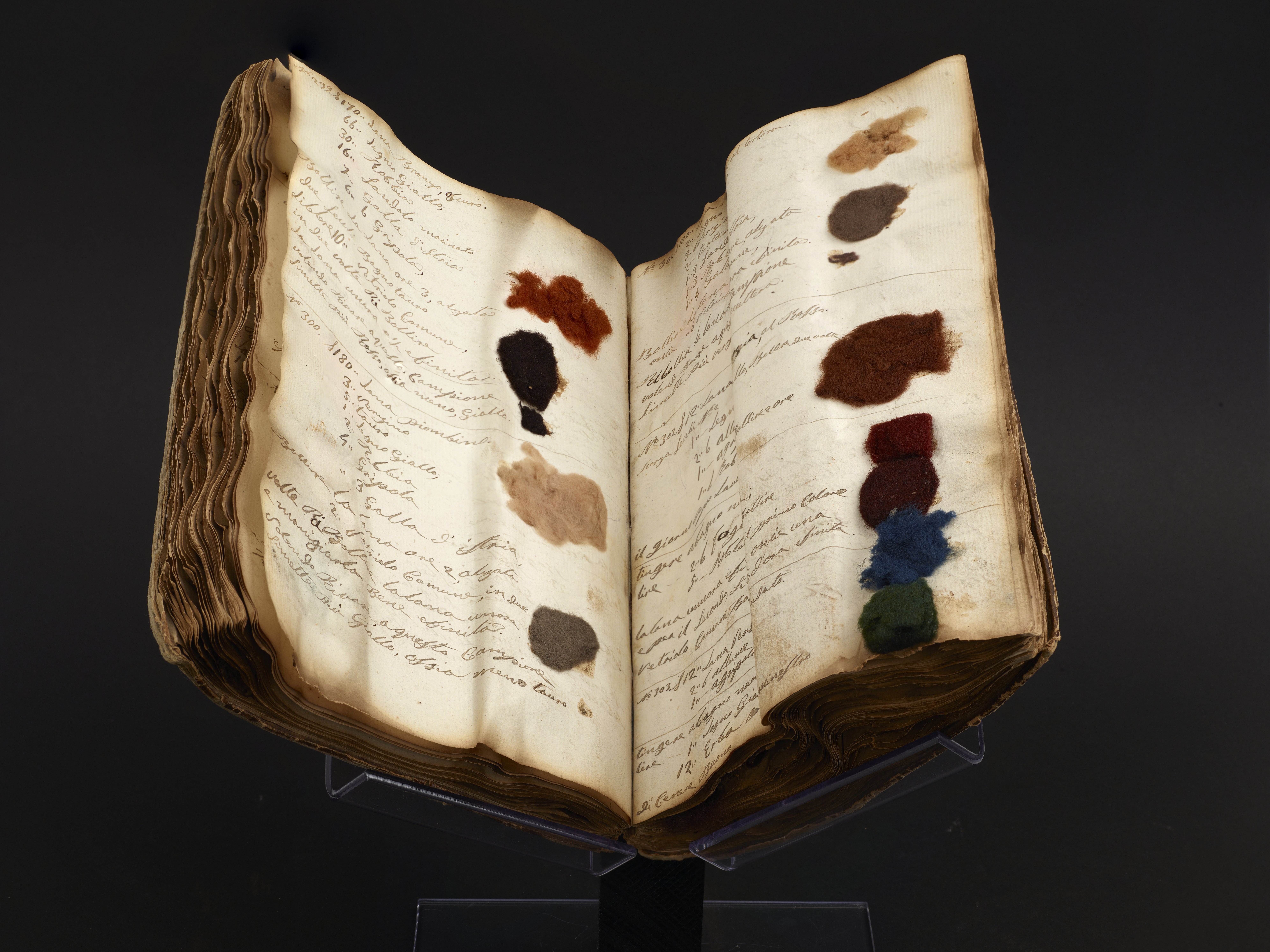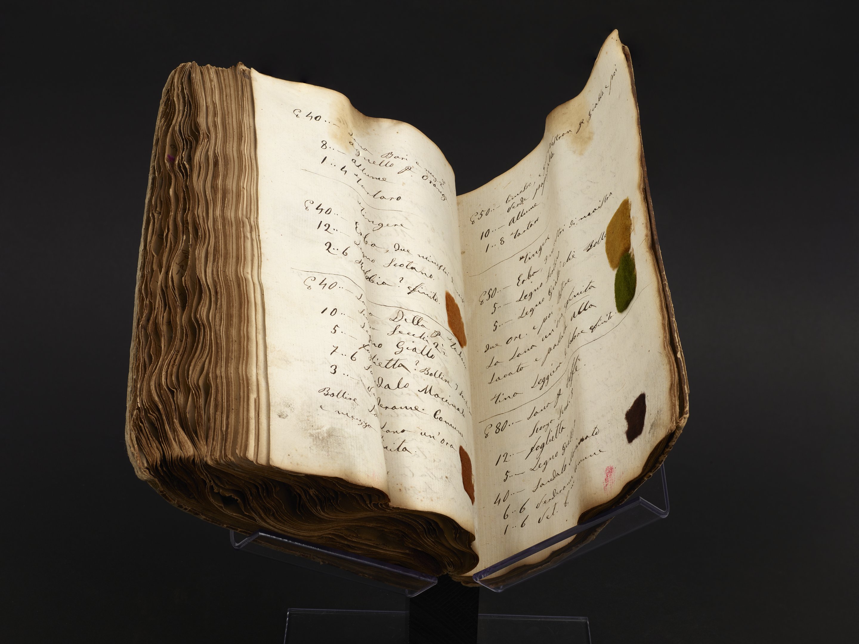 Small JPG1200 x 900px — 147 KBLarge JPG2880 x 2160px — 650 KBFull-sized JPG7968 x 5976px — 4.0 MBOriginal fileTIFF — 7968 x 5976px — 136 MBThis warped and worn nineteenth-century Italian manuscript appears to be a working manual and color inventory of a wool dyer in mid-nineteenth-century Italy. The handwritten entries are dated between 1856 and 1866, suggesting that the notebook was used and added to over a period of time. The work includes more than 500 numbered and itemized recipes for dyes. Recipes are illustrated with more than 800 wool and fabric samples adhered to the pages. The samples range in colors from shades of brown to vivid fuchsia, turquoise, and mustard. The samples include fabrics of wool, felt, and cotton, as well as raw wool and coils of yarn. Ingredients listed include mud, urine, arsenic, and vitriol. Pages 192-219 contain longer descriptions of dying processes, one attributed to Giacomo Udinese and another to Cesare Bizzi.