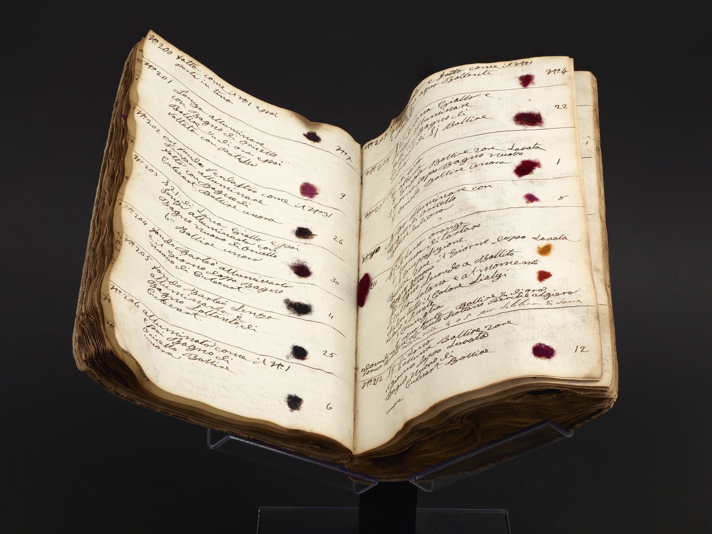 Small JPG1200 x 900px — 147 KBLarge JPG2880 x 2160px — 650 KBFull-sized JPG7968 x 5976px — 4.0 MBOriginal fileTIFF — 7968 x 5976px — 136 MBThis warped and worn nineteenth-century Italian manuscript appears to be a working manual and color inventory of a wool dyer in mid-nineteenth-century Italy. The handwritten entries are dated between 1856 and 1866, suggesting that the notebook was used and added to over a period of time. The work includes more than 500 numbered and itemized recipes for dyes. Recipes are illustrated with more than 800 wool and fabric samples adhered to the pages. The samples range in colors from shades of brown to vivid fuchsia, turquoise, and mustard. The samples include fabrics of wool, felt, and cotton, as well as raw wool and coils of yarn. Ingredients listed include mud, urine, arsenic, and vitriol. Pages 192-219 contain longer descriptions of dying processes, one attributed to Giacomo Udinese and another to Cesare Bizzi.