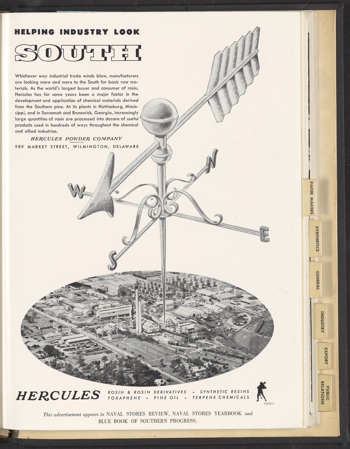 Print advertisement for Hercules Powder Company rosin and rosin derivatives. The advertisement shows an enlarged illustration of a weather vane pointing south, above an aerial photograph of an industrial building. The accompanying text describes Hercules Powder Company's use of the Southern pine to produce chemical materials such as rosin and other industrial products. The text refers to Hercules as "the world's largest buyer and consumer of rosin." This advertisement appeared in Naval Stores Review, Naval Stores Yearbook, and Blue Book of Southern Progress.