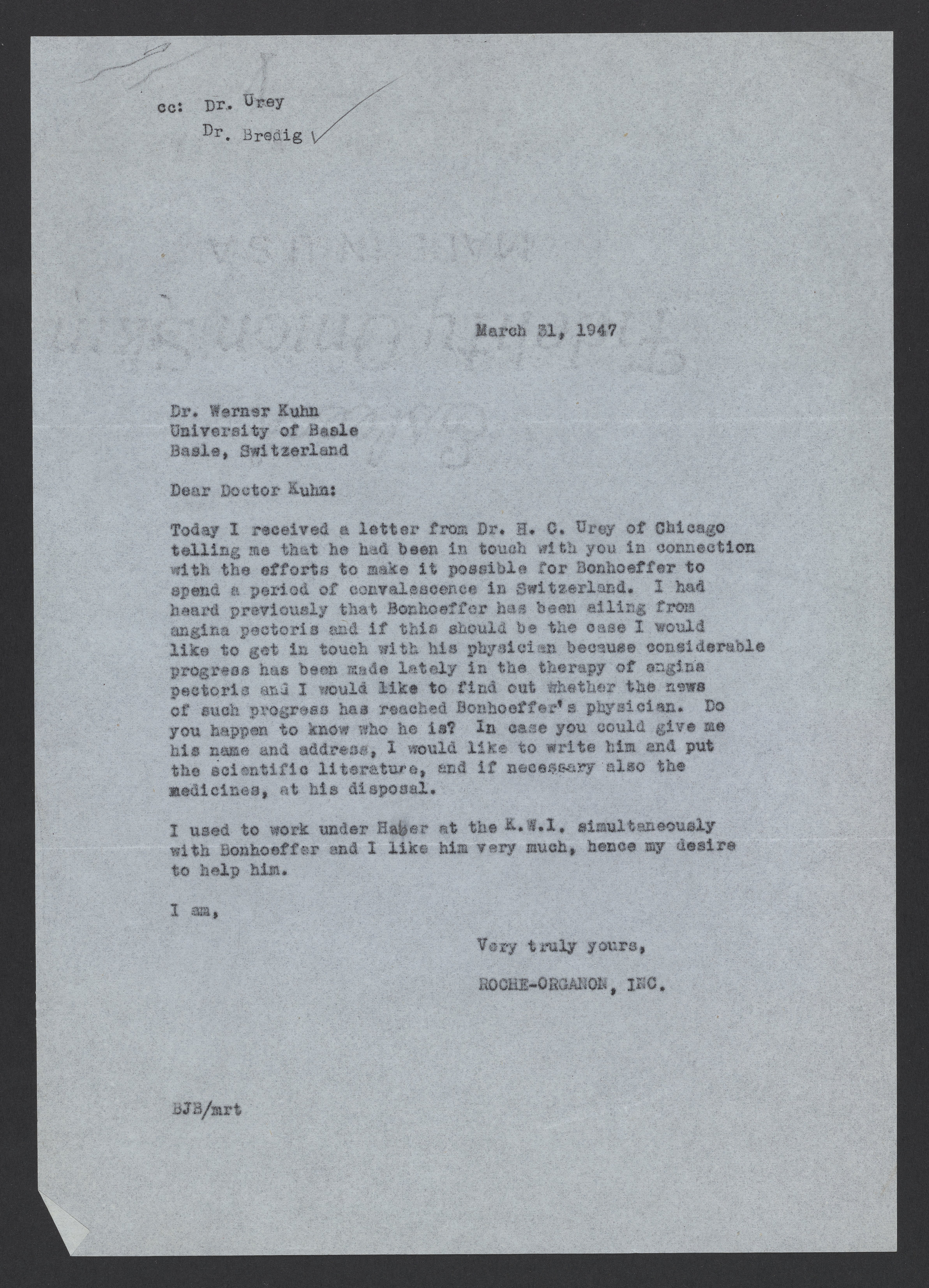 Bernard J. Brent writes to Werner Kuhn (1899-1963), a Swiss physical chemist who developed the first model of the viscosity of polymer solutions using statistical mechanics. Brent requests contact information for Karl-Friedrich Bonhoeffer's (1899-1957) physician as he intends to ensure this physician is aware of the latest progress in the treatment of angina pectoris (a symptom of coronary artery disease). Bonhoeffer has been suffering from angina pectoris, causing the concern of friends and family.