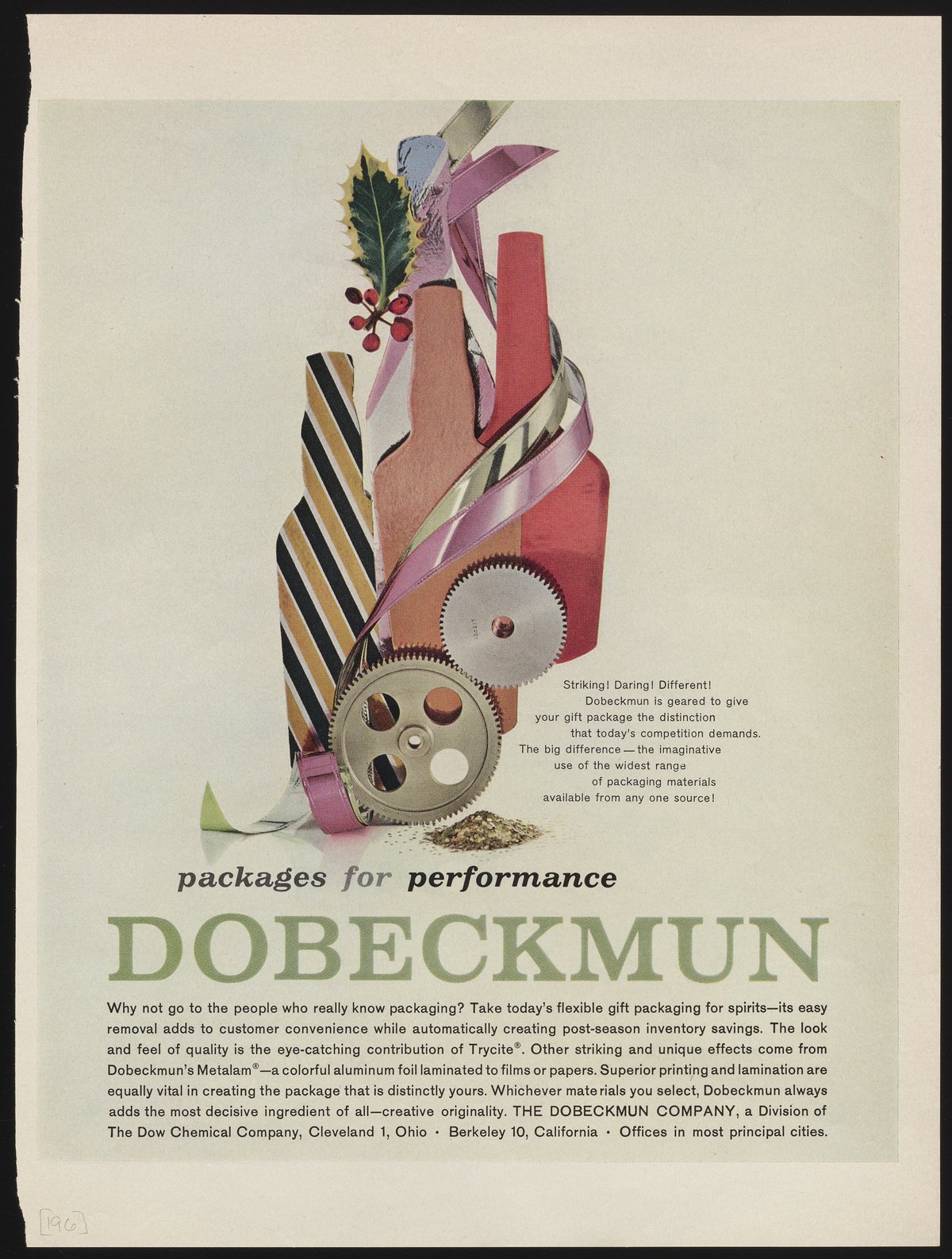 Dow Chemical Company. “Packages for Performance: Dobeckmun,” n.d. Advertisements from the Dow Chemical Historical Collection, Box 7. Science History Institute. Philadelphia. https://digital.sciencehistory.org/works/h128nf29t.