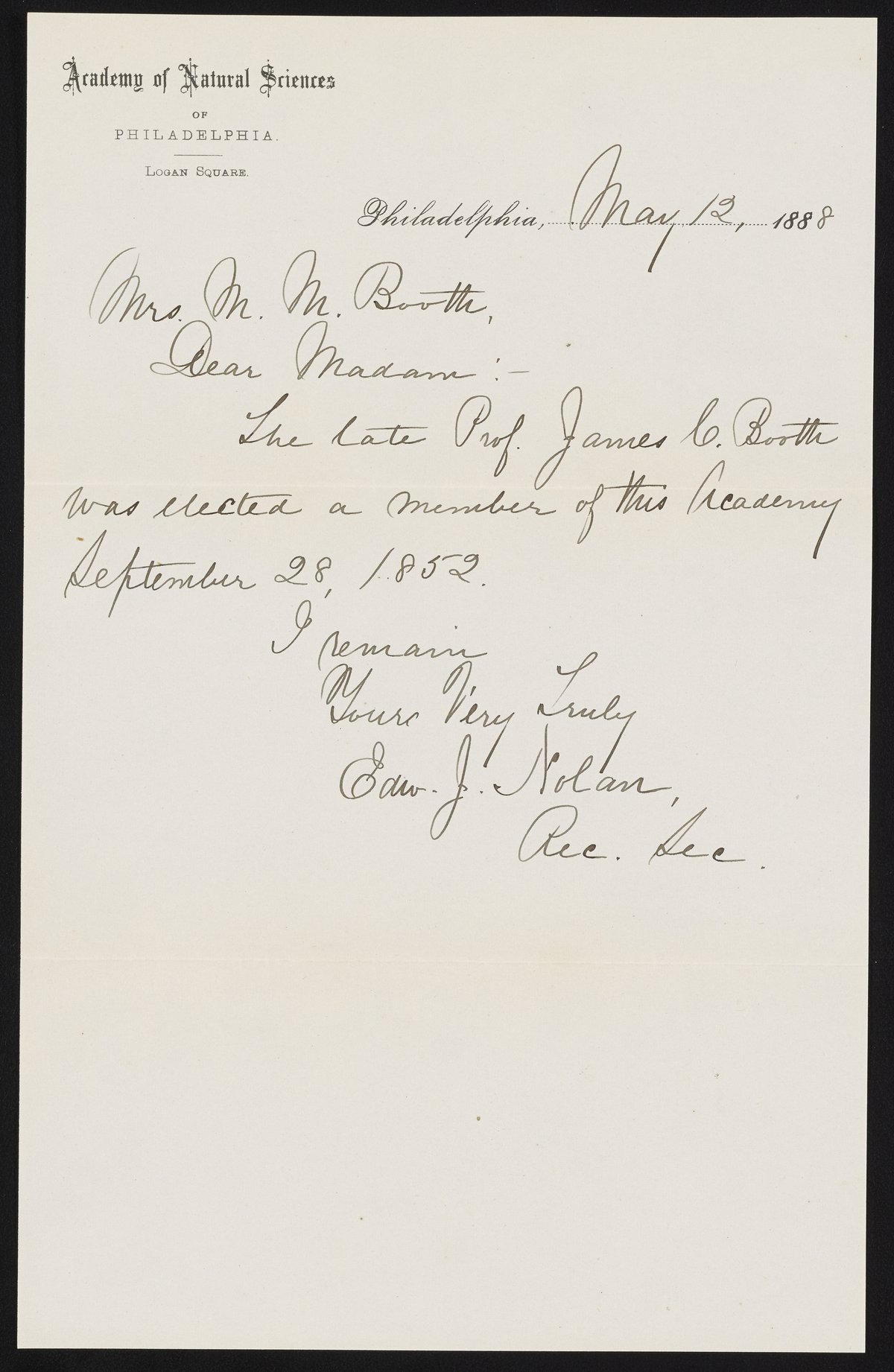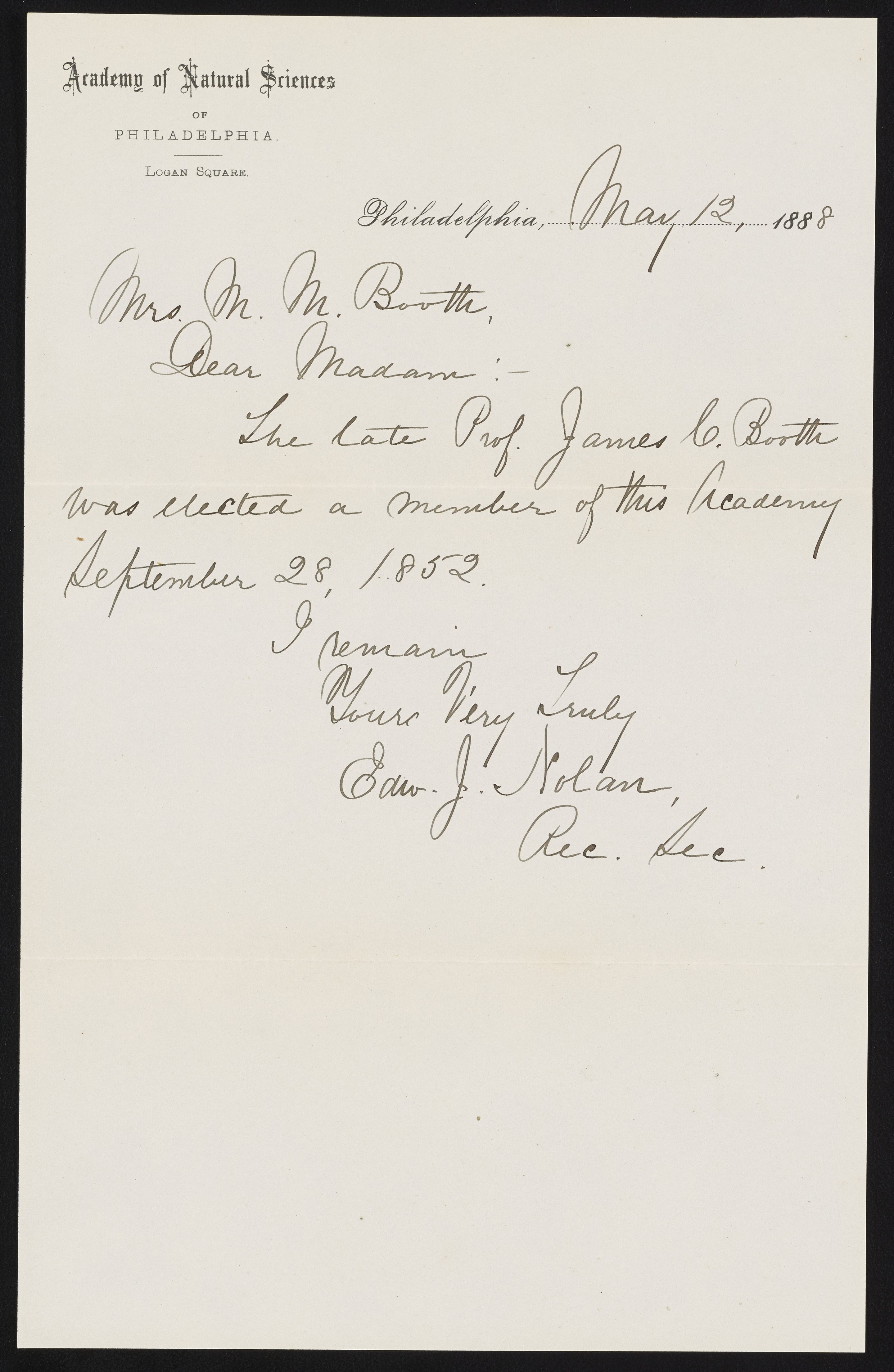 Edward J. Nolan, recording secretary of the Academy of Natural Sciences, writes to Margaret M. Booth née Cardeza to inform her of her late husband, James Curtis Booth (1810-1888)'s, date of election to the academy.