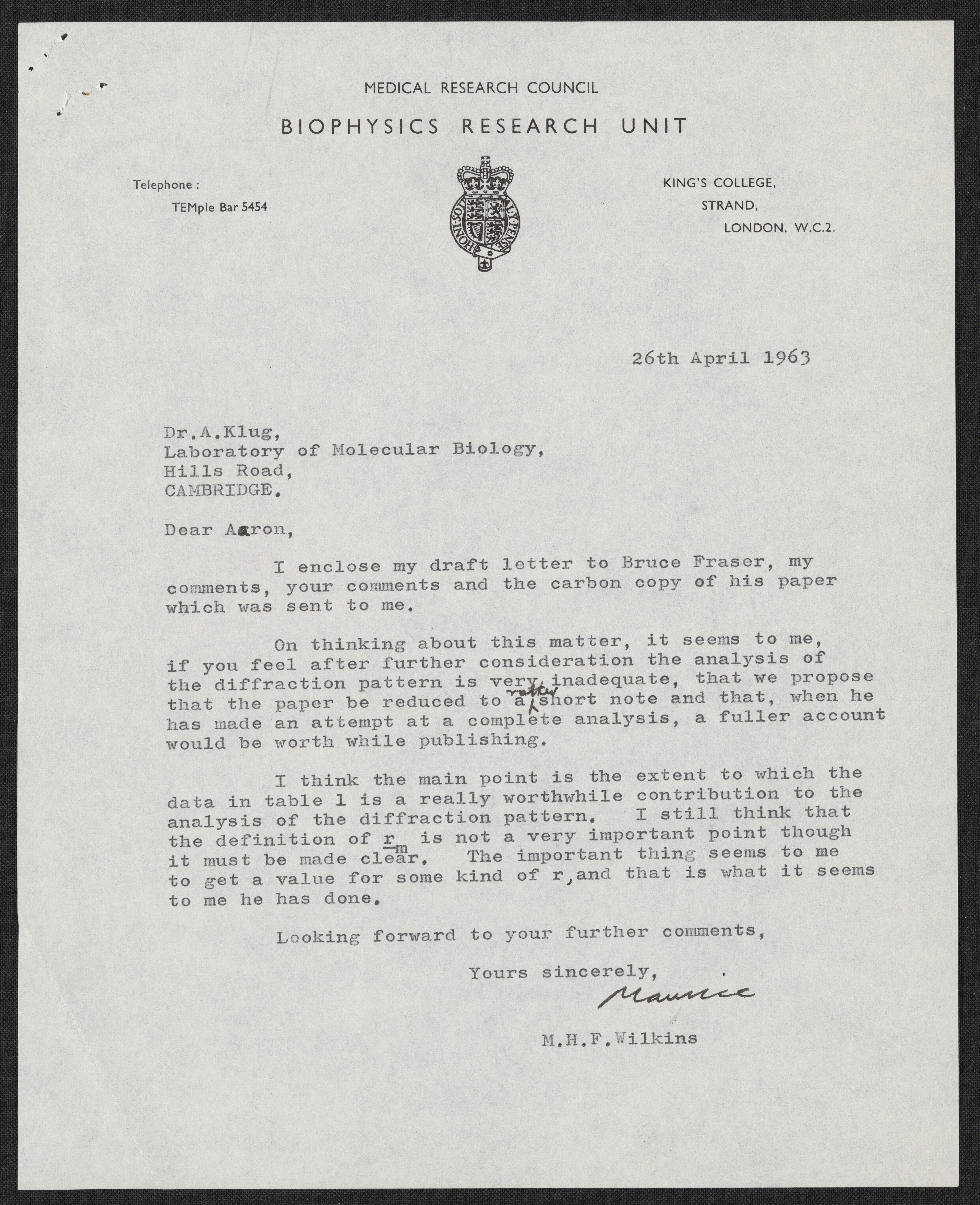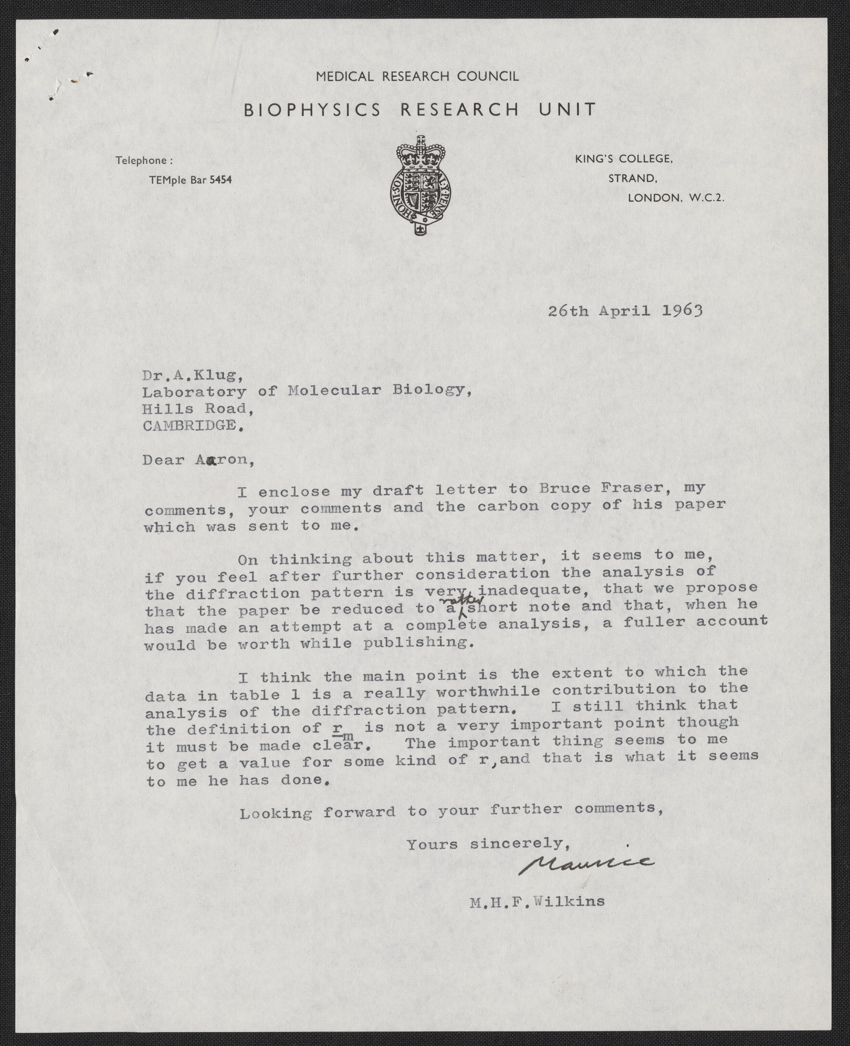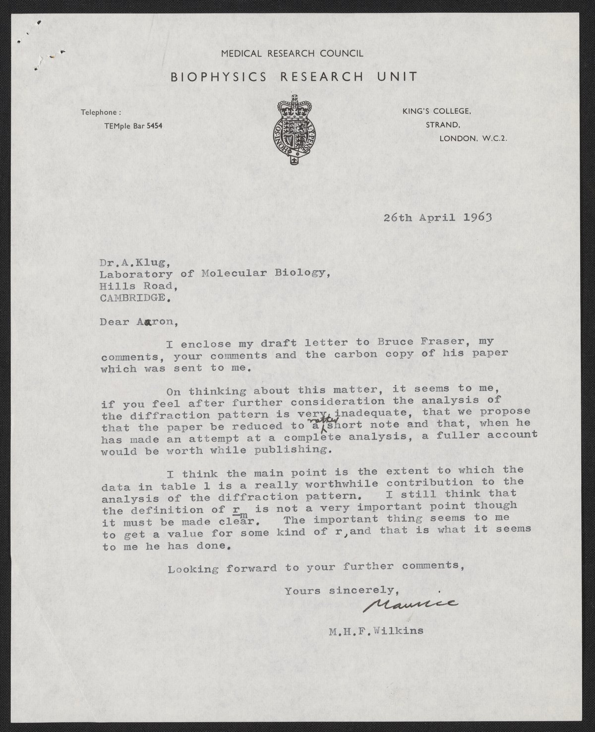 Letter from Maurice Wilkins to Aaron Klug, April 26, 1963