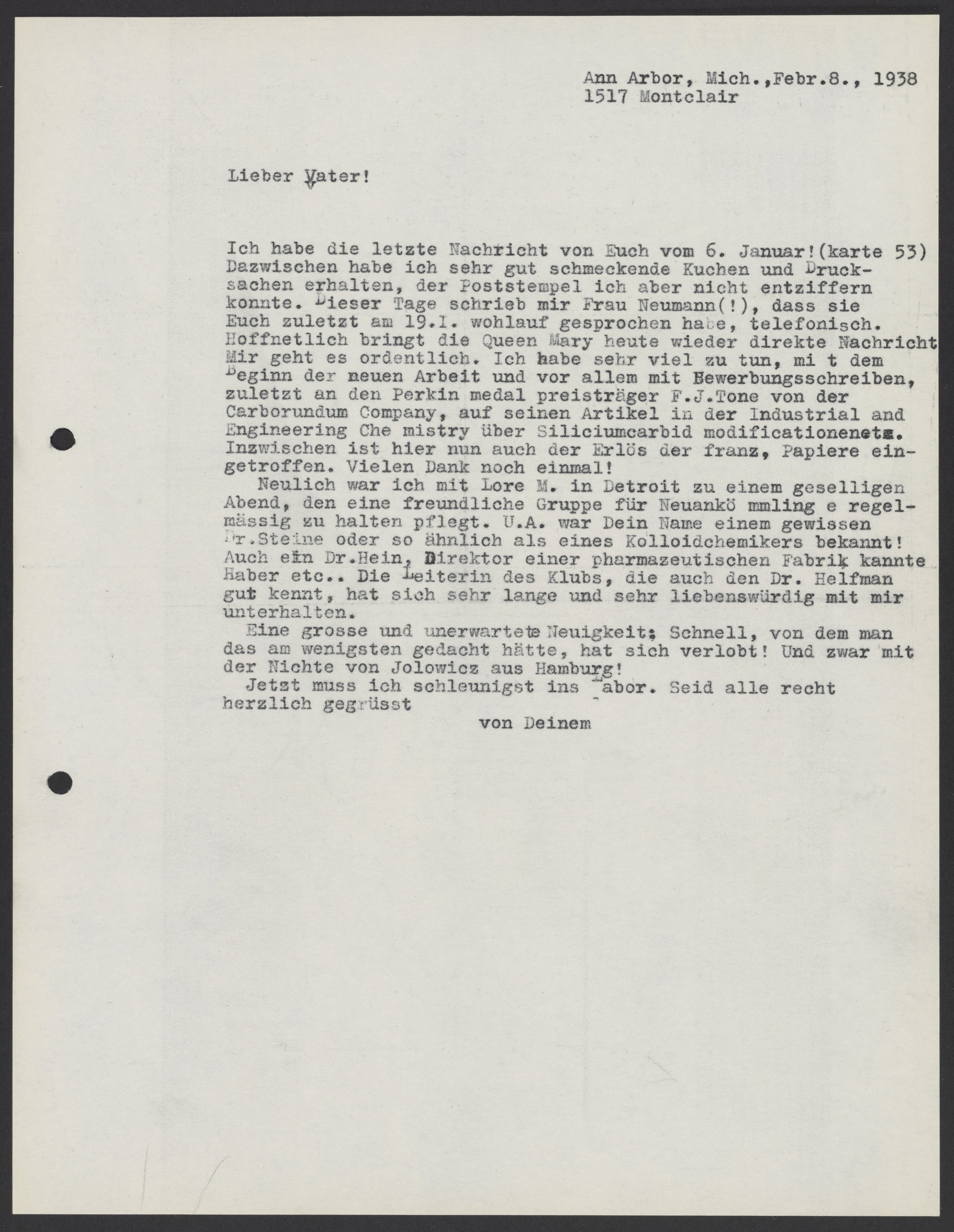 Letter from Max Bredig to Georg Bredig, February 8, 1938