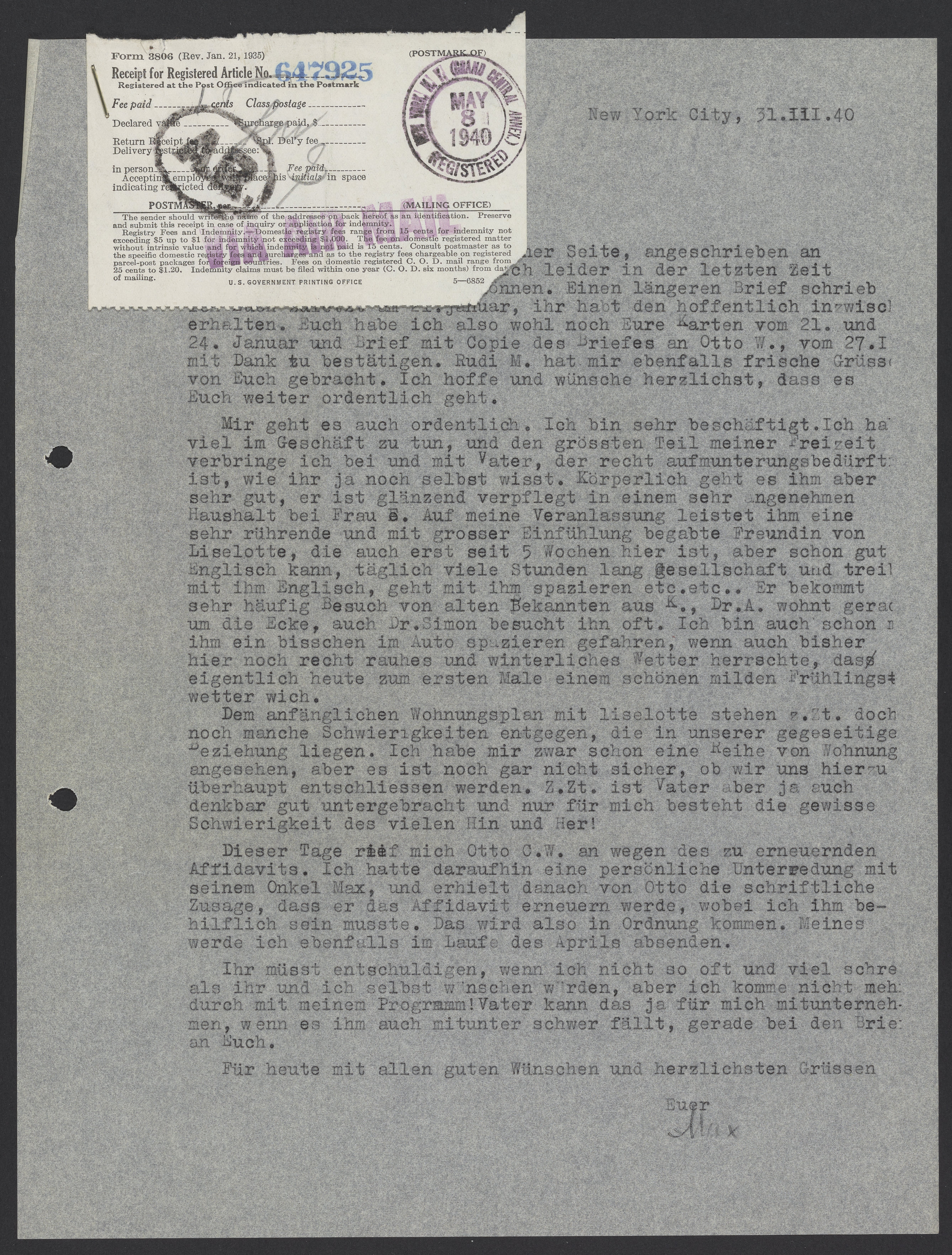 Dieser Tage rief mich Otto C.W. an wegen des zu erneuernden Affidavits. Ich hatte daraufhin eine persönliche Unterredung mit seinem Onkel Max, und erhielt danach von Otto die schriftliche Zusage, dass er das Affidavit erneuern werde, wobei ich ihm behilflich sein musste. Das wird also in Ordnung kommen. Meines werde ich ebenfalls in Laufe des Aprils absenden .