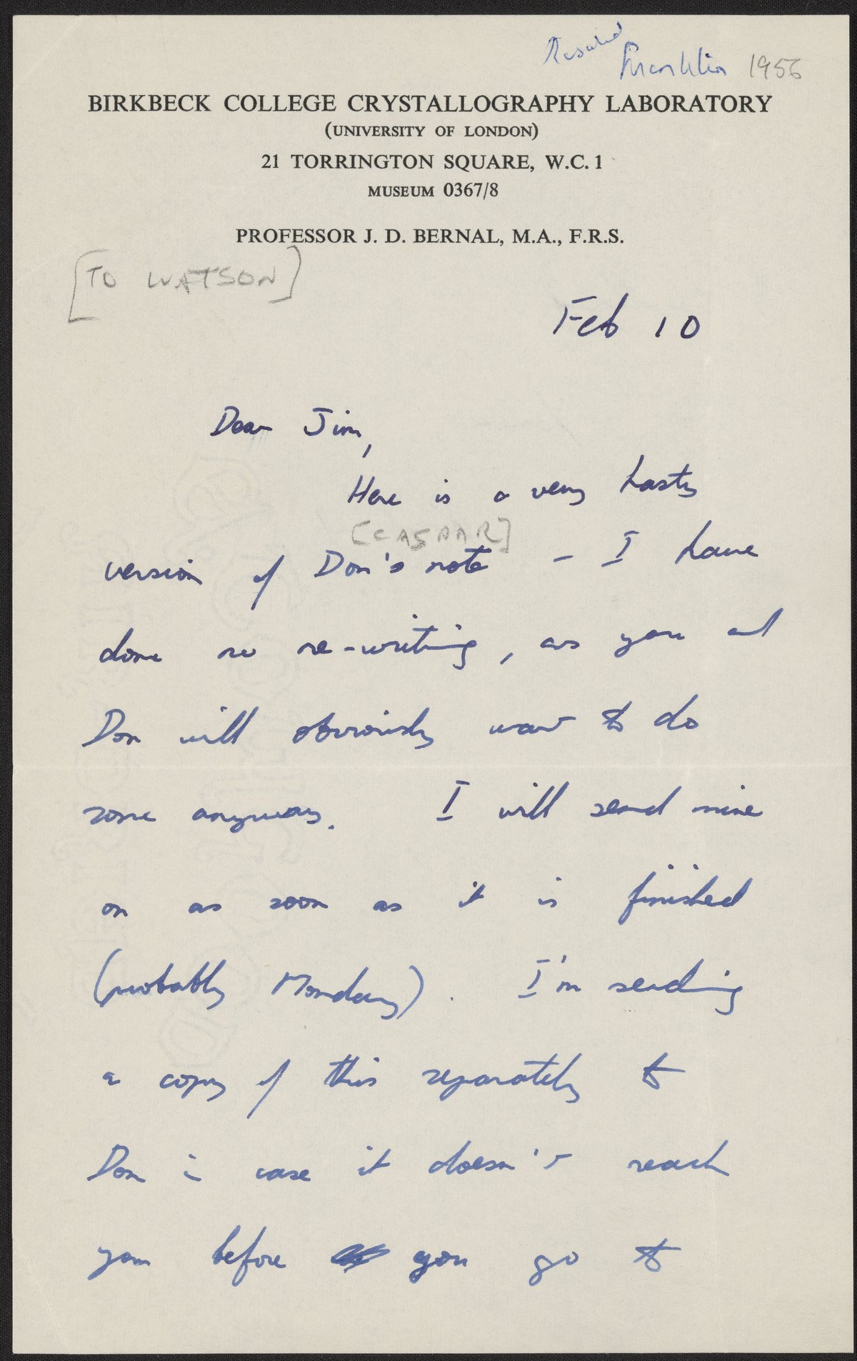 Letter from Rosalind Franklin to James D. Watson, February 10, 1956