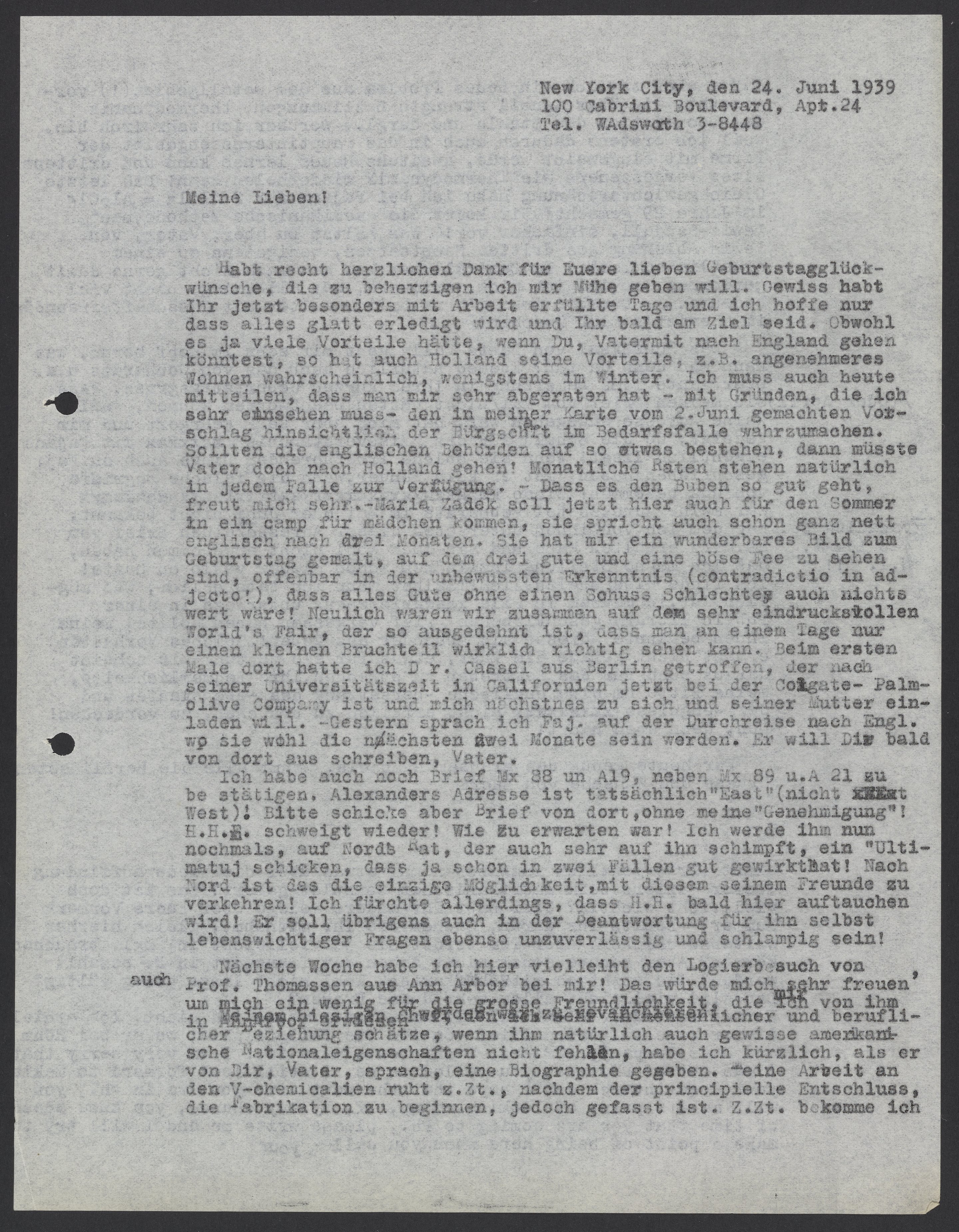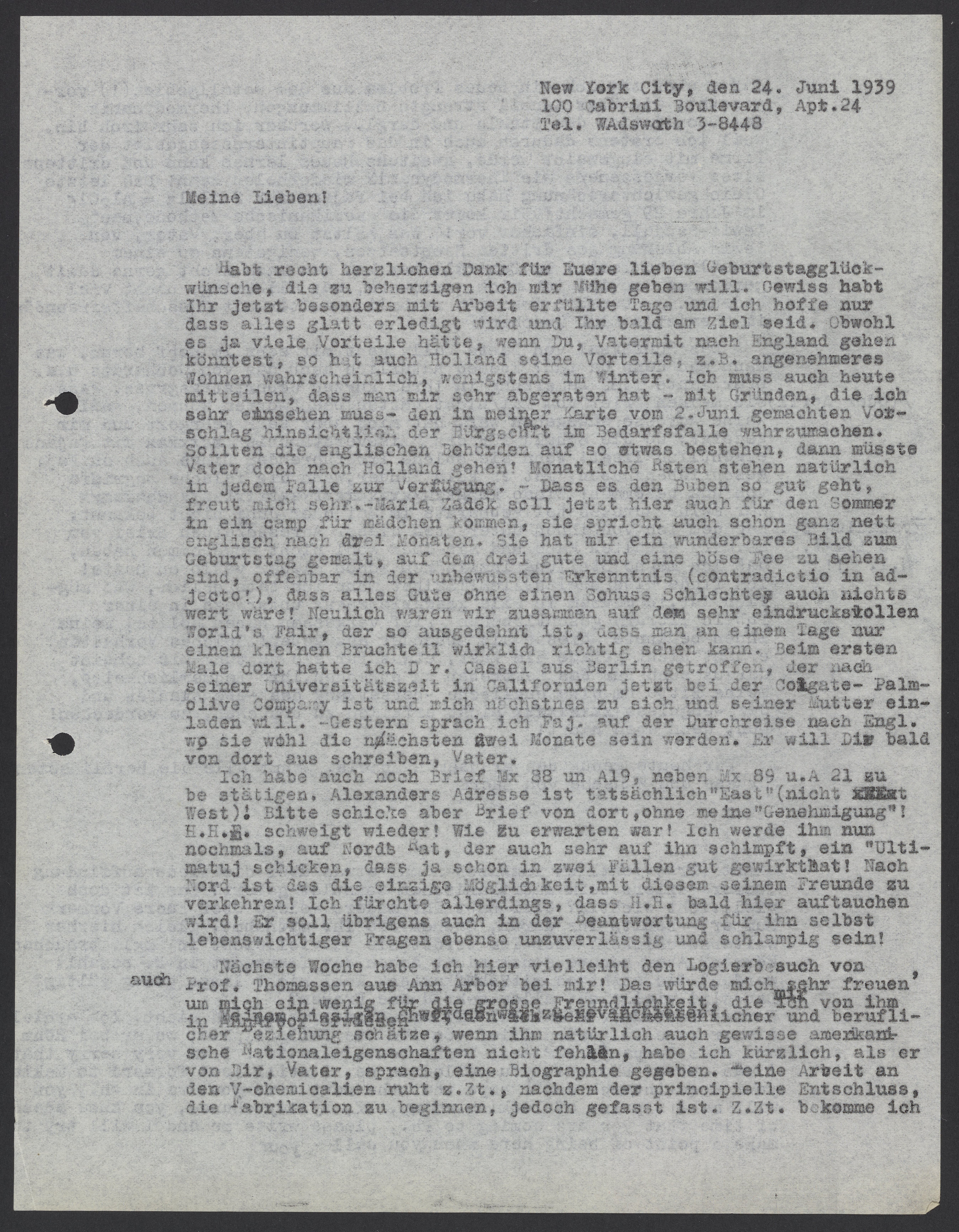 Letter from Max Bredig to Georg Bredig and Marianne and Viktor Homburger, June 24, 1939