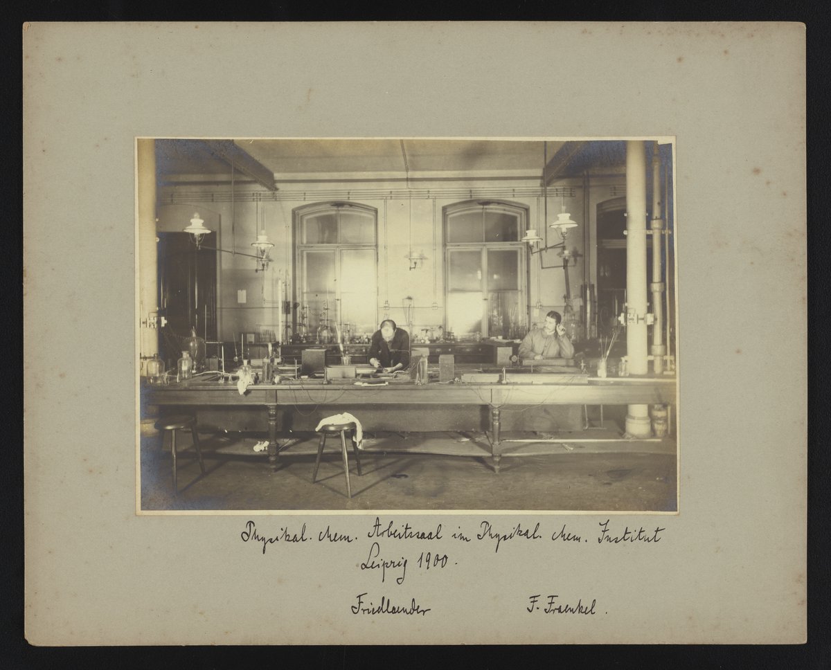 Black and white photograph of scientists in a laboratory at the University of Leipzig shown working at long tables cluttered with scientific apparatuses and glassware. The scientists in the photograph are identified by an inscription beneath the photo as "Friedlaender" (left) and "F. Fraenkel" (right).