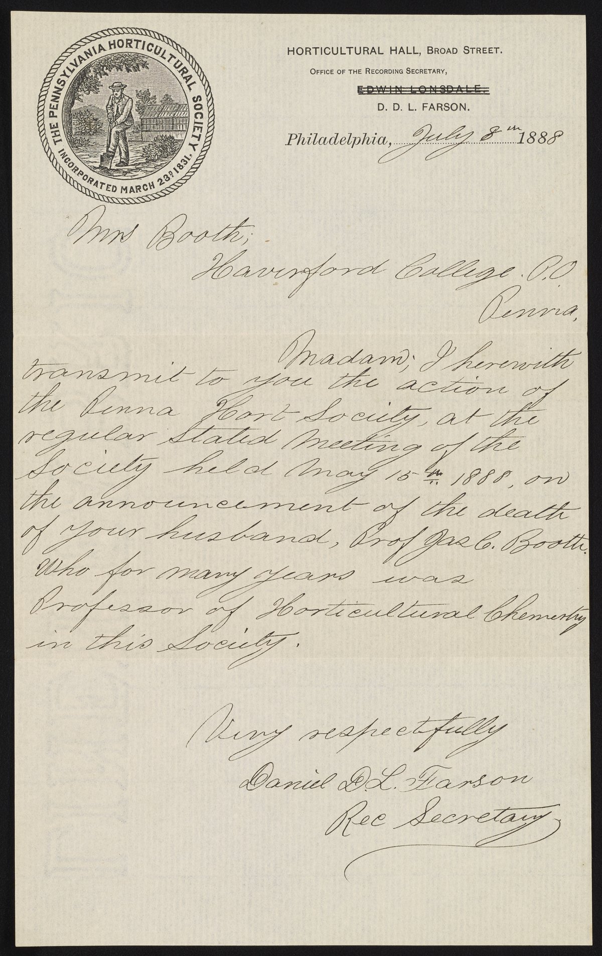Letter from Daniel D.L. Farson to Margaret M. Booth, July 8, 1888