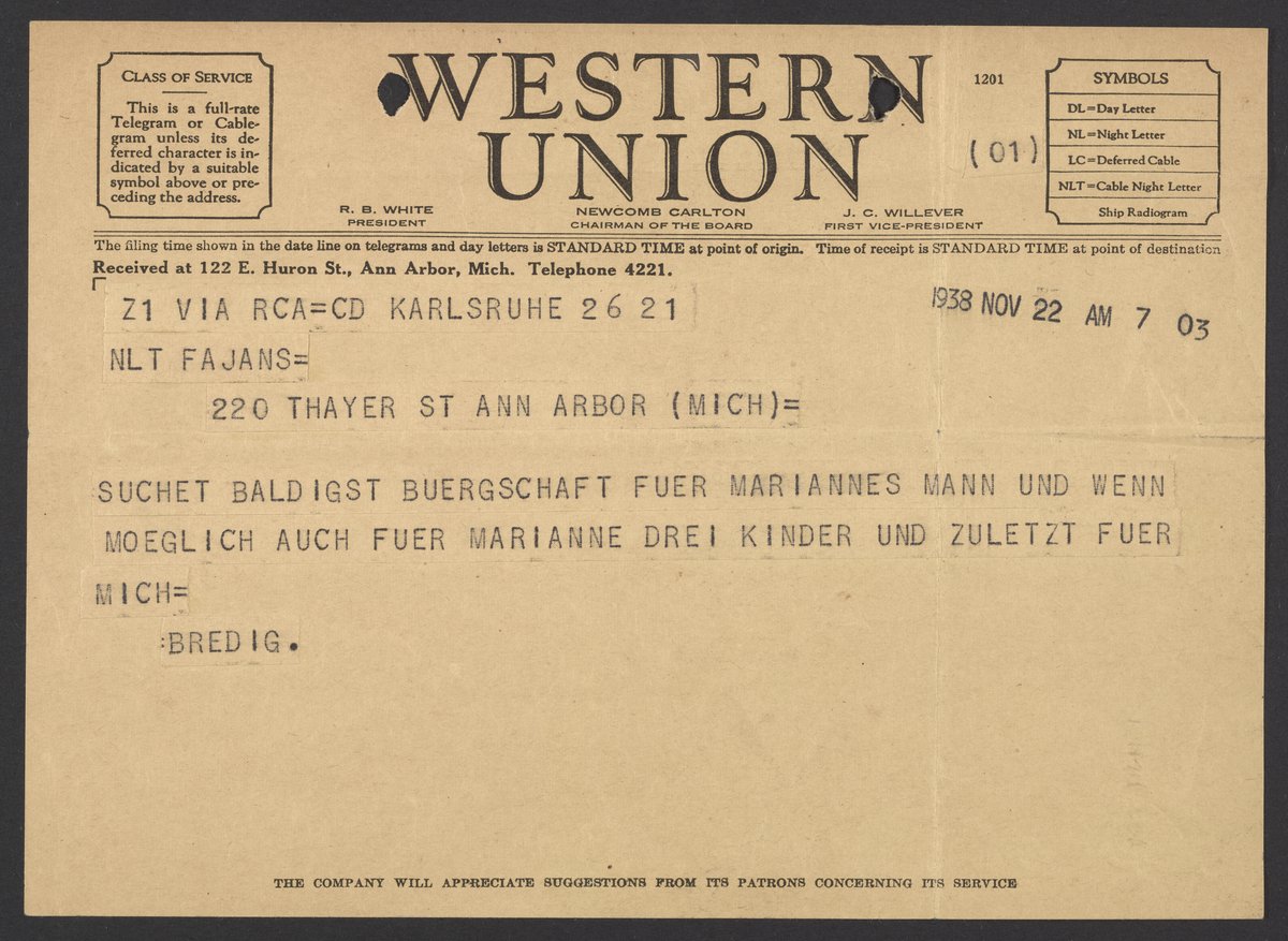 Telegram from Georg Bredig to Max Bredig, November 22, 1938
