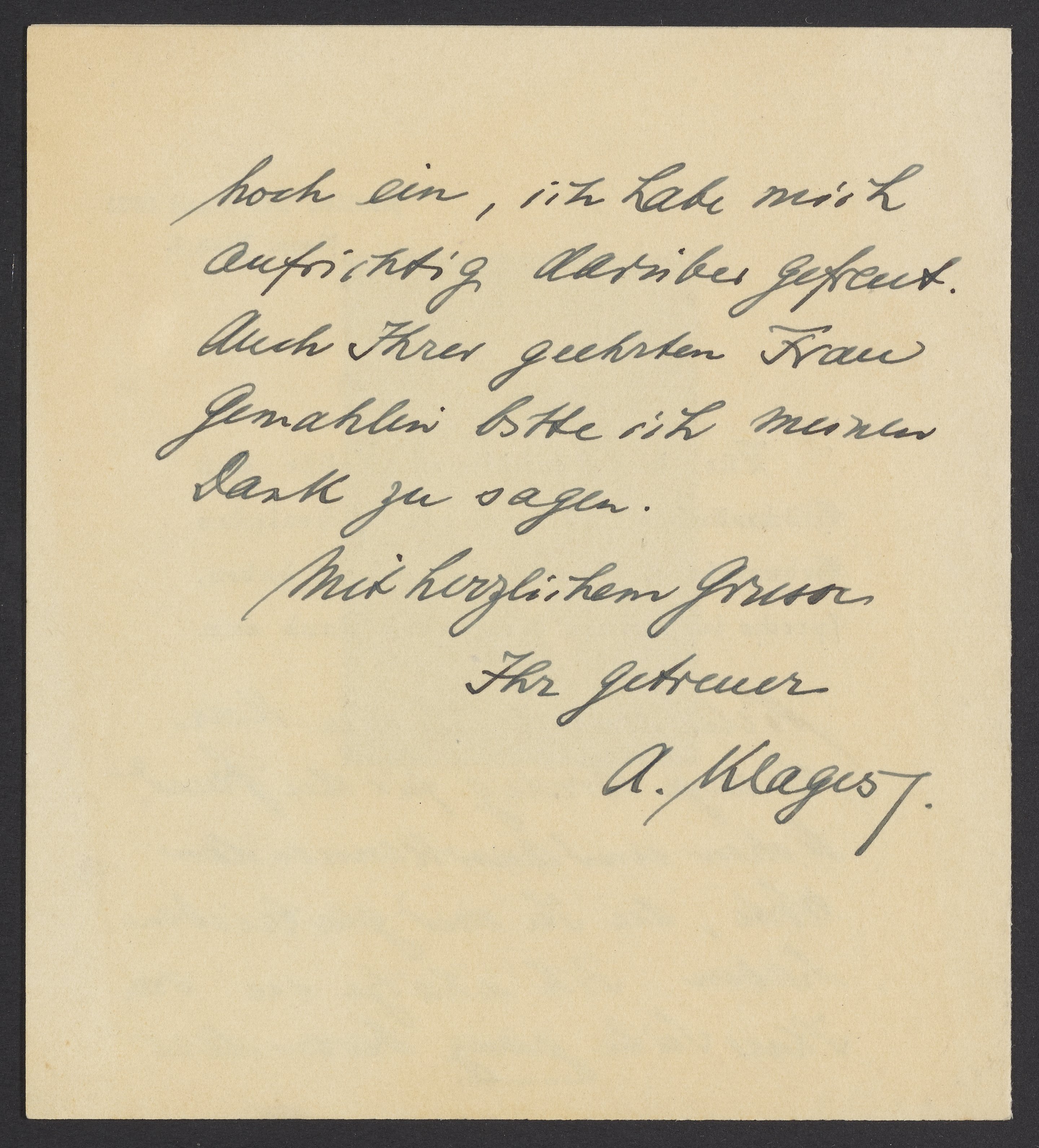 hoch ein, ich habe mich aufrichtig darüber gefreut. Auch Ihrer geehrten Frau Gemahlin bitte ich meinen Dank zu sagen.