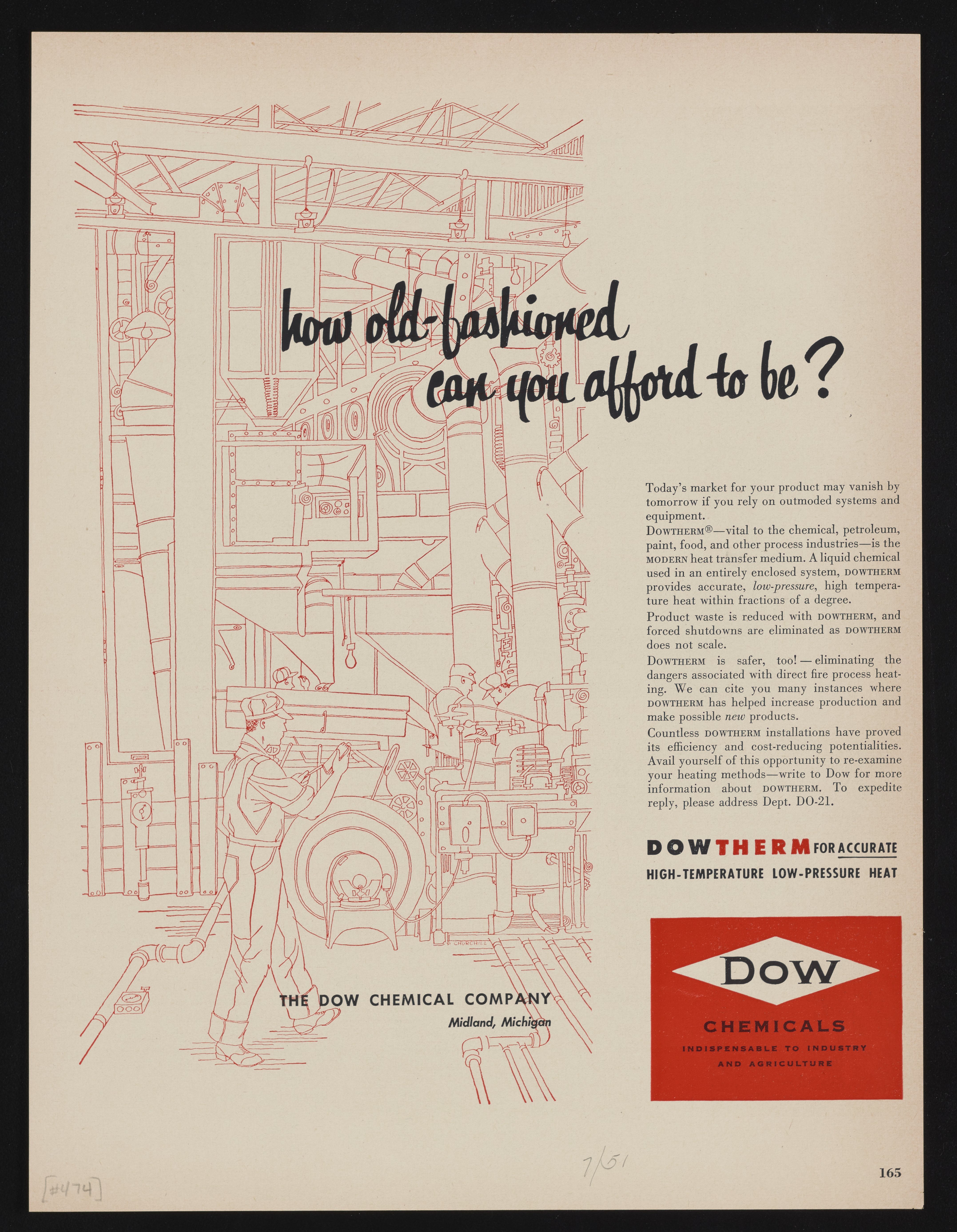 Dow Chemical Company. “How Old Fashioned Can You Afford To Be?,” 1950–1959. Advertisements from the Dow Chemical Historical Collection, Box 8. Science History Institute. Philadelphia. https://digital.sciencehistory.org/works/hkpko33.
