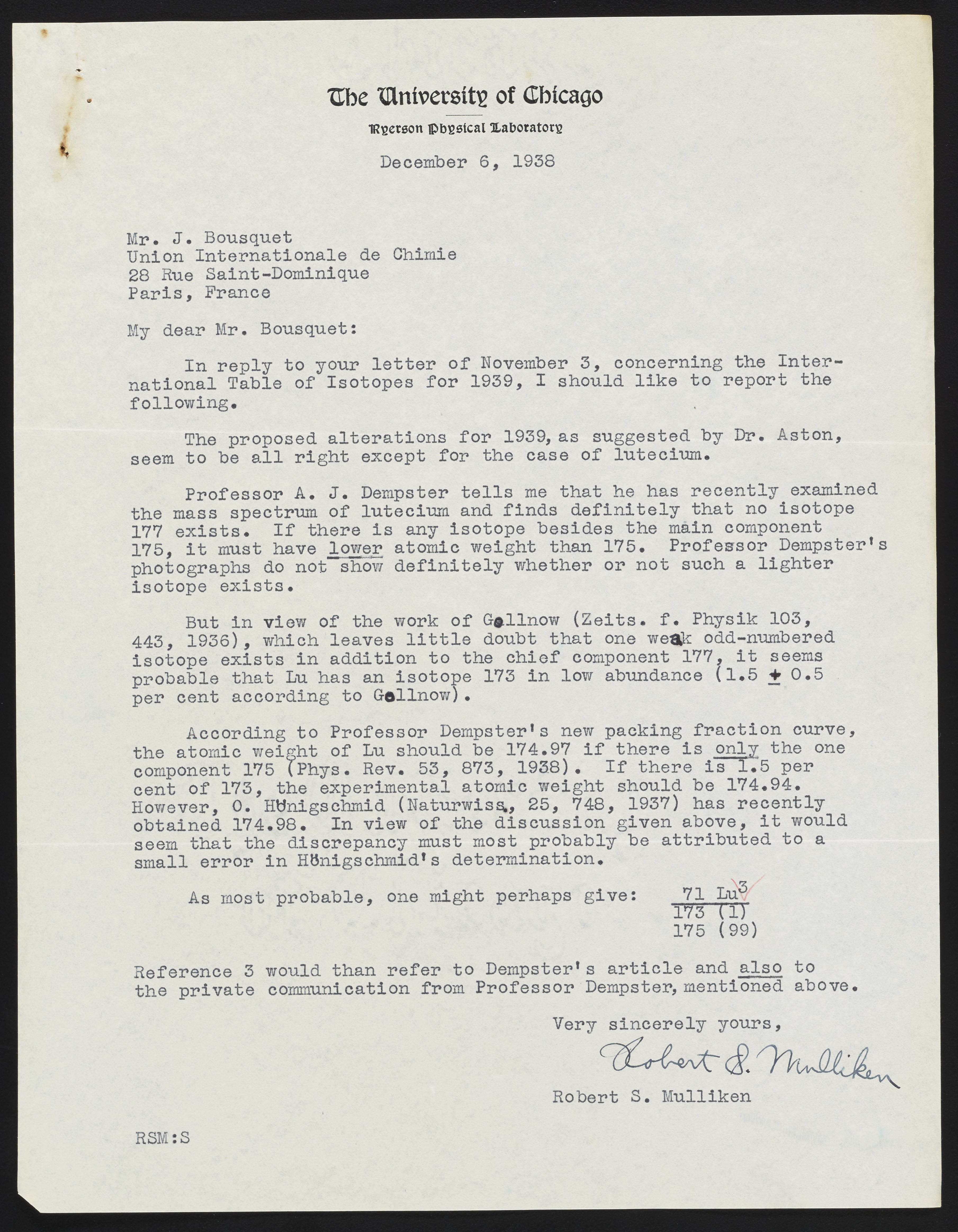 Mulliken, Robert Sanderson. “Letter from Robert S. Mulliken to J. Bousquet,” December 6, 1938. Records of the Commission on Atomic Weights and Isotopic Abundances of IUPAC, Box 13, Folder 20. Science History Institute. Philadelphia. https://digital.sciencehistory.org/works/hm50tr751.