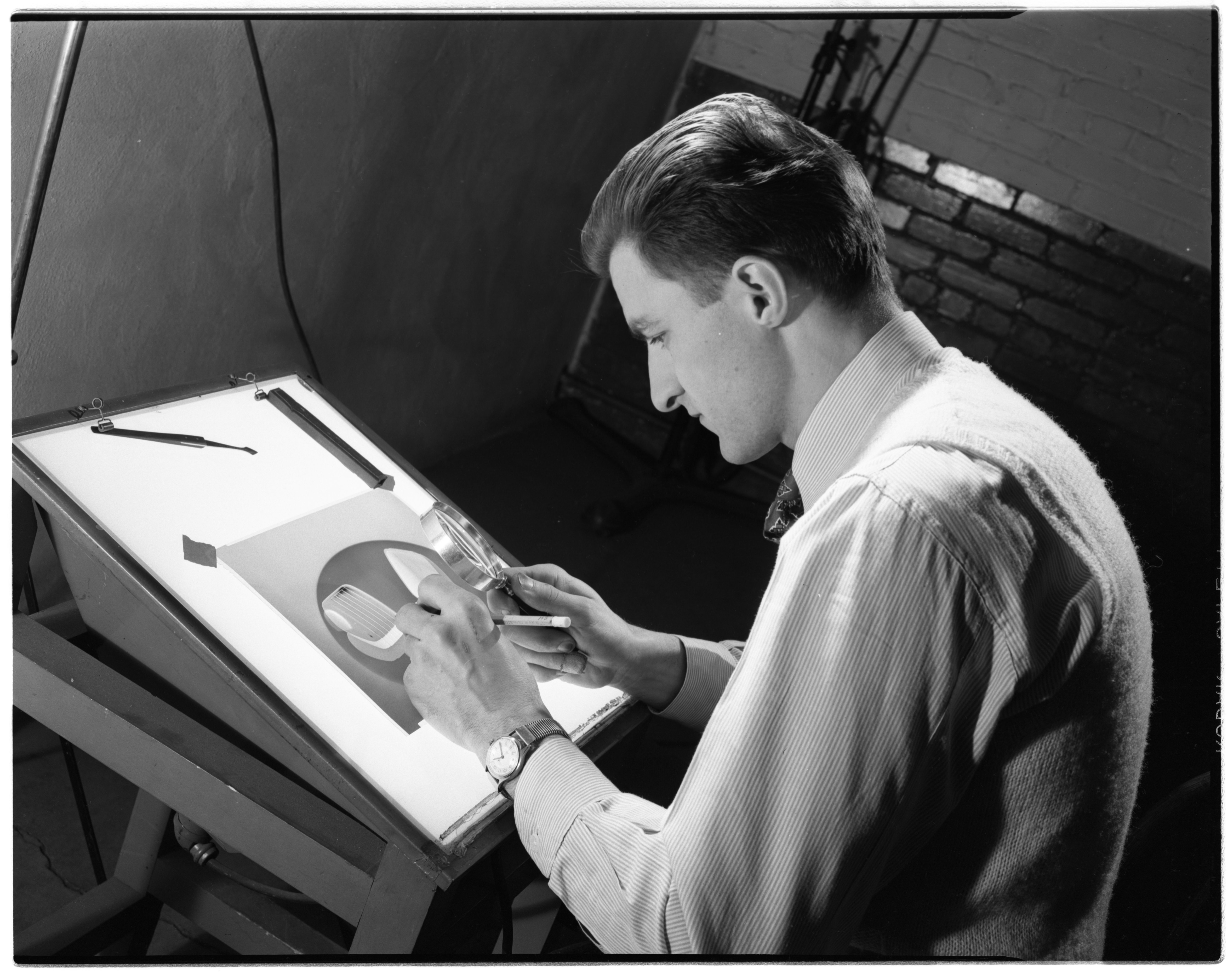 Dow Chemical Company. “Ford Bowers Retouching Negative in Dow Photographic Laboratory,” January 13, 1947. Dow Chemical Company Historical Image Collection, Box 3, Folder Places--Dow Photographic Dept. Science History Institute. Philadelphia. https://digital.sciencehistory.org/works/hm50ts048.