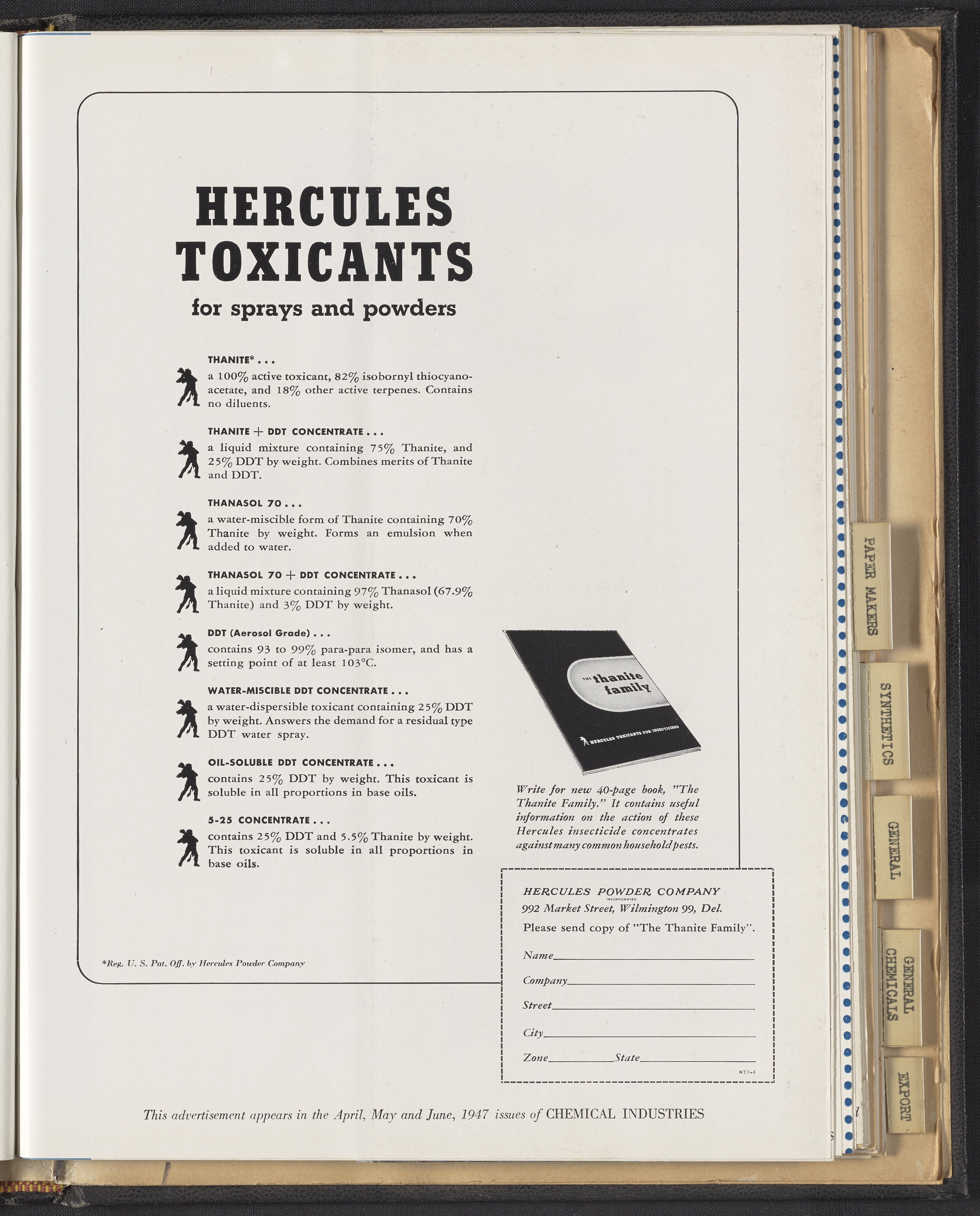 Hercules Incorporated. “Hercules Toxicants for Sprays and Powders.” 1947 Hercules Advertisements, 1947. Records of Hercules Incorporated, Volume 1947. Science History Institute. Philadelphia. https://digital.sciencehistory.org/works/hm50ts39c.